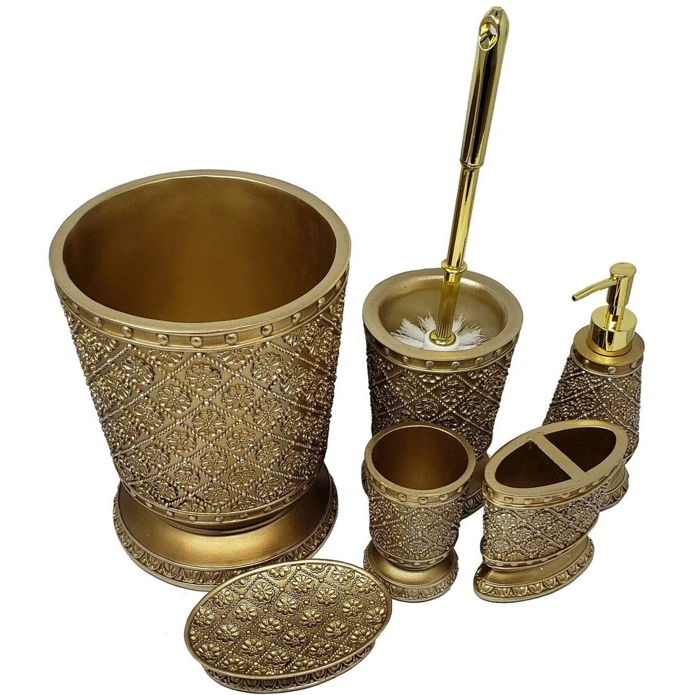 Golden Flower Bathroom Accessories Set, 6 Pcs Wooden Gift Set