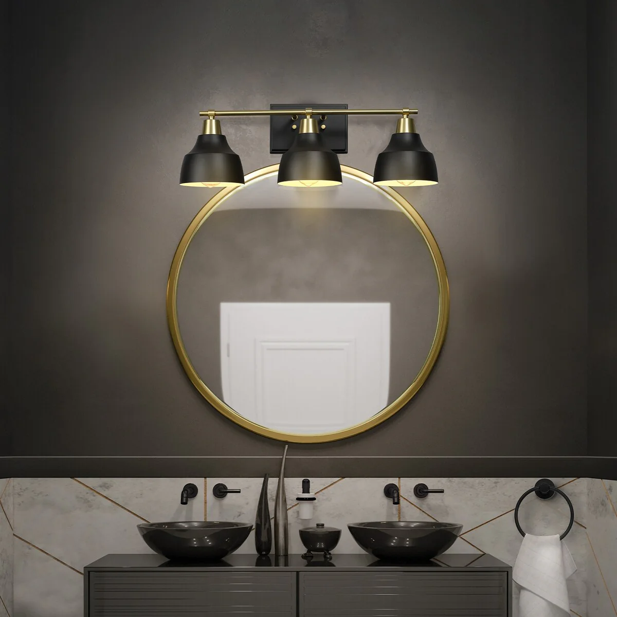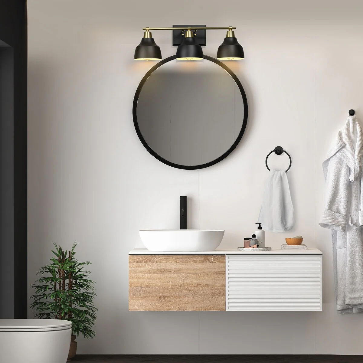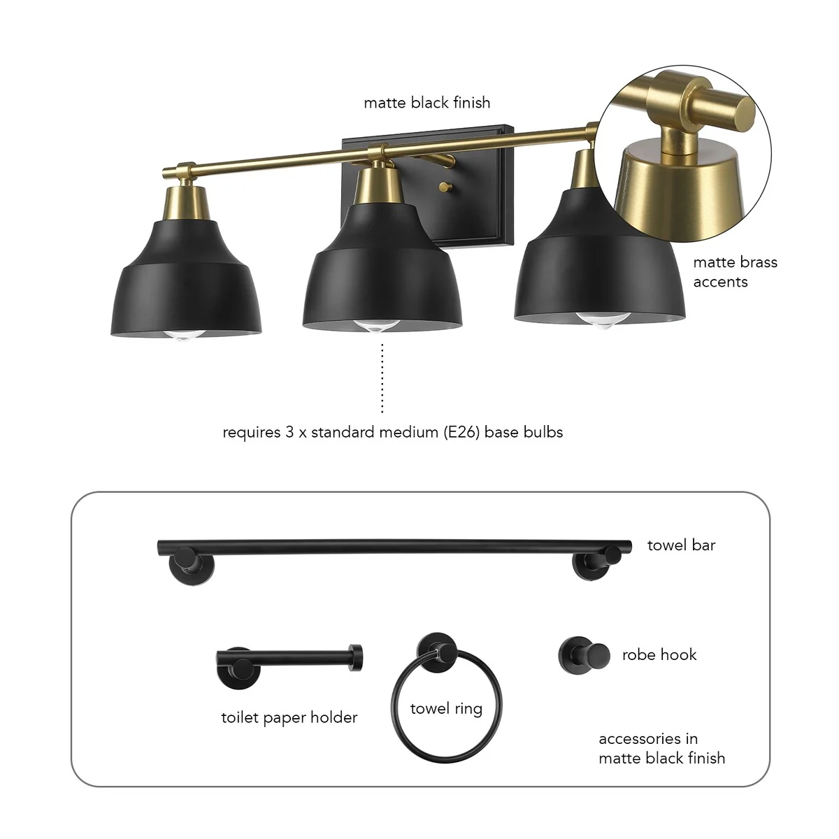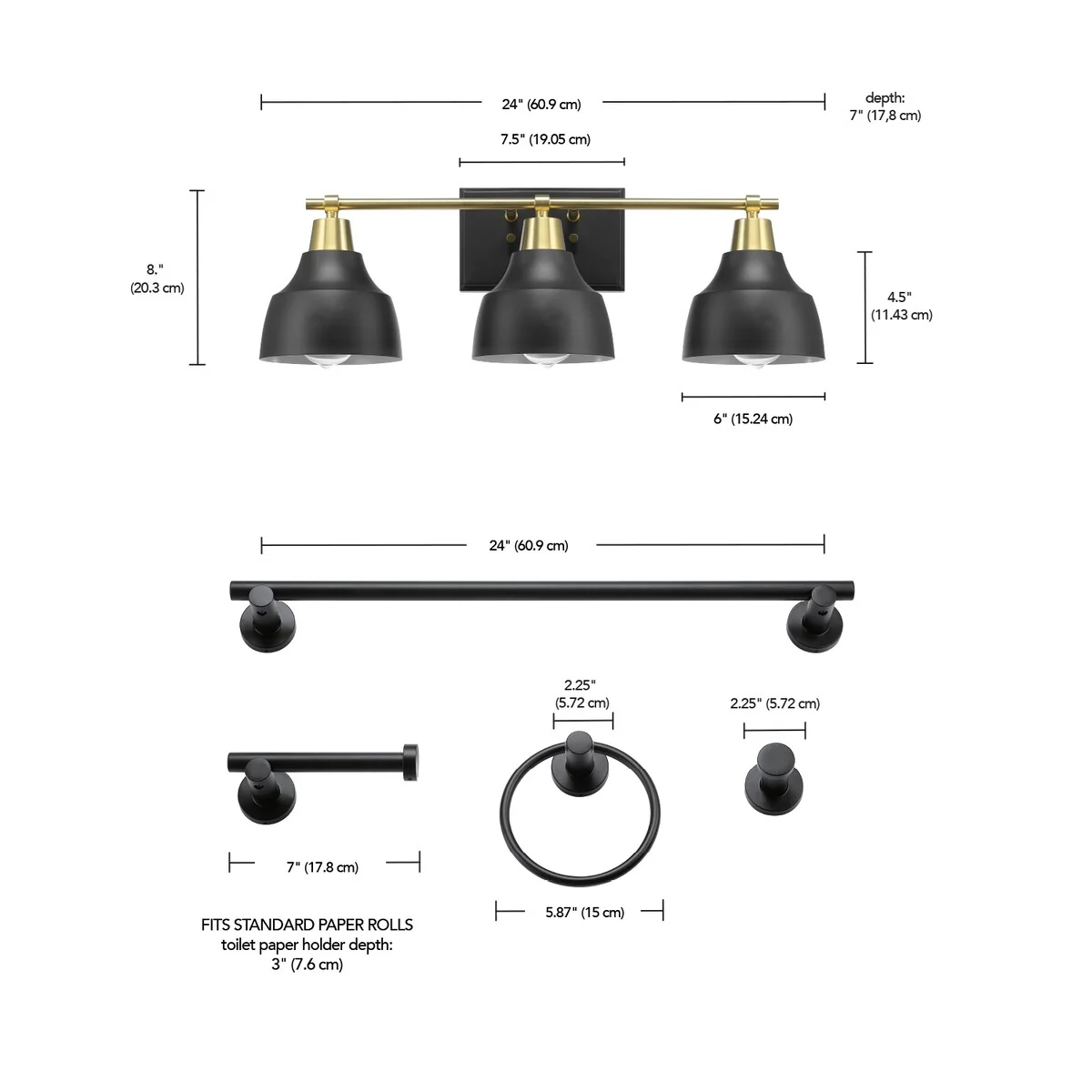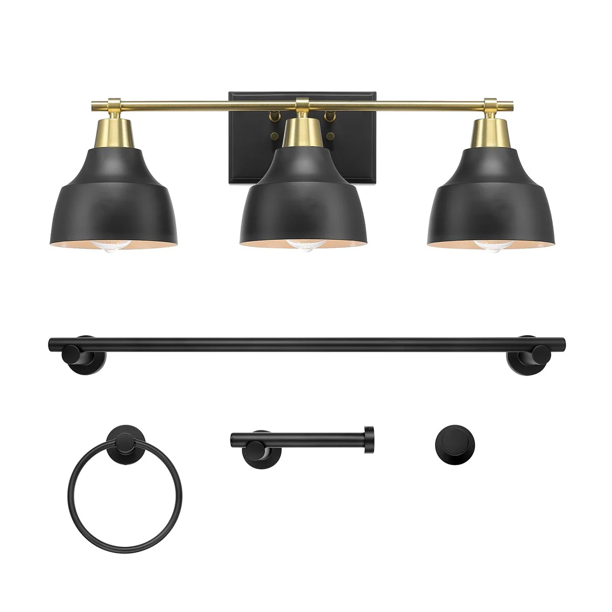 5-Piece All-In-One Matte Black Bathroom Accessory Set with 24" 3-Light Vanity Light and Matte Brass Accents - 7"