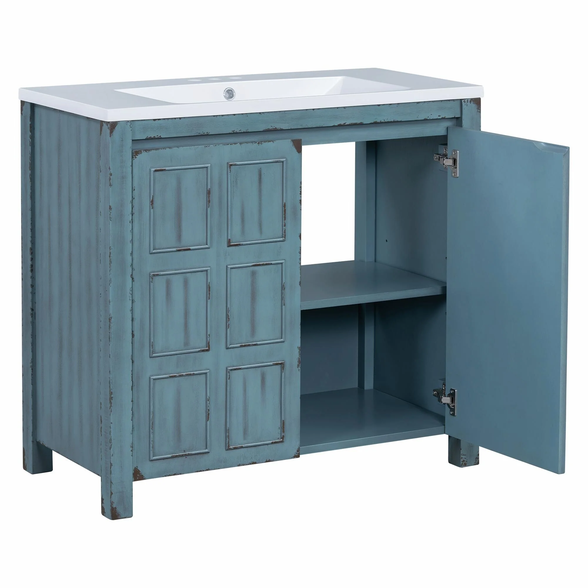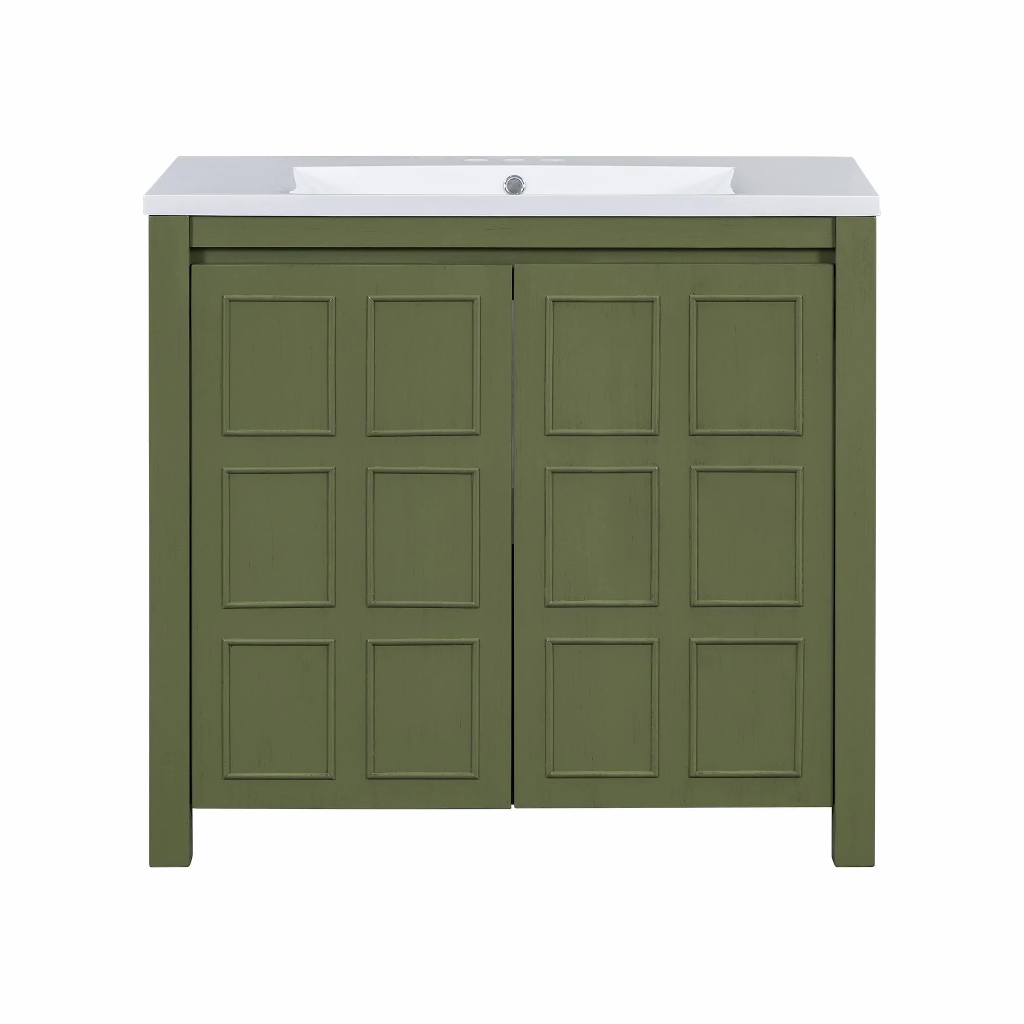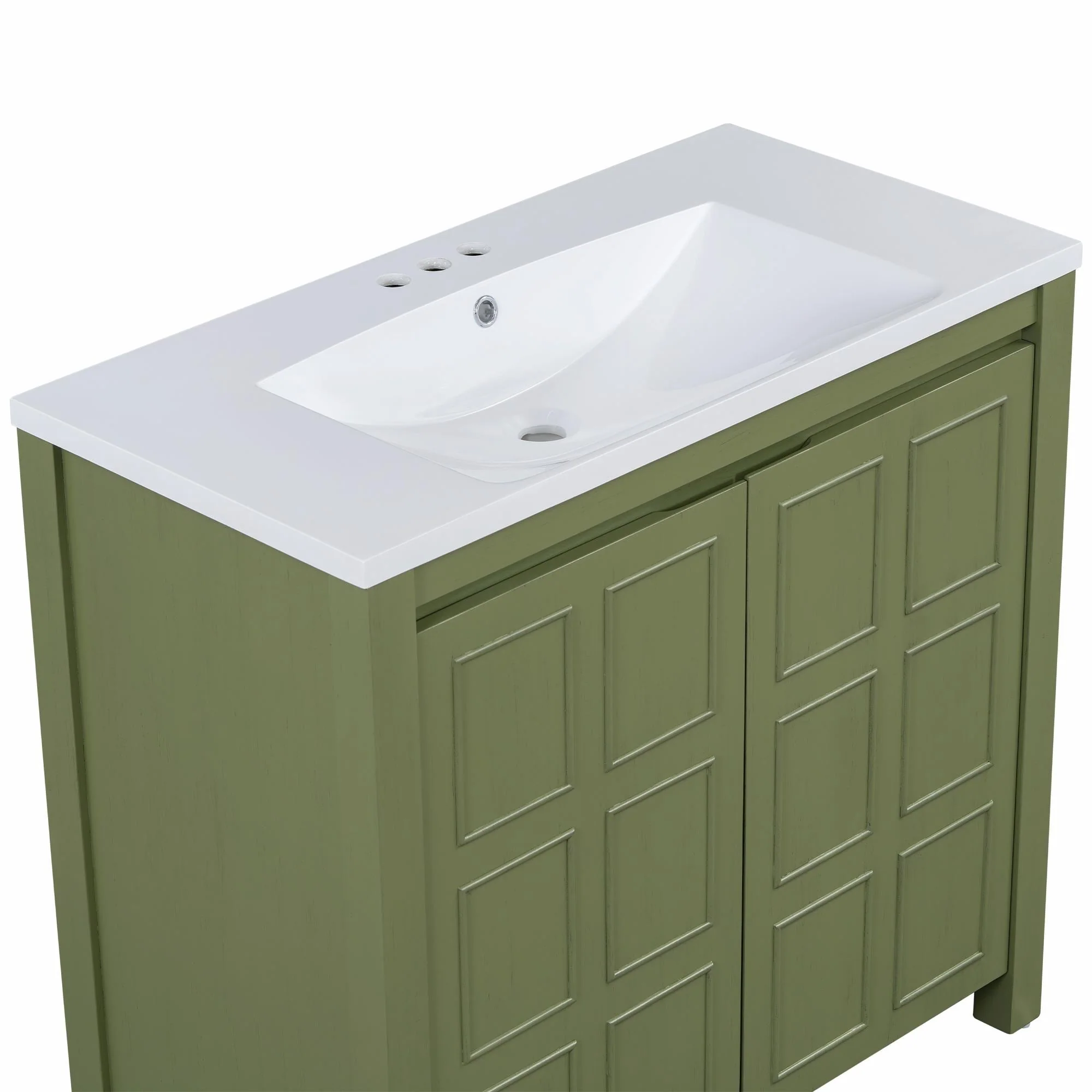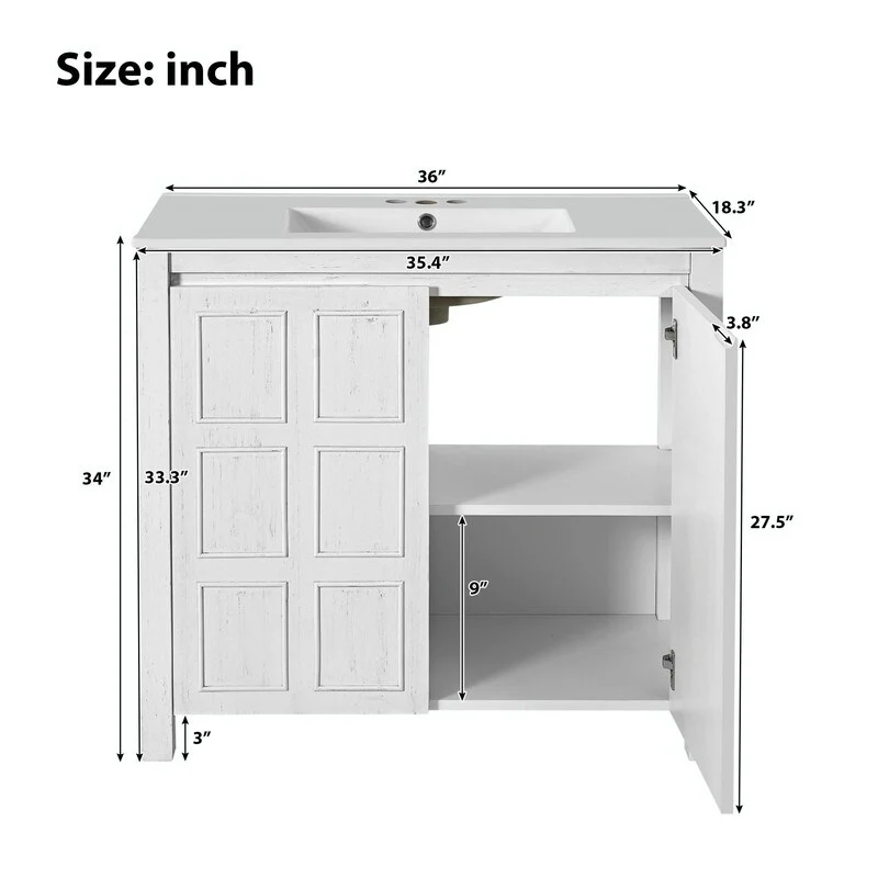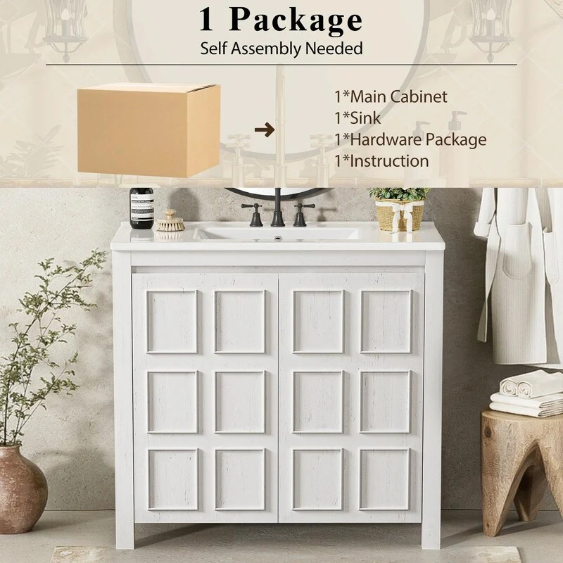 36 Inch Freestanding Bathroom Vanity with Ceramic Sink, Tip-Out & Storage Drawers, Soft Close Door Hinges