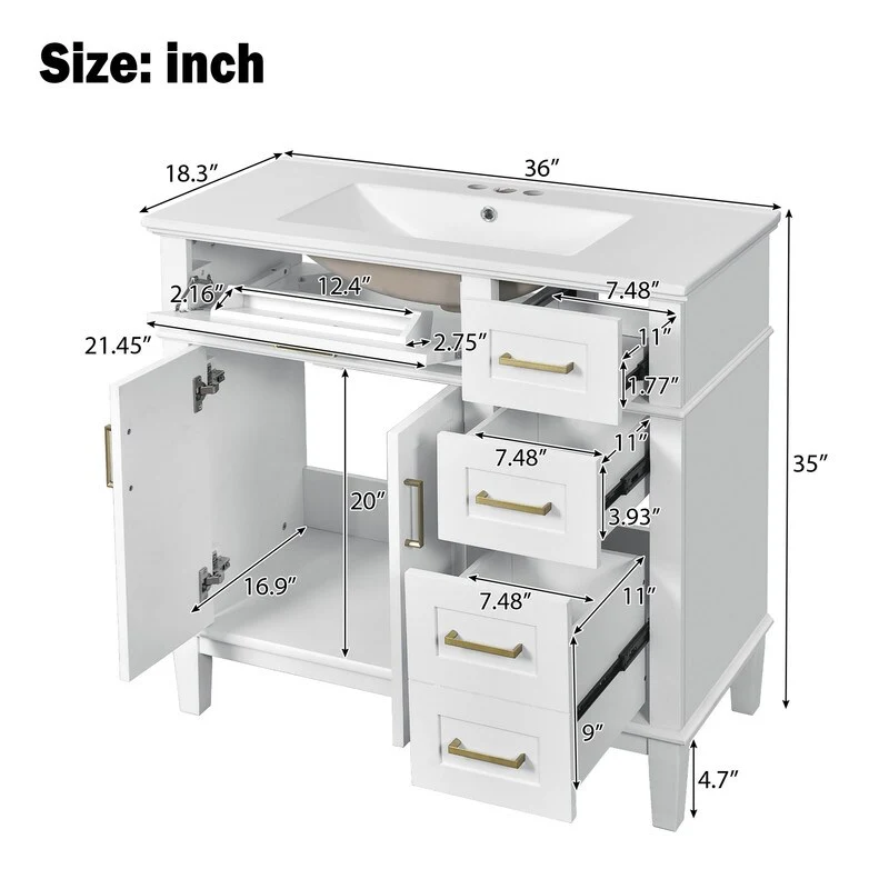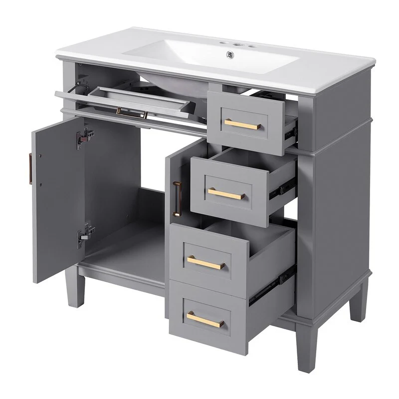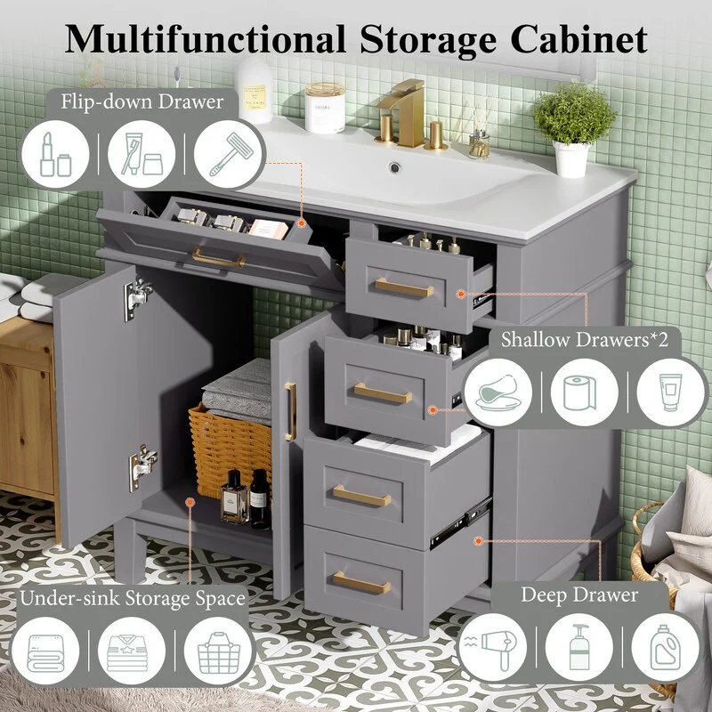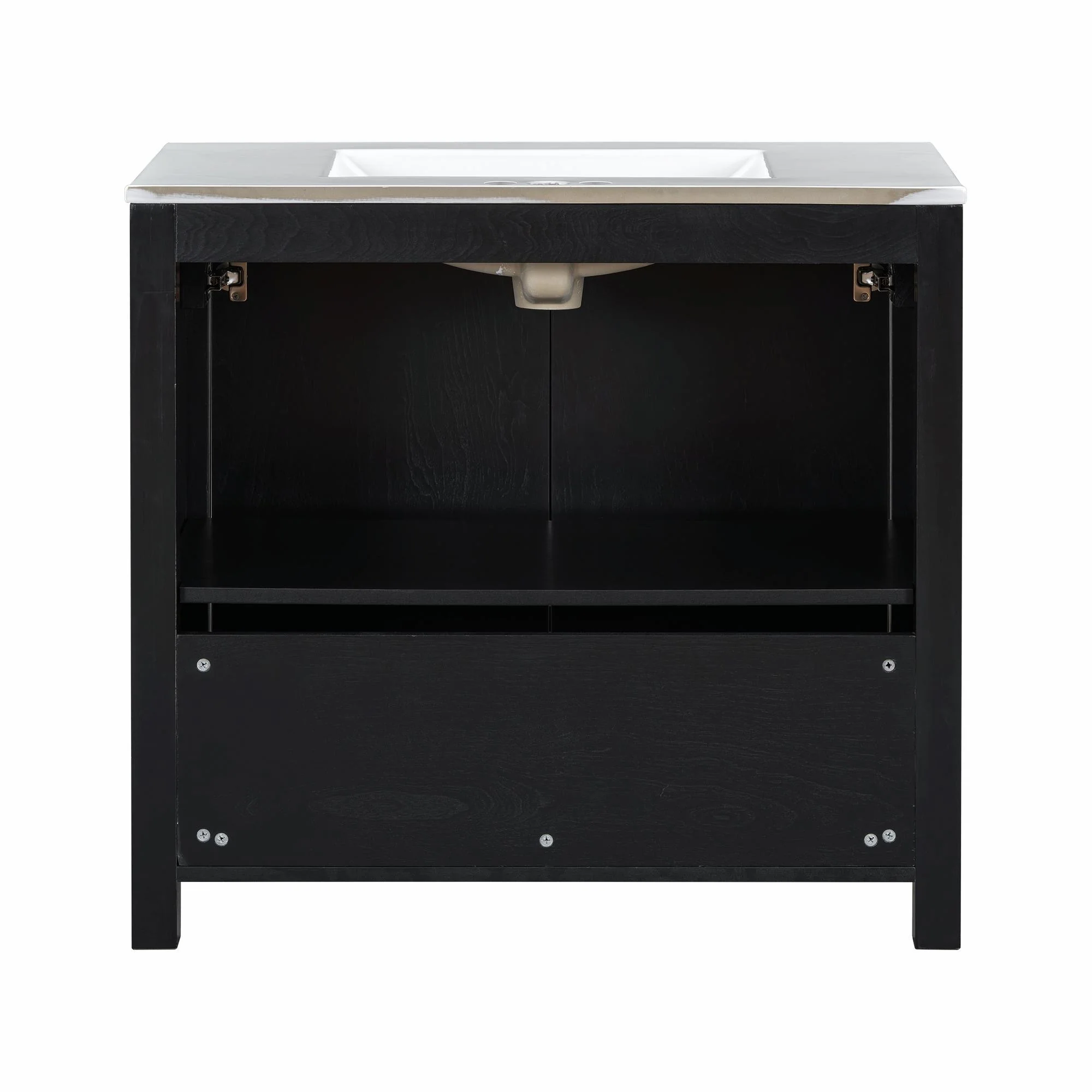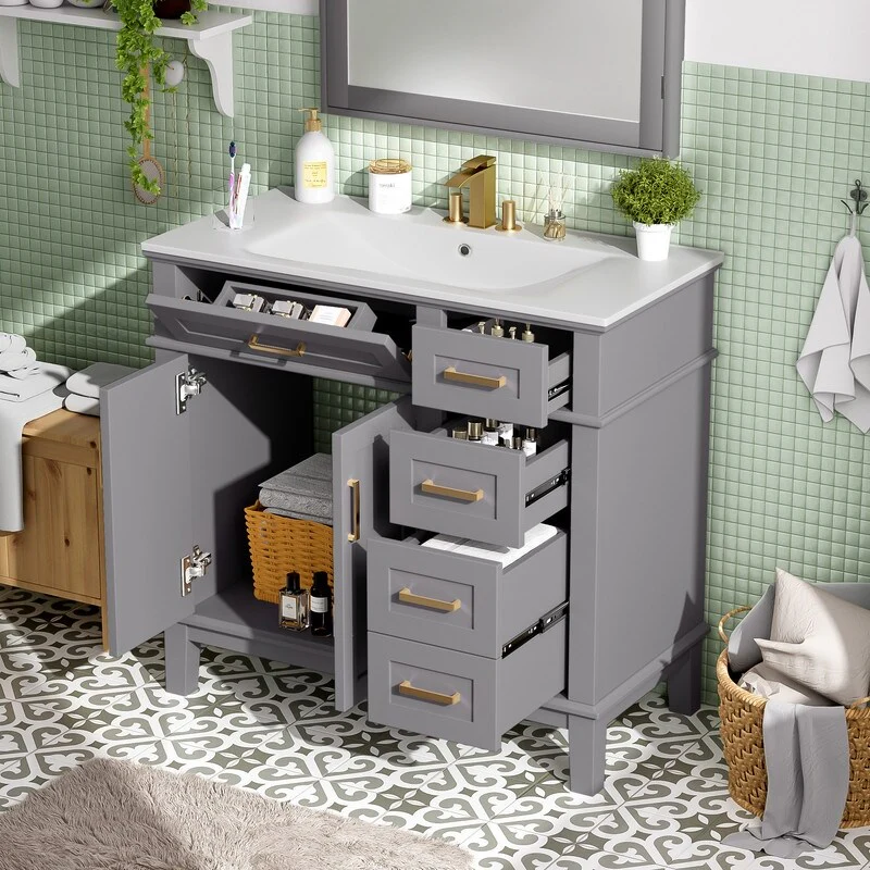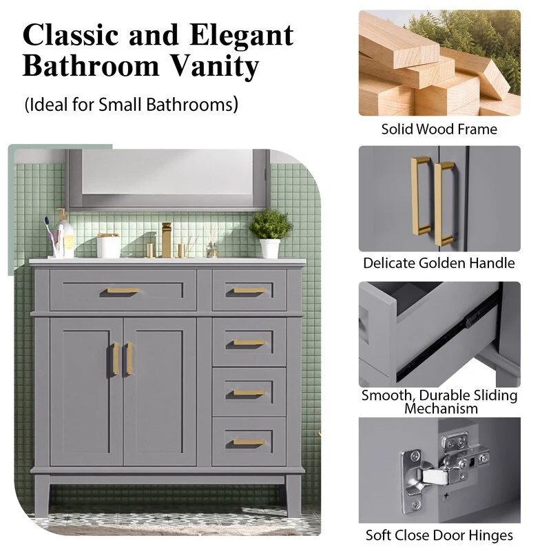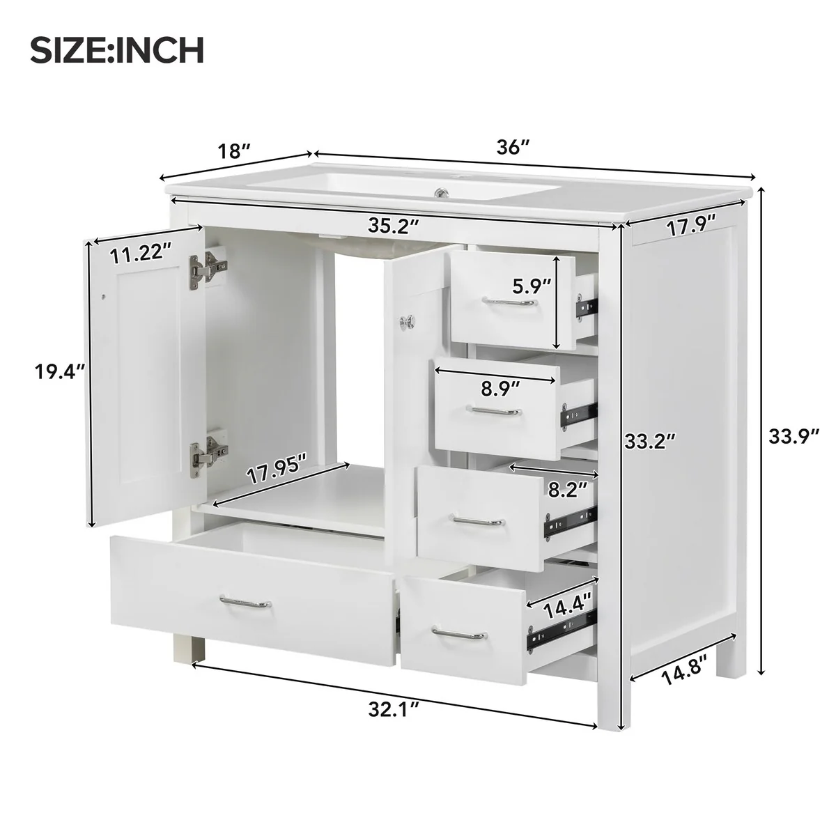 36" Bathroom Vanity with Ceramic Sink, Soft Close Doors, 4 Drawers