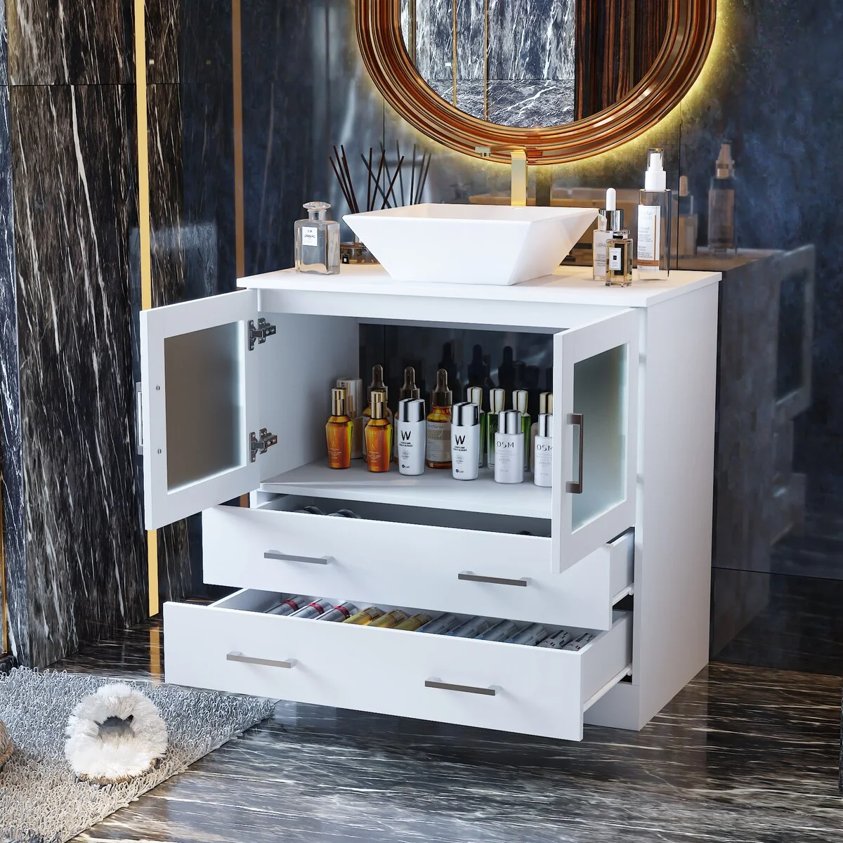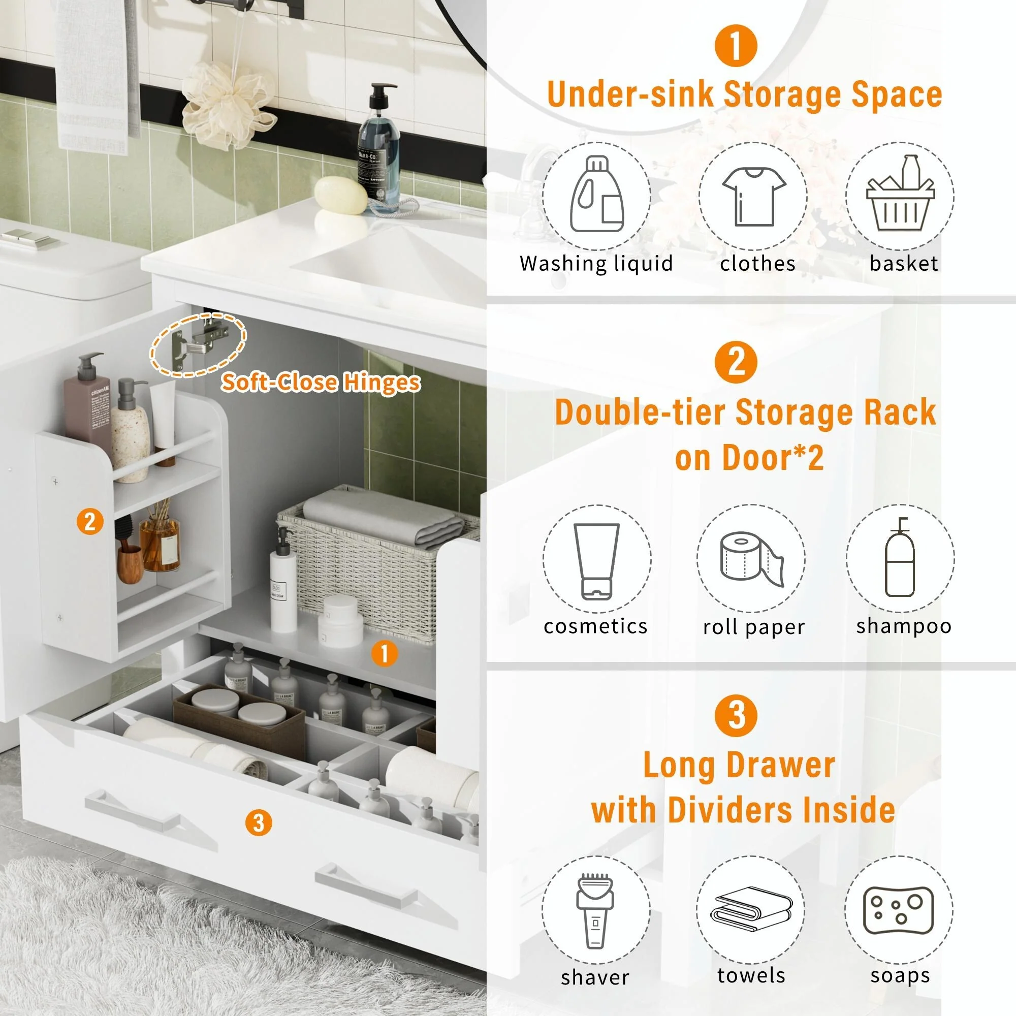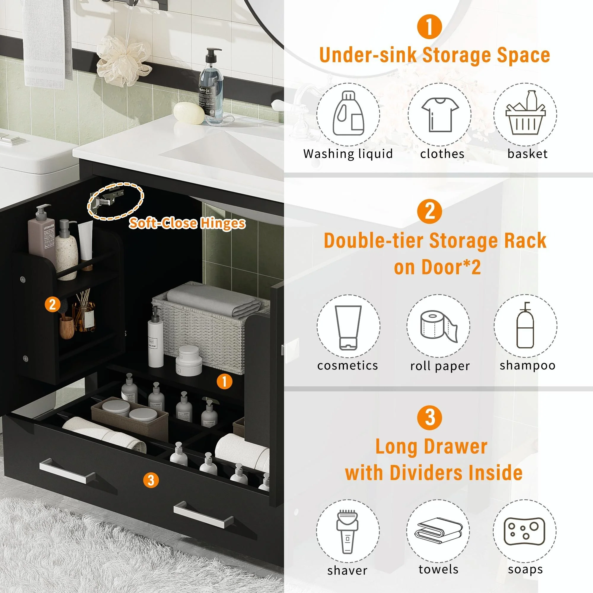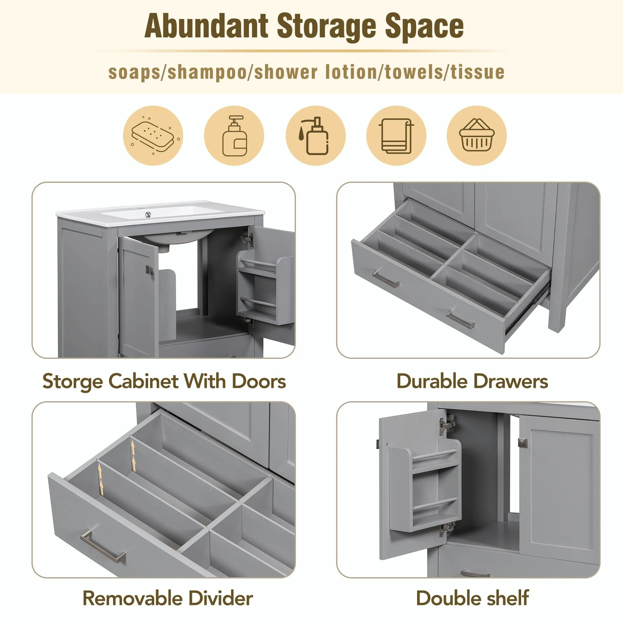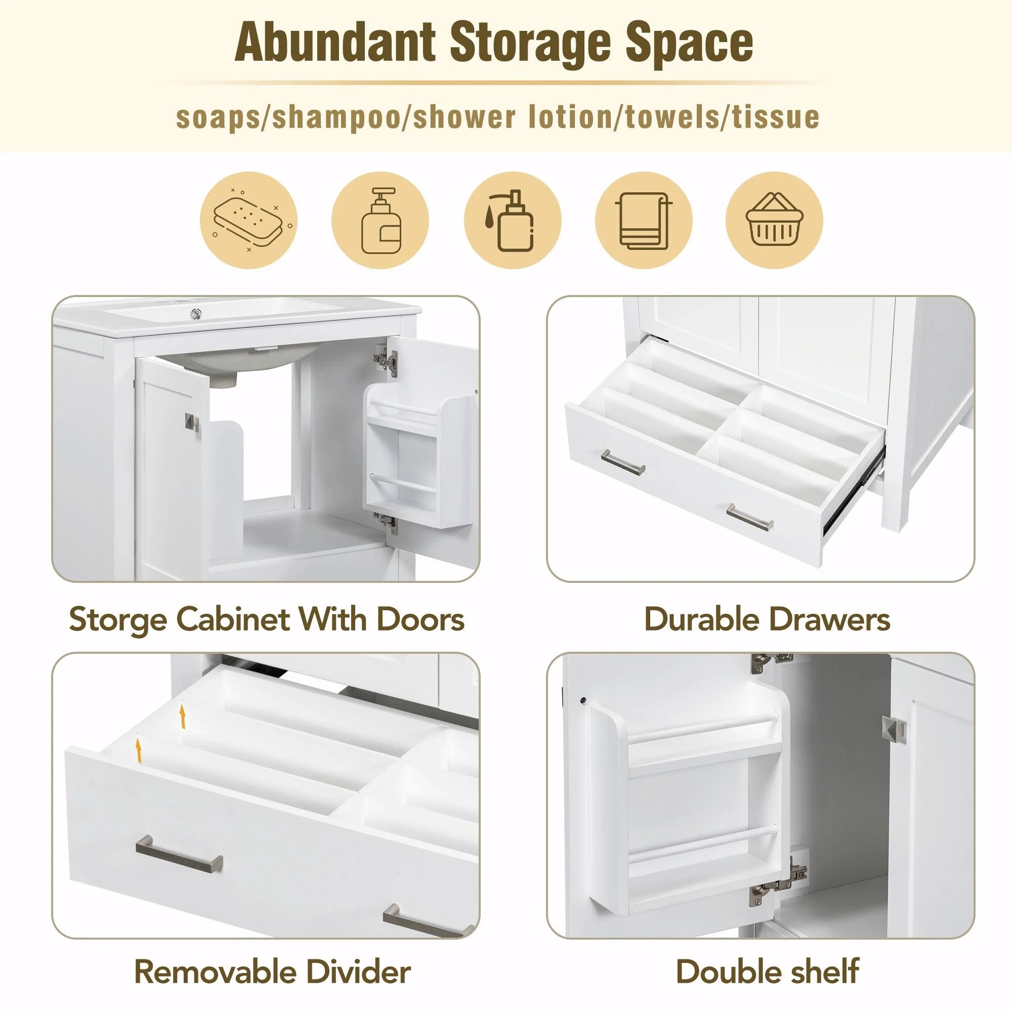 Bathroom Vanity with 2 Soft-close Doors and Double-tier Deep Drawer