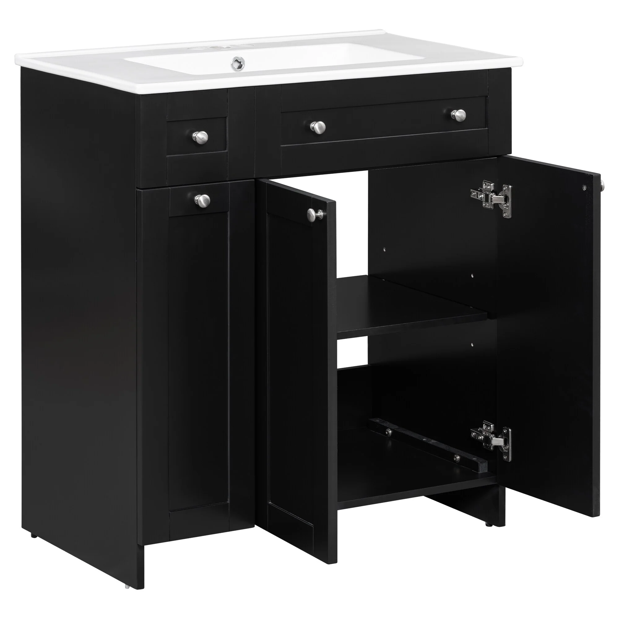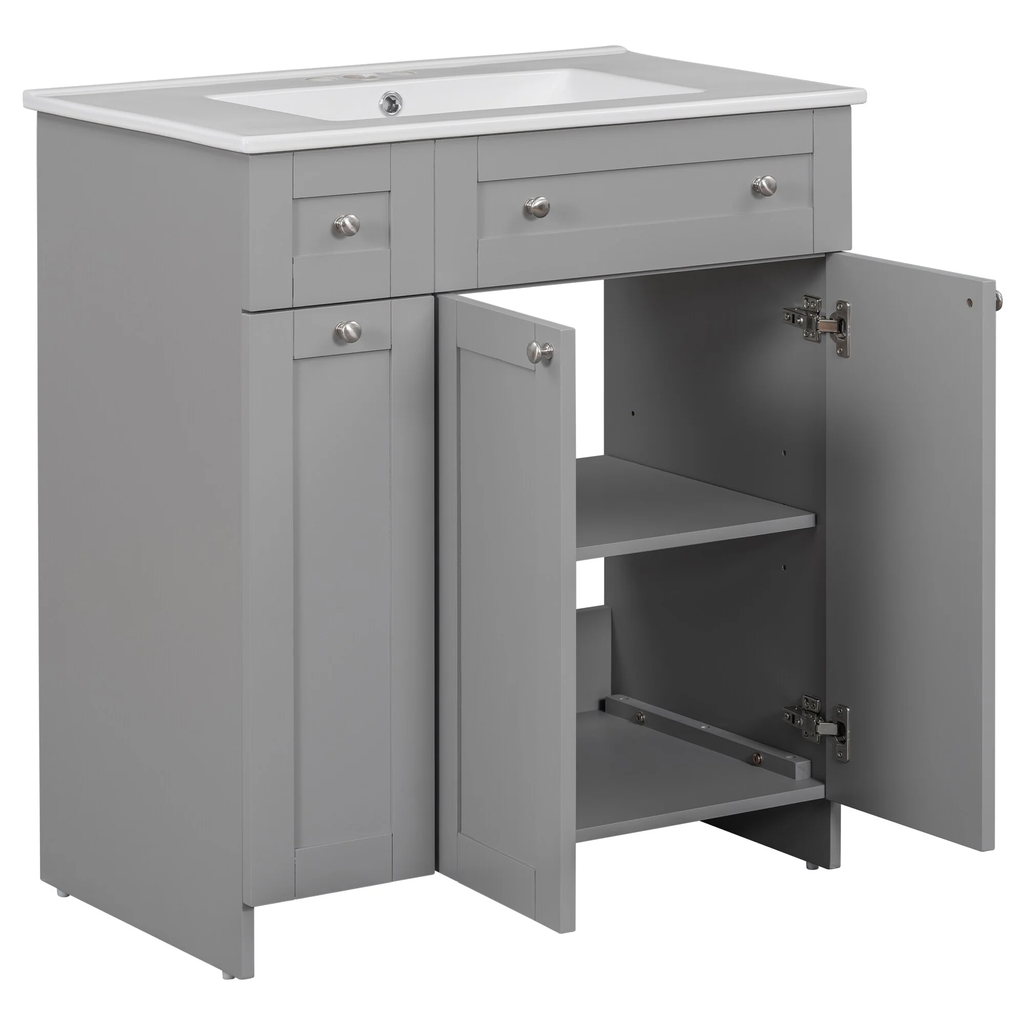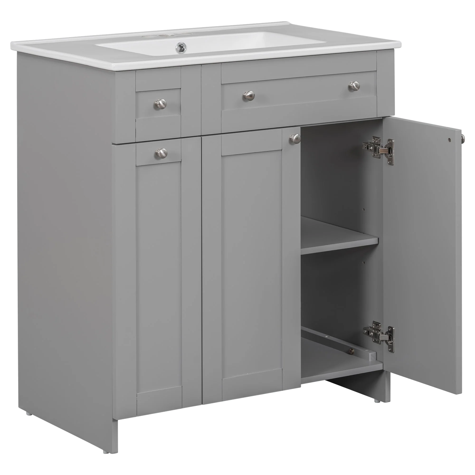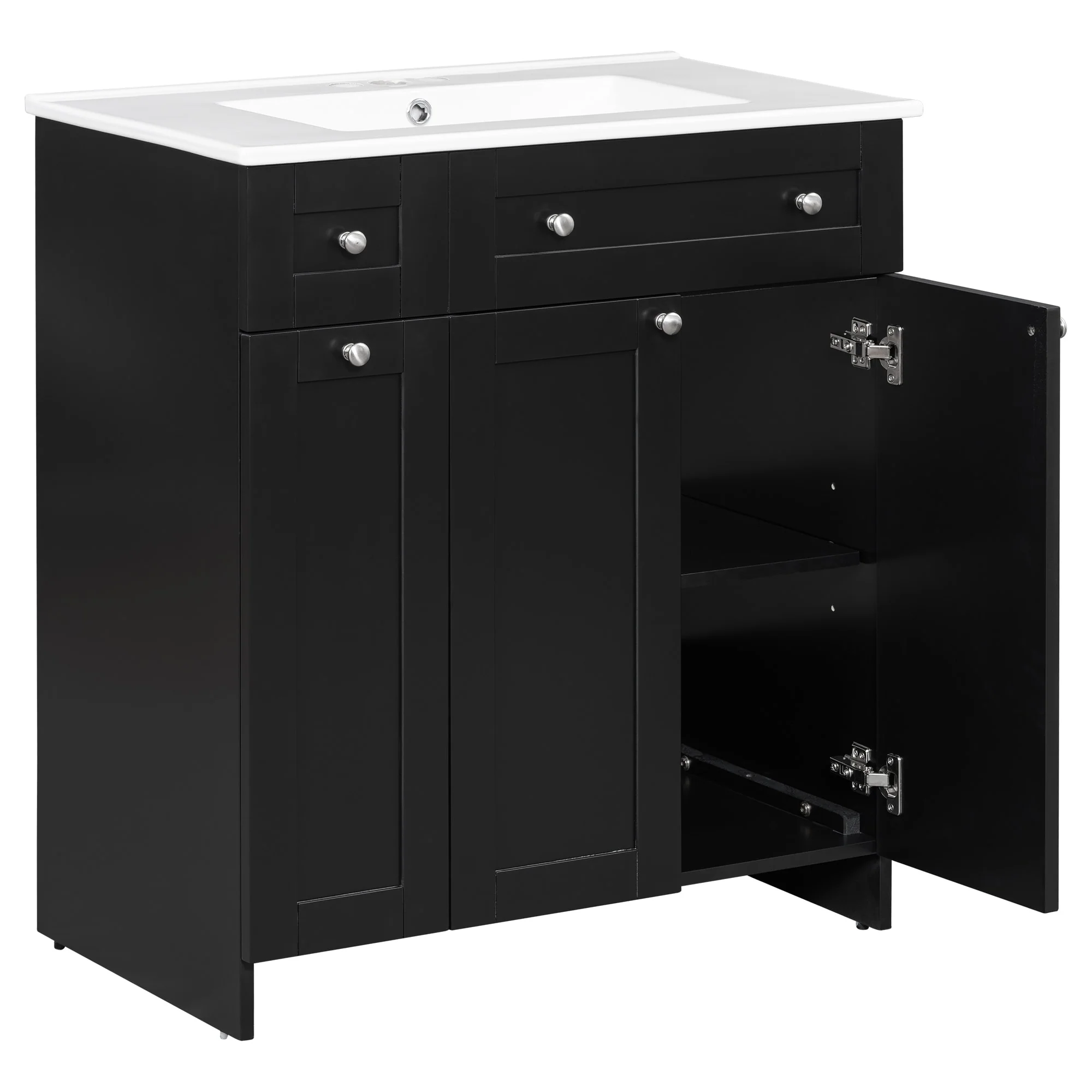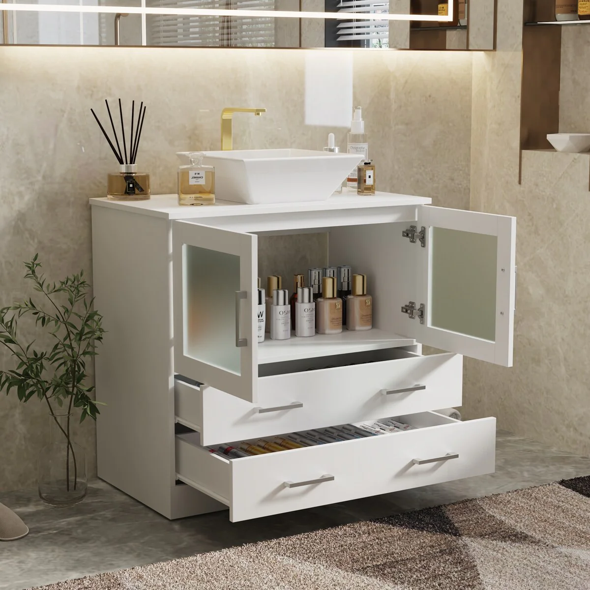 36"/30" Bathroom Vanity with Ceramic Sink, Soft-Close Doors, Double Storage Shelves & Divided Drawer