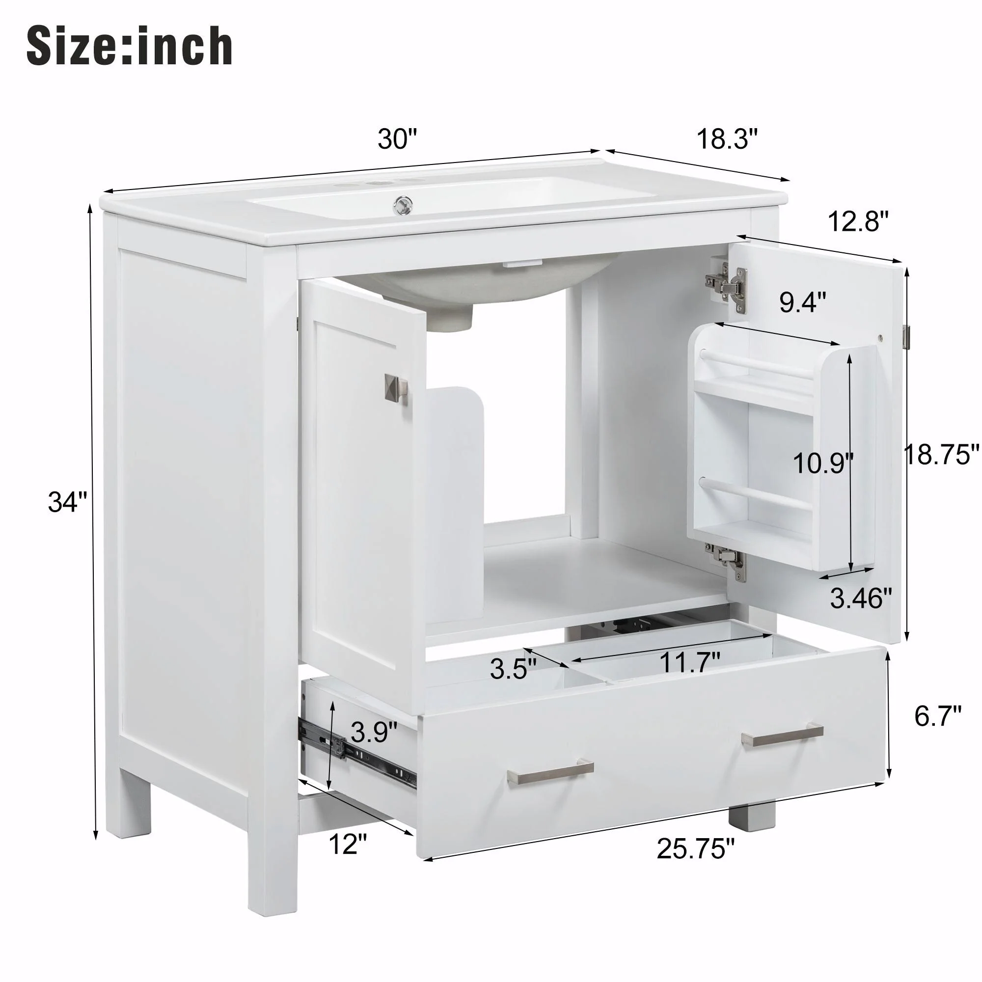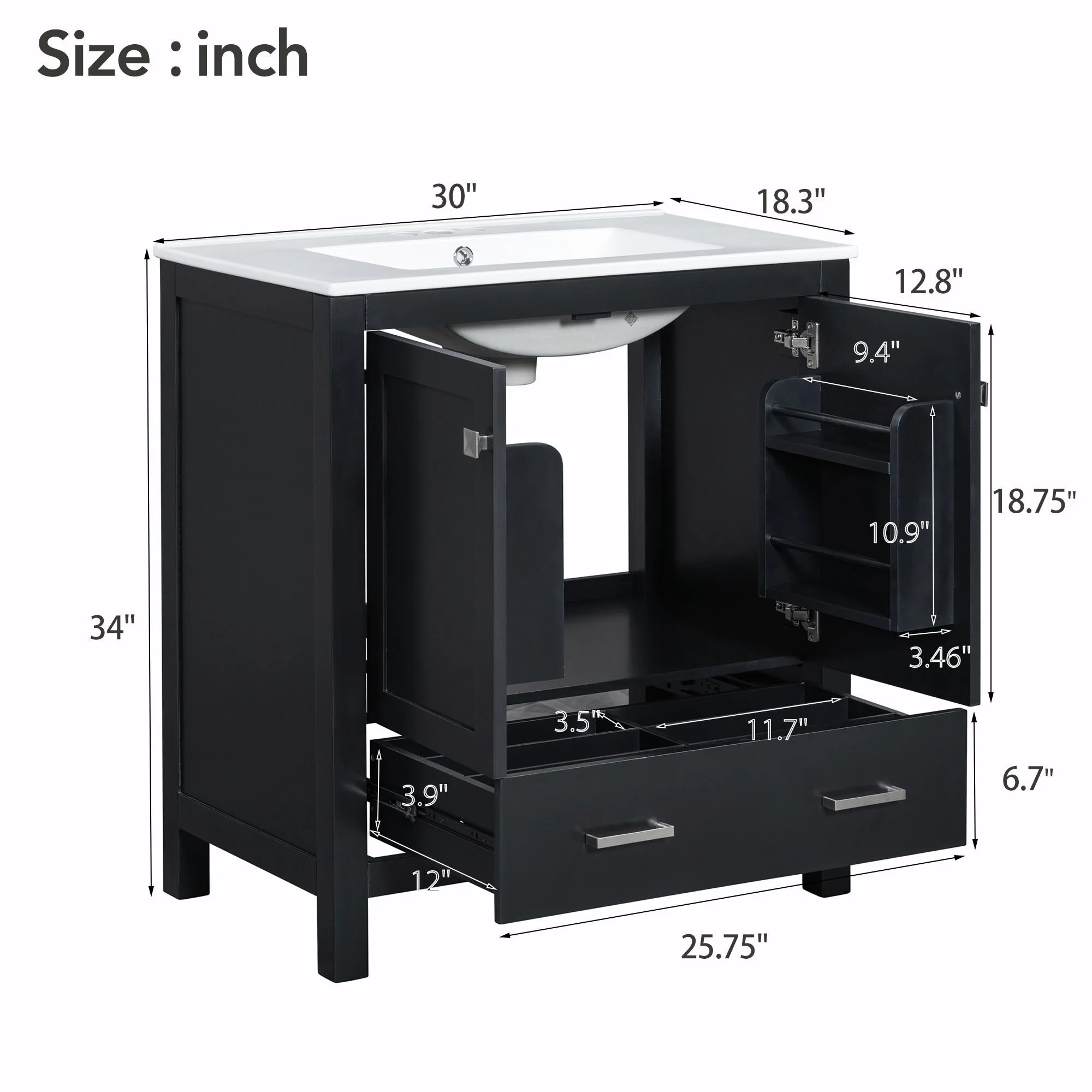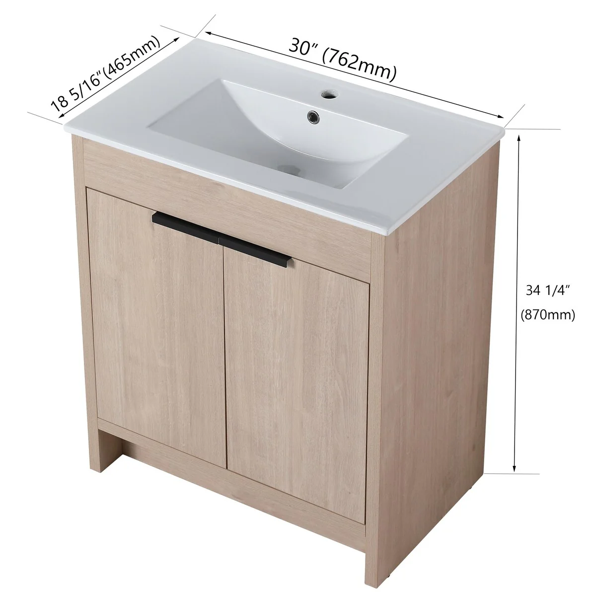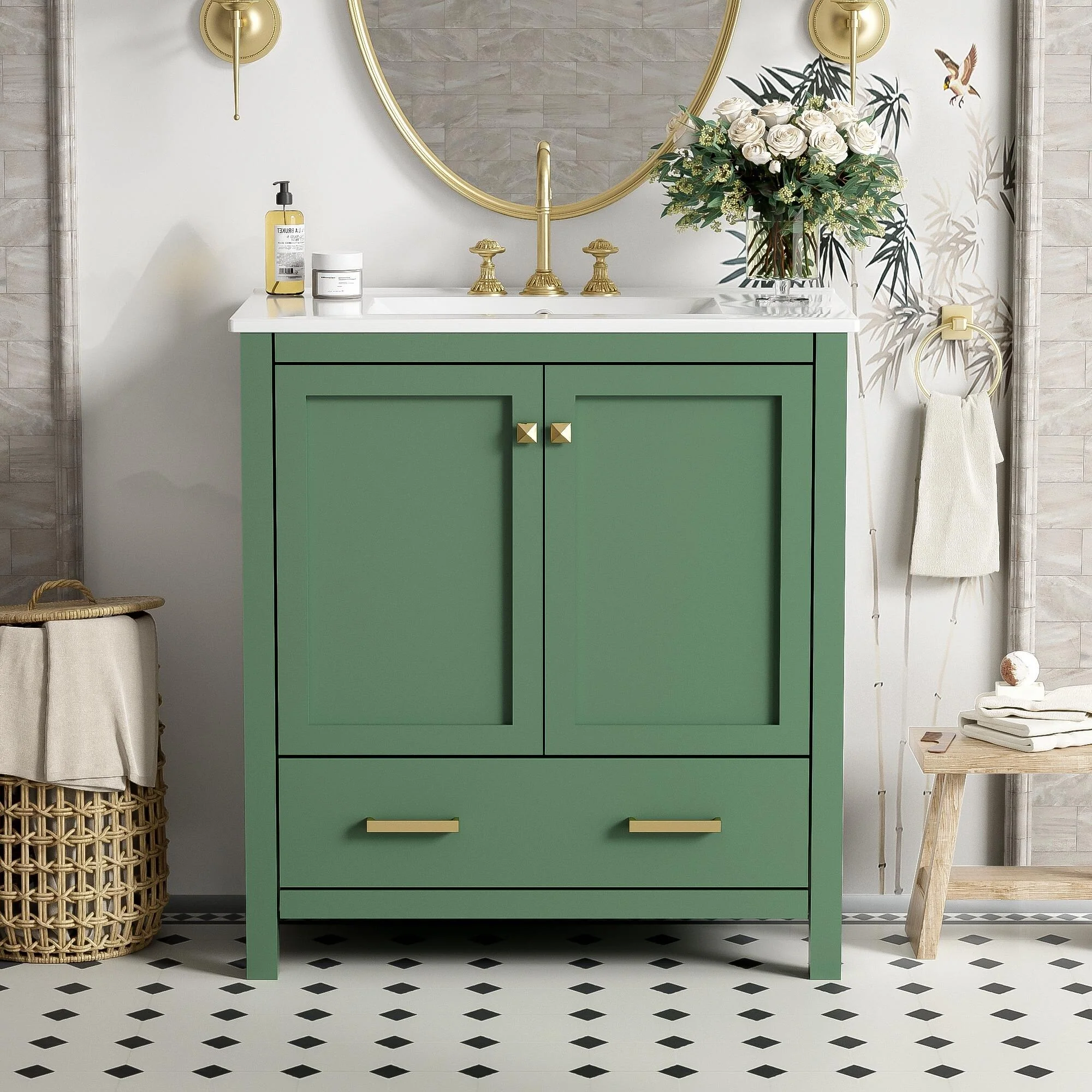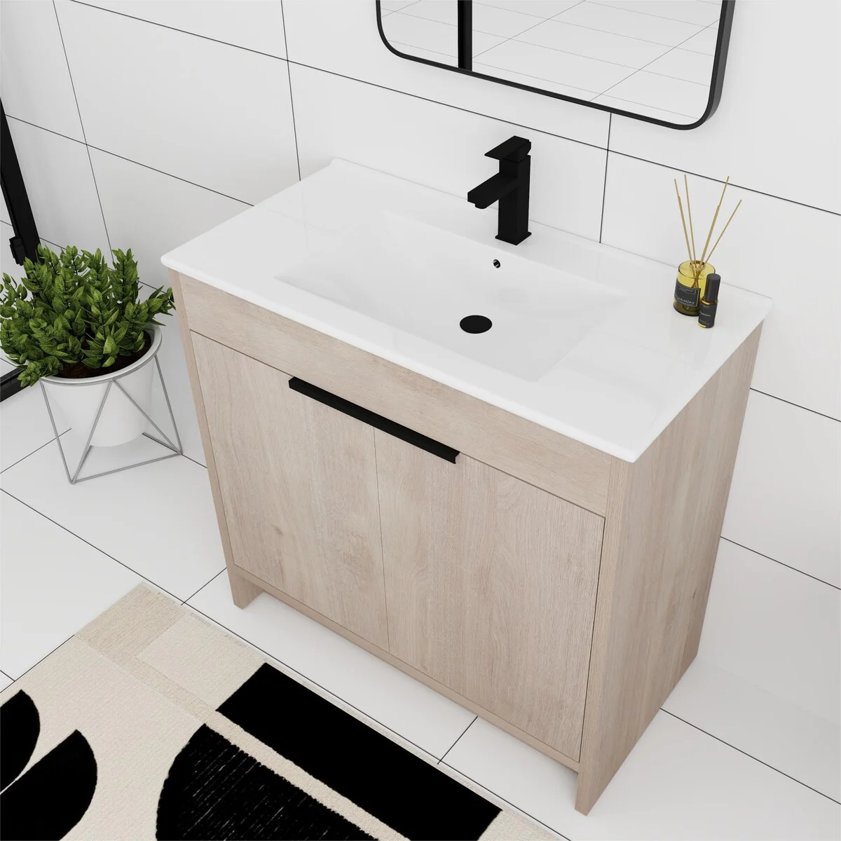 36"/30" Bathroom Vanity with Ceramic Sink, Soft-Close Doors, Double Storage Shelves & Divided Drawer