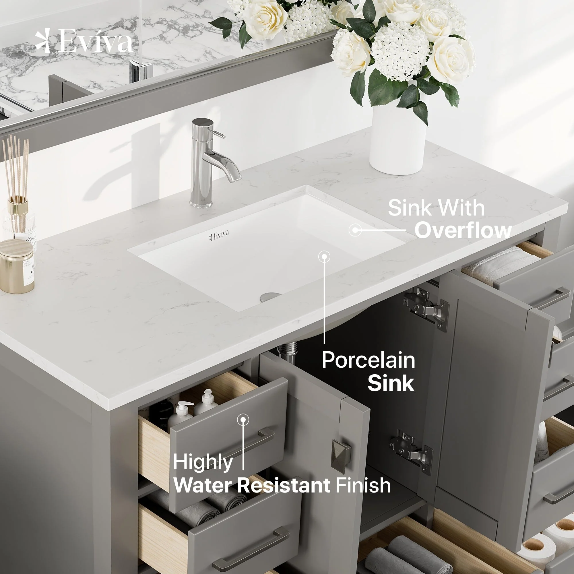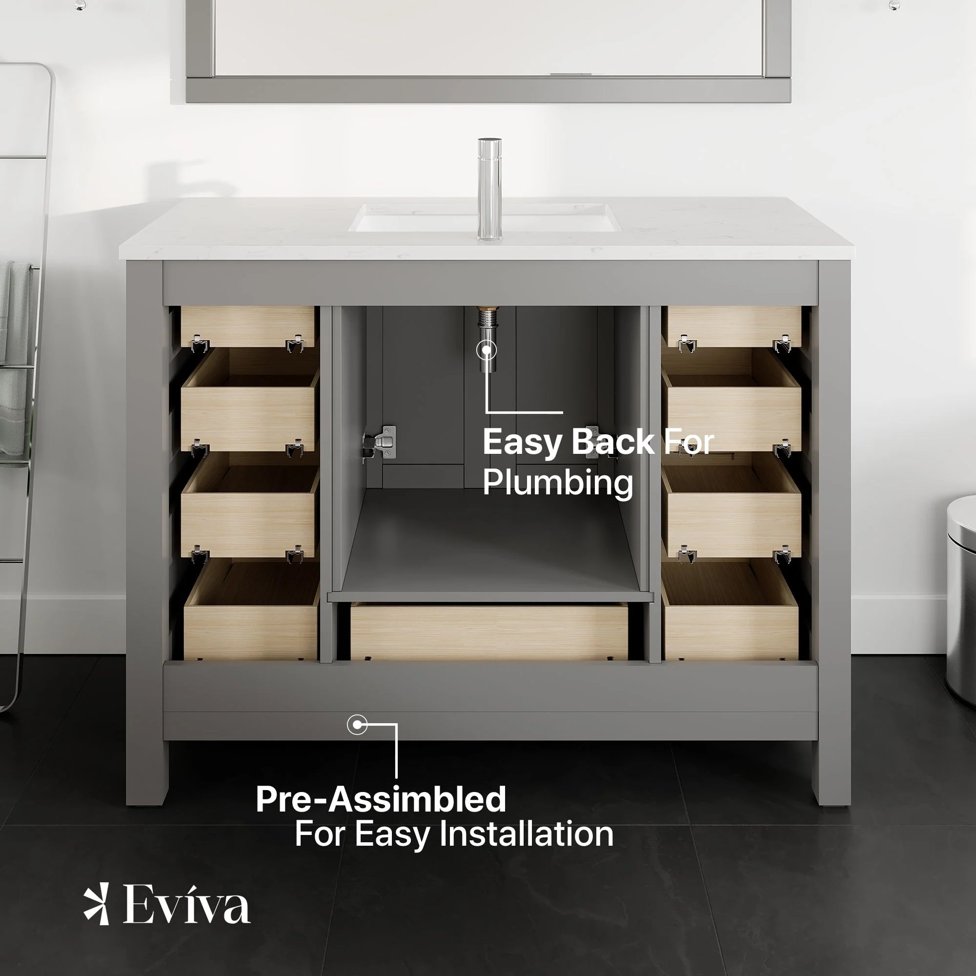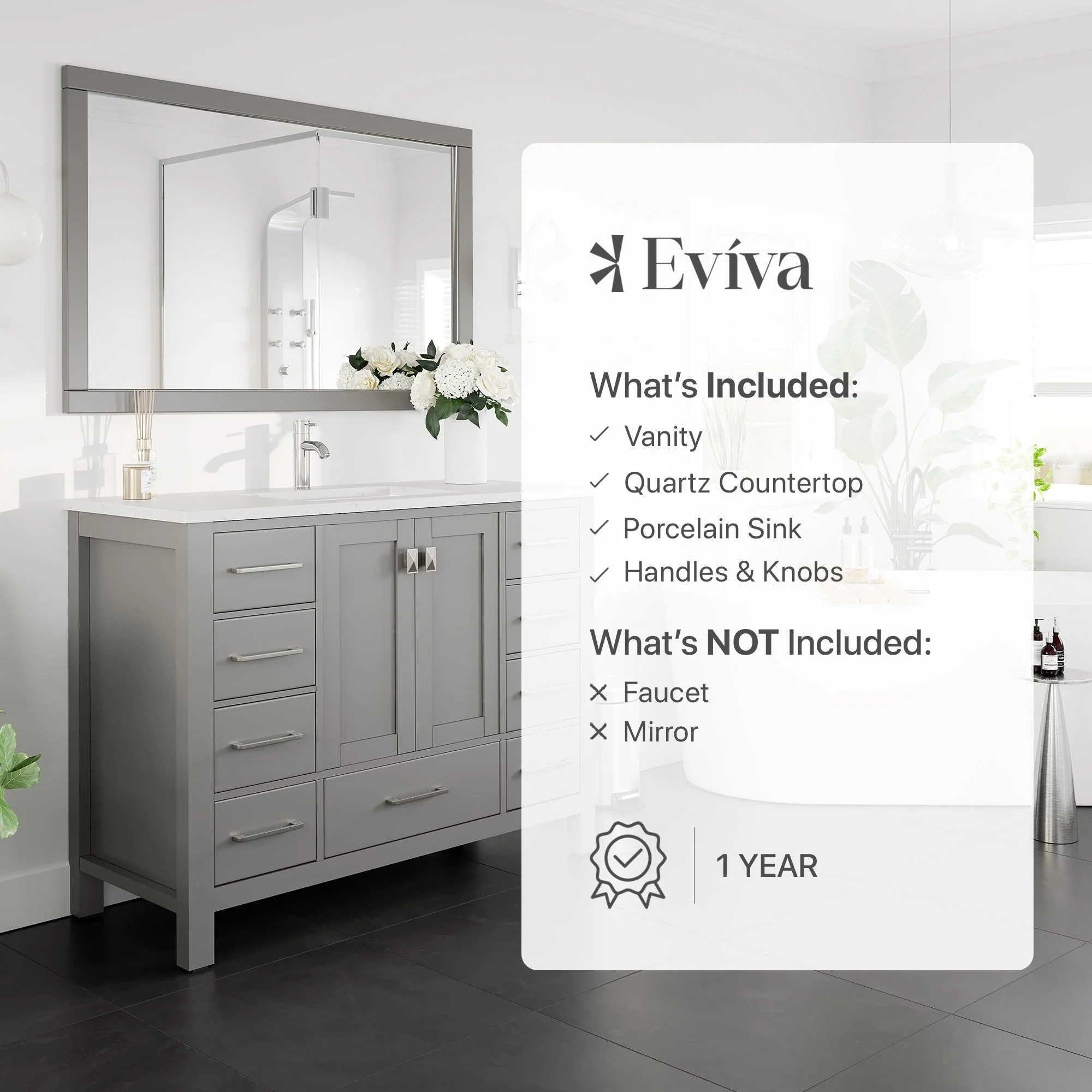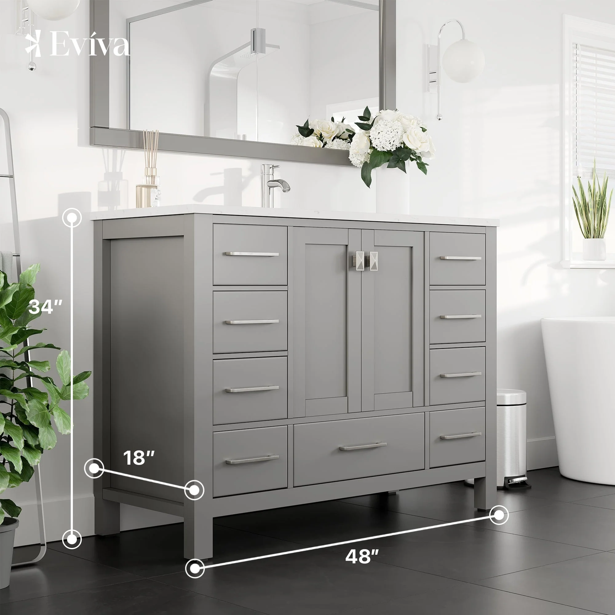 Eviva London 48"W x 18"D Gray Bathroom Vanity with Carrara Quartz Countertop and Undermount Porcelain Sink