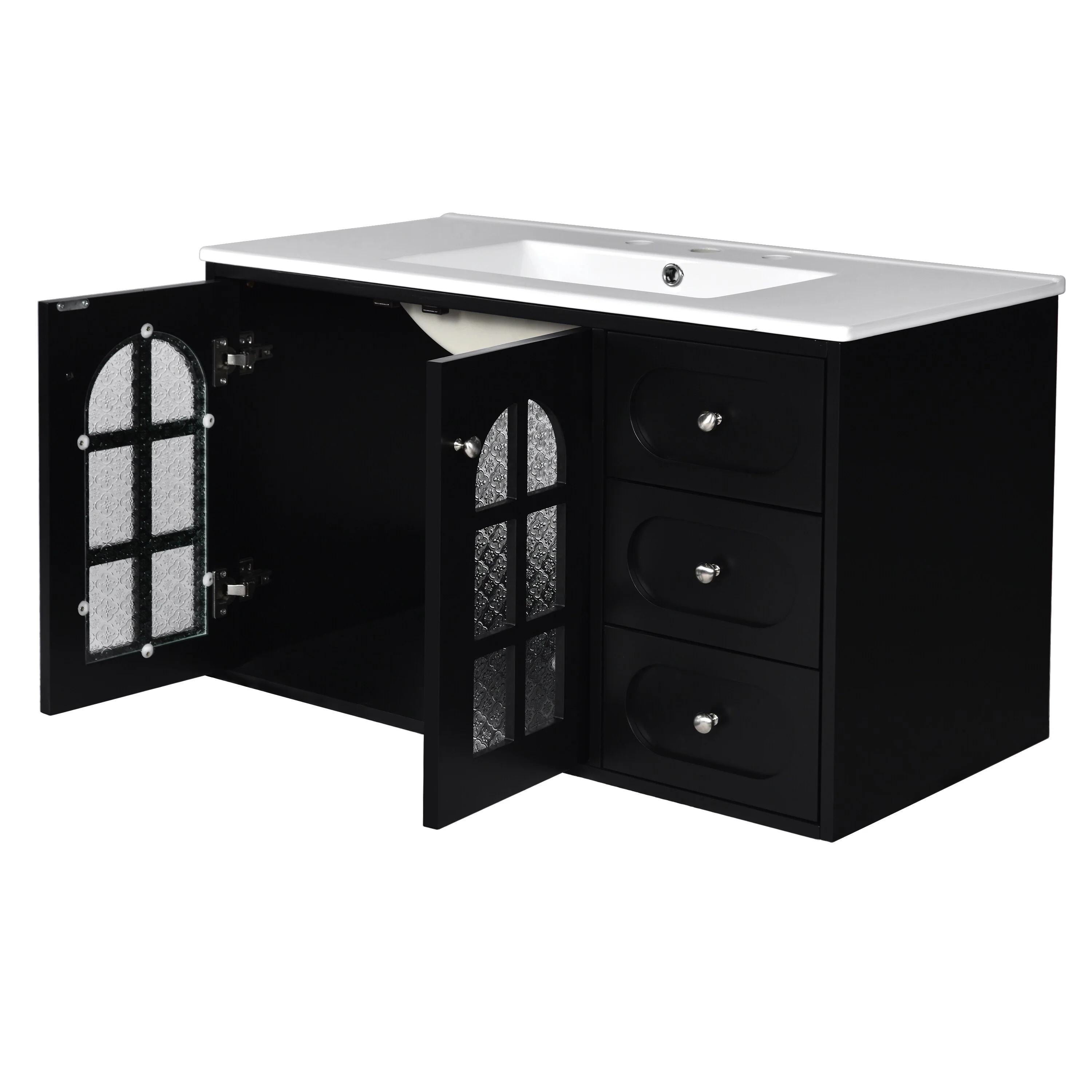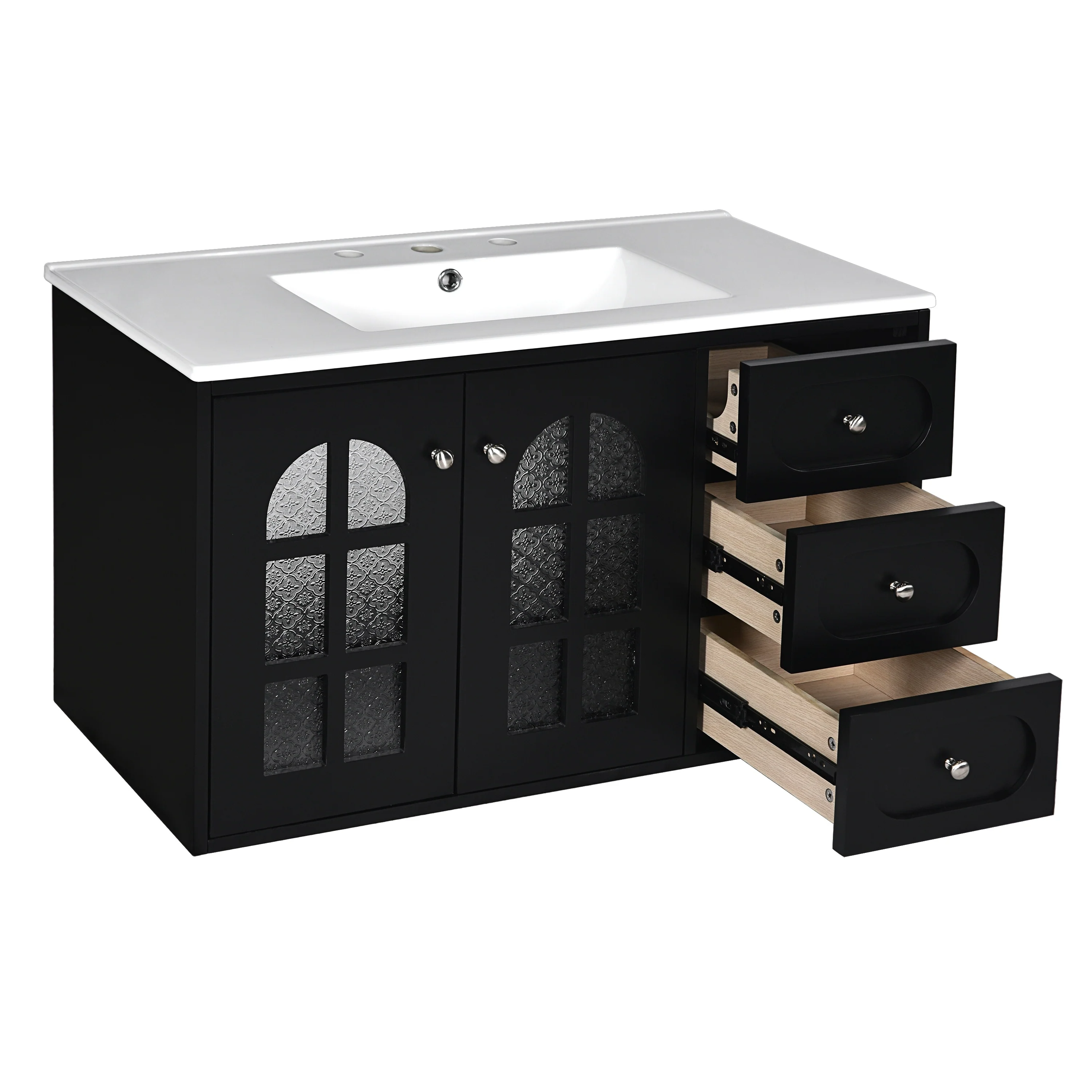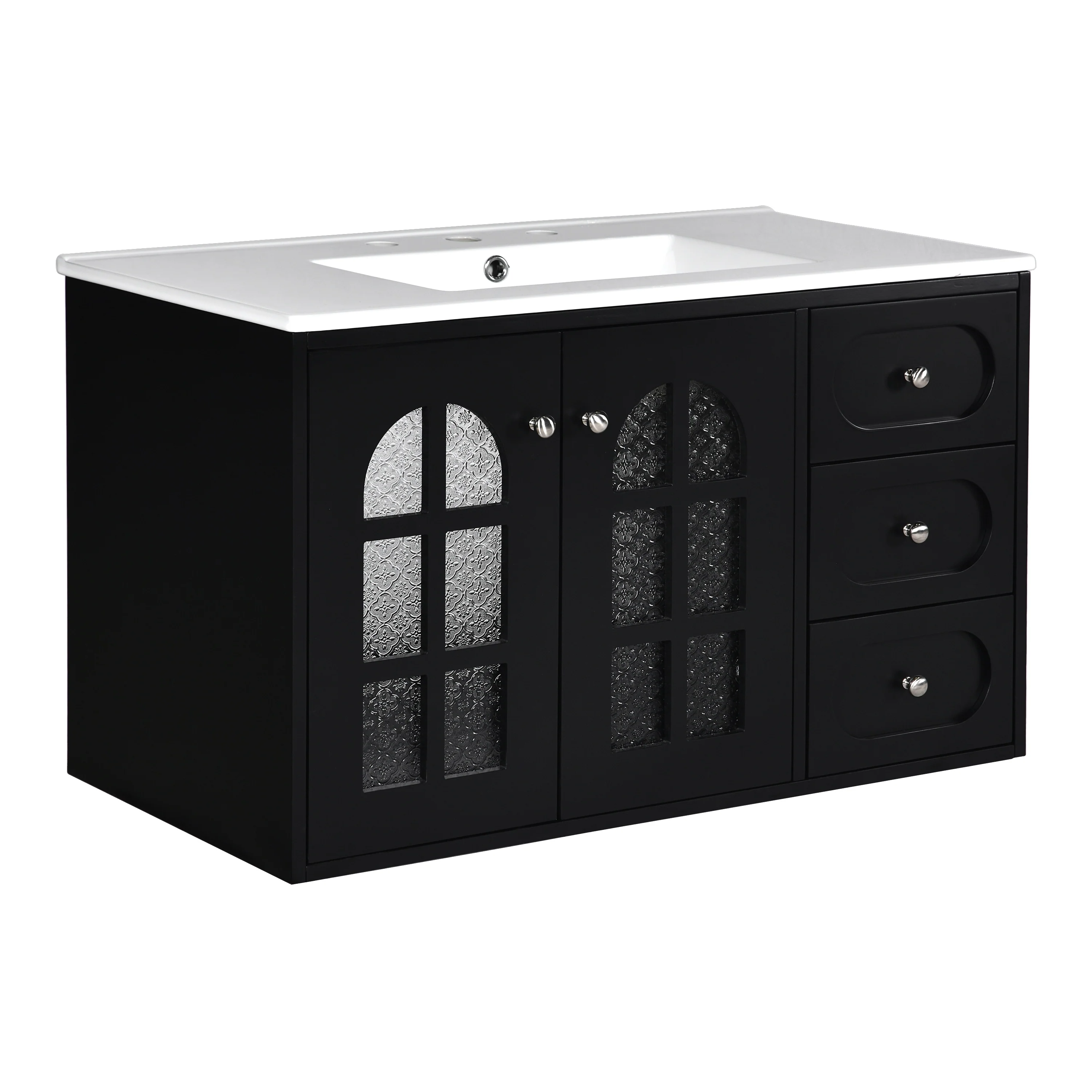 Modern 36" Wall-Mounted Bathroom Vanity with Ceramic Sink, 3 Drawers, Black Floating Cabinet, Soft-Close Doors