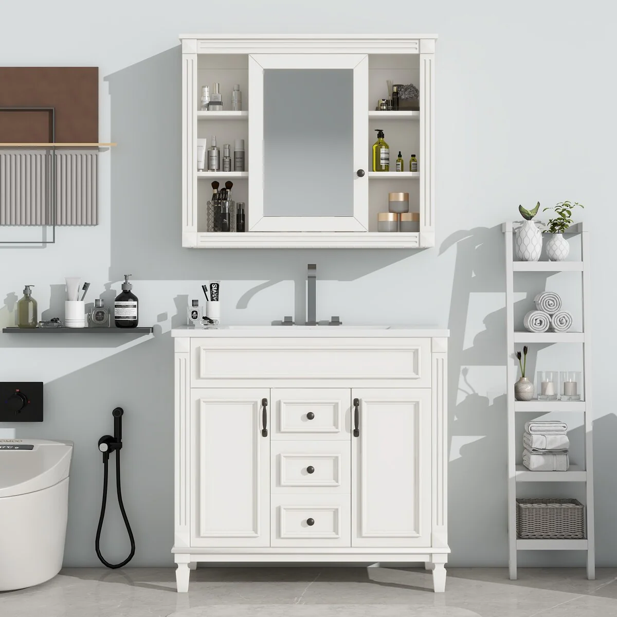 36 in. W x 18 in. D x 34 in. H Freestanding Bath Vanity with White Resin Top and Mirror Cabinet