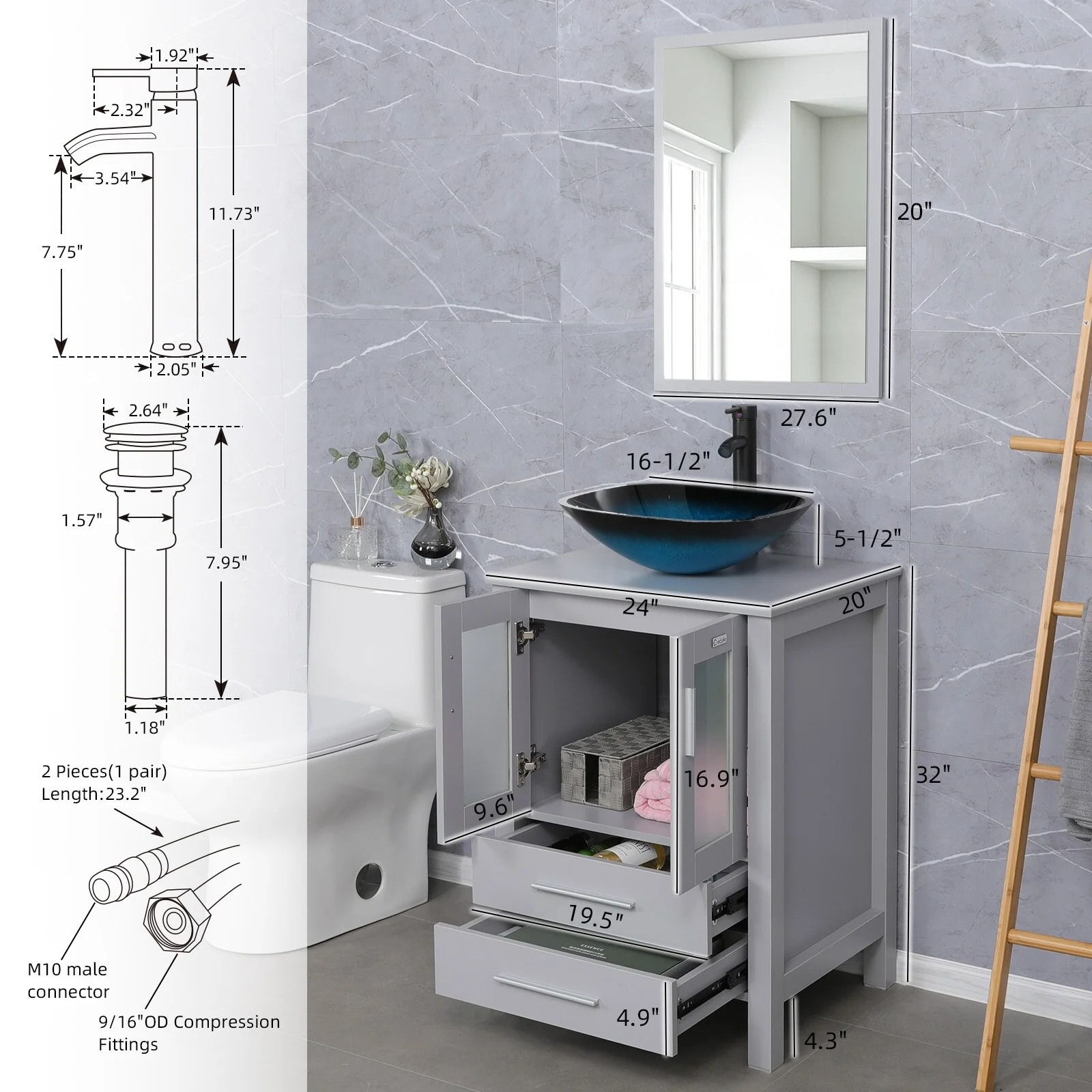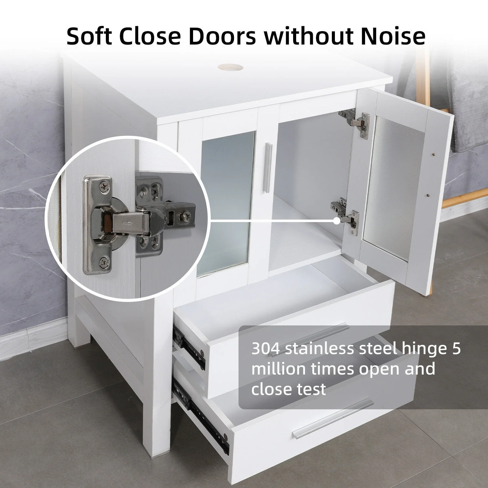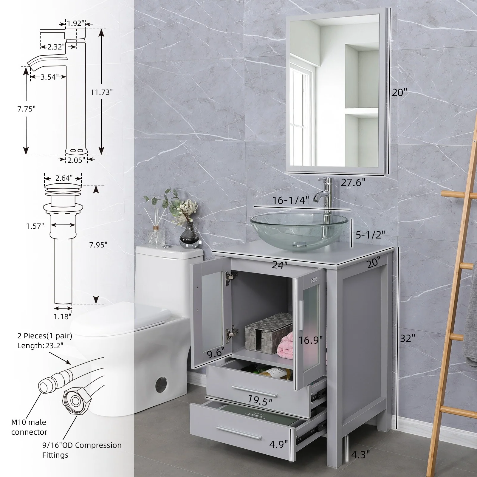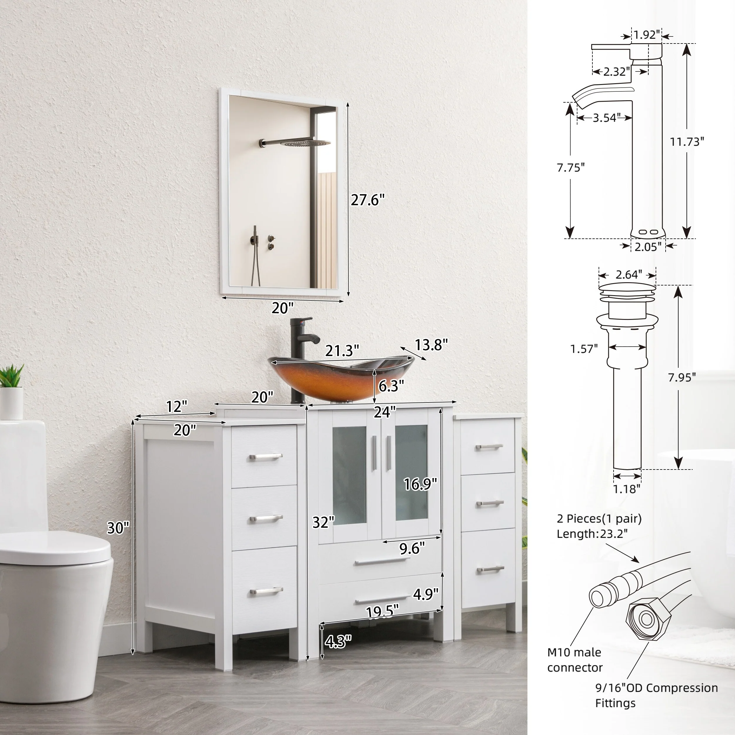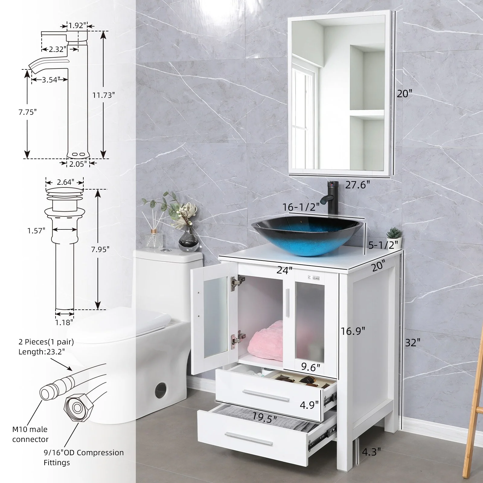 24" Bathroom Vanity White Set Glass/ Ceramic Vessel Sink Cabinet Faucet Drain Free Standing Combo