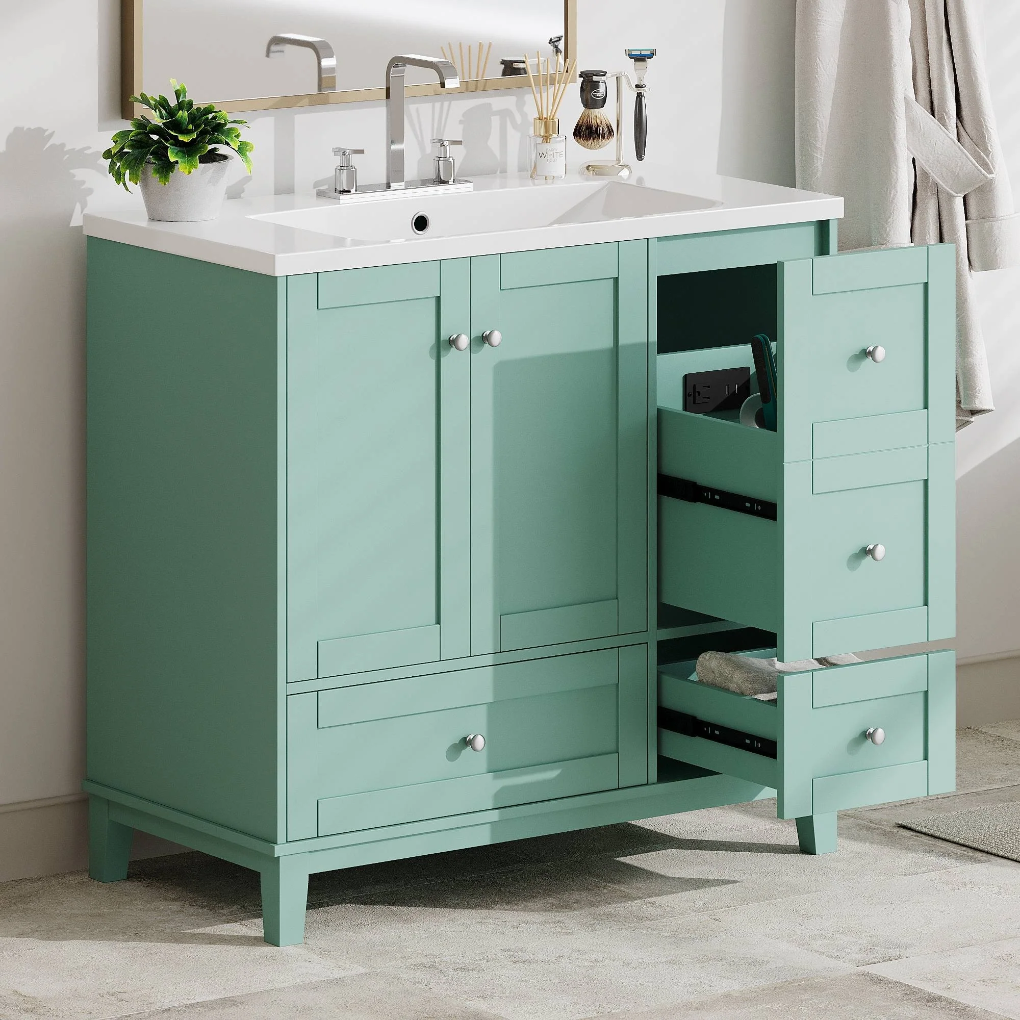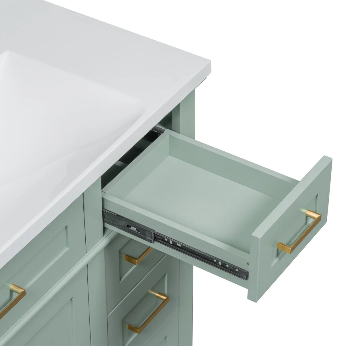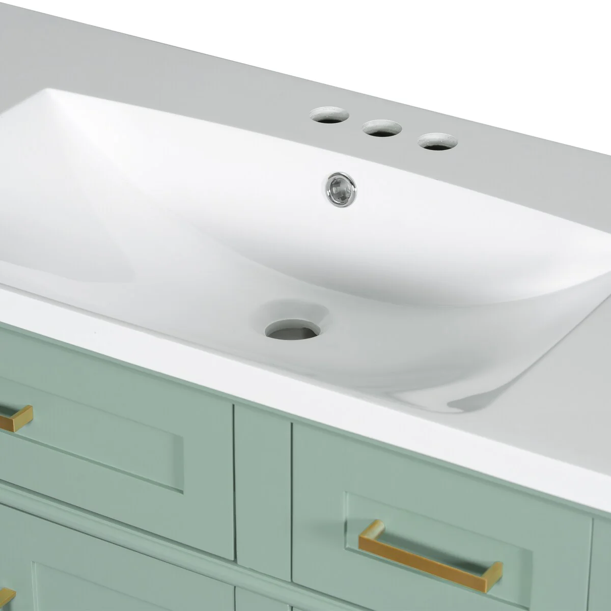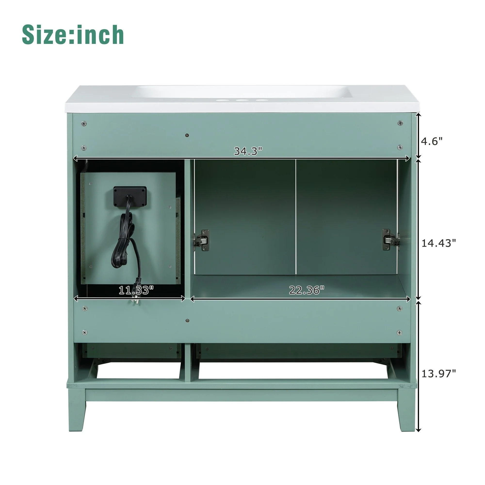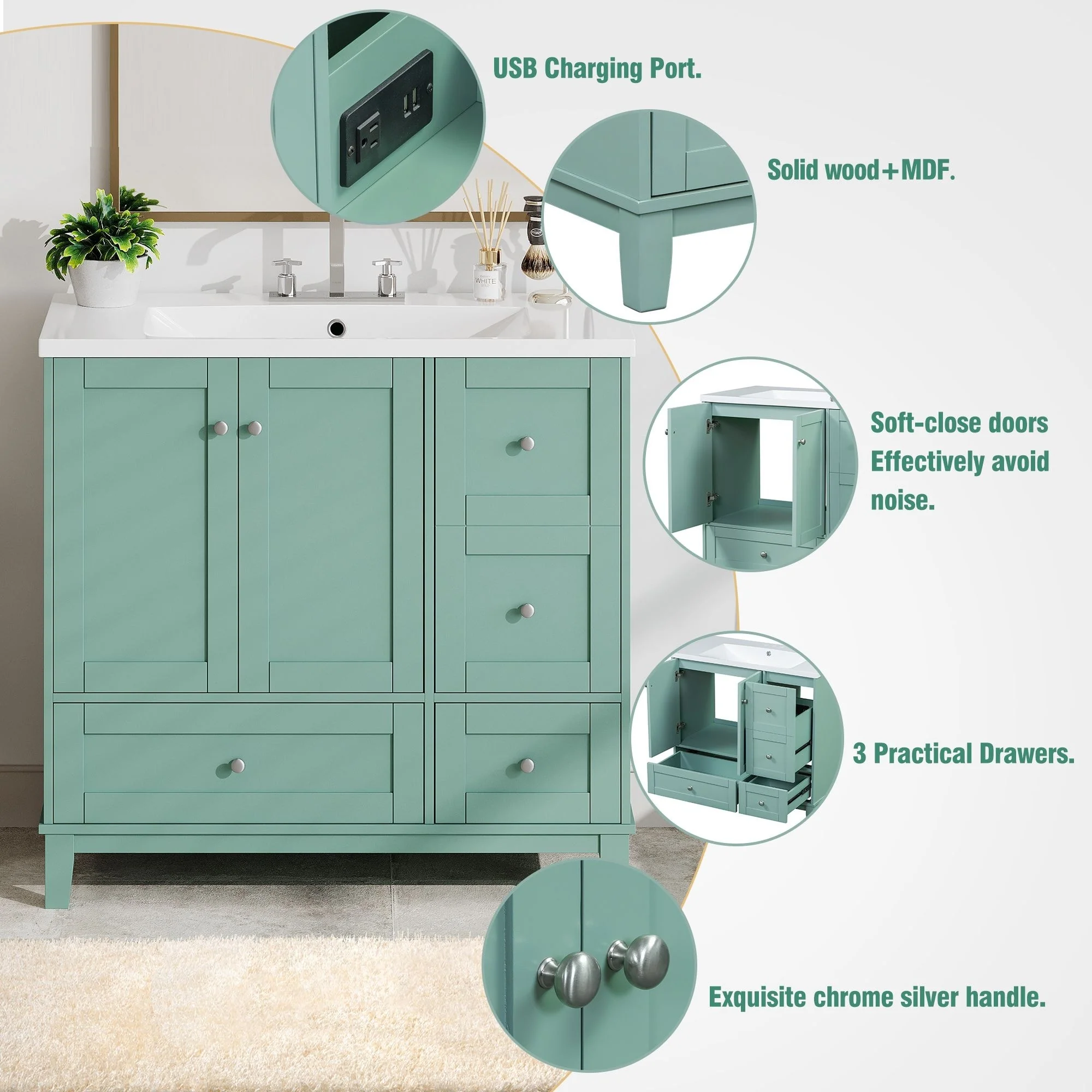 36 Inch Modern Green Bathroom Vanity with USB Charging, Resin Sink, 2 Doors and 3 Drawers