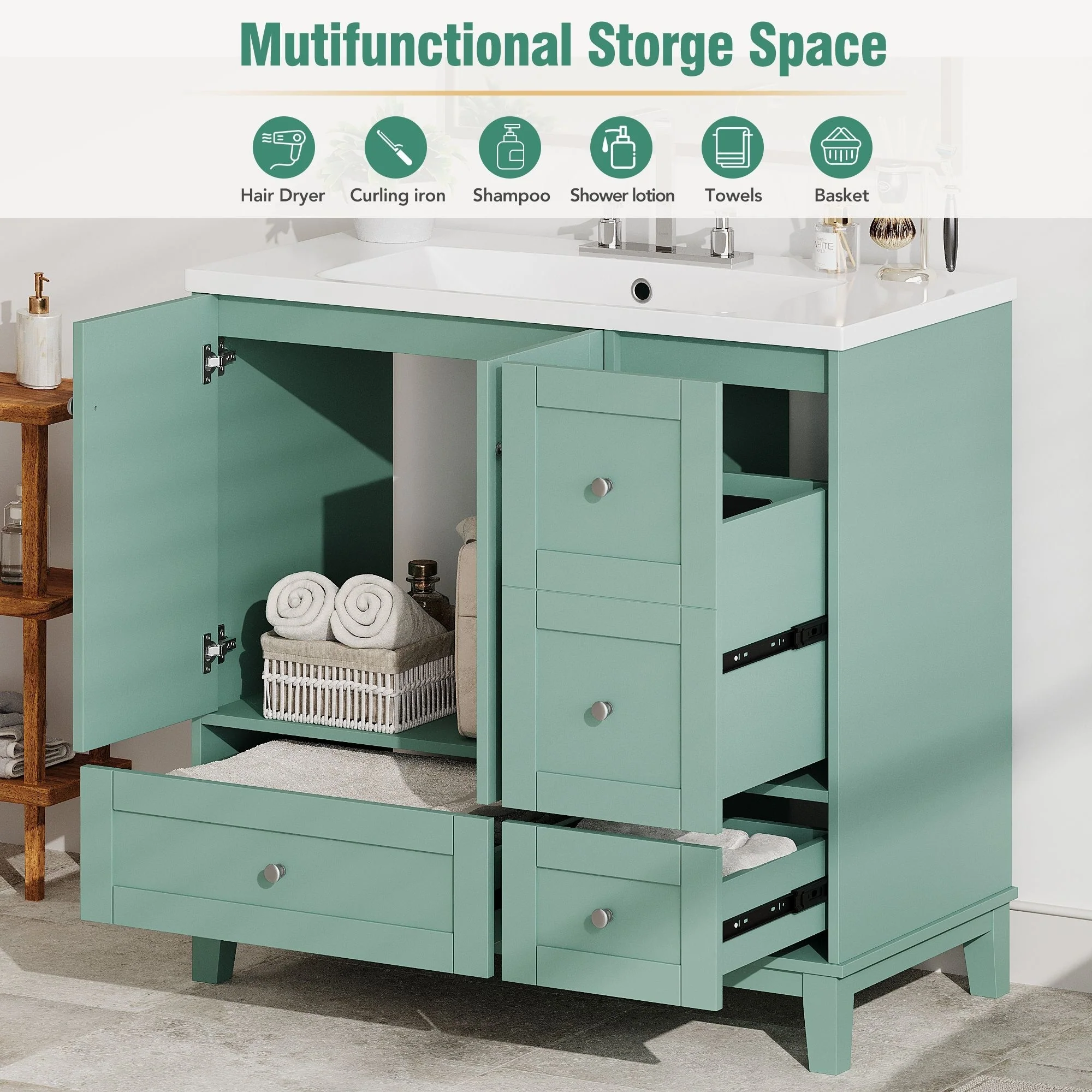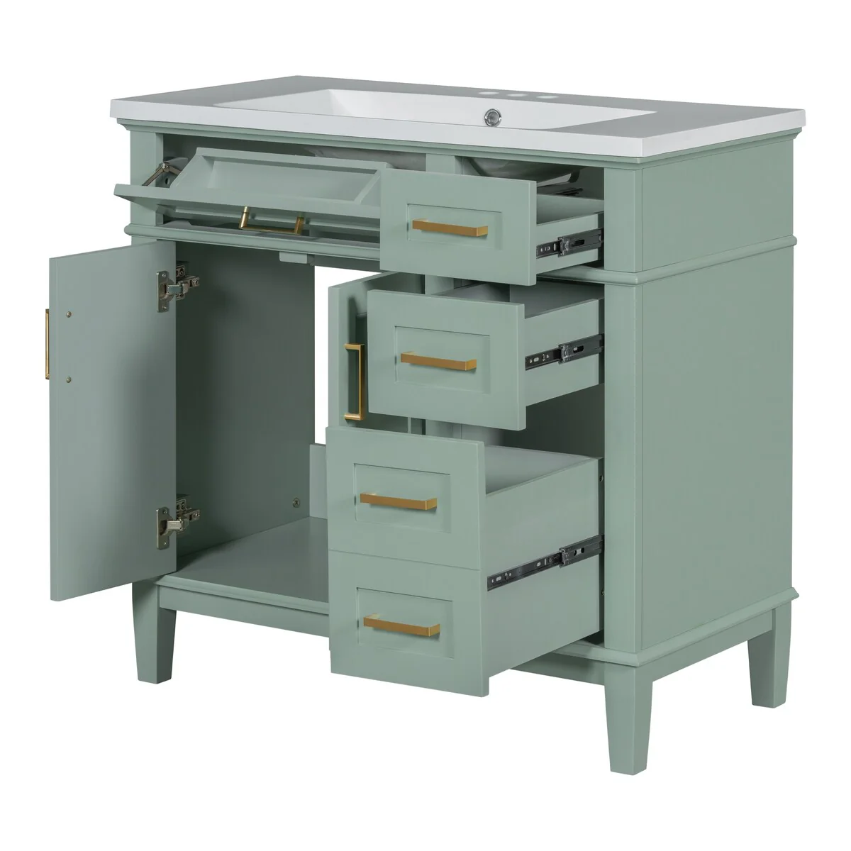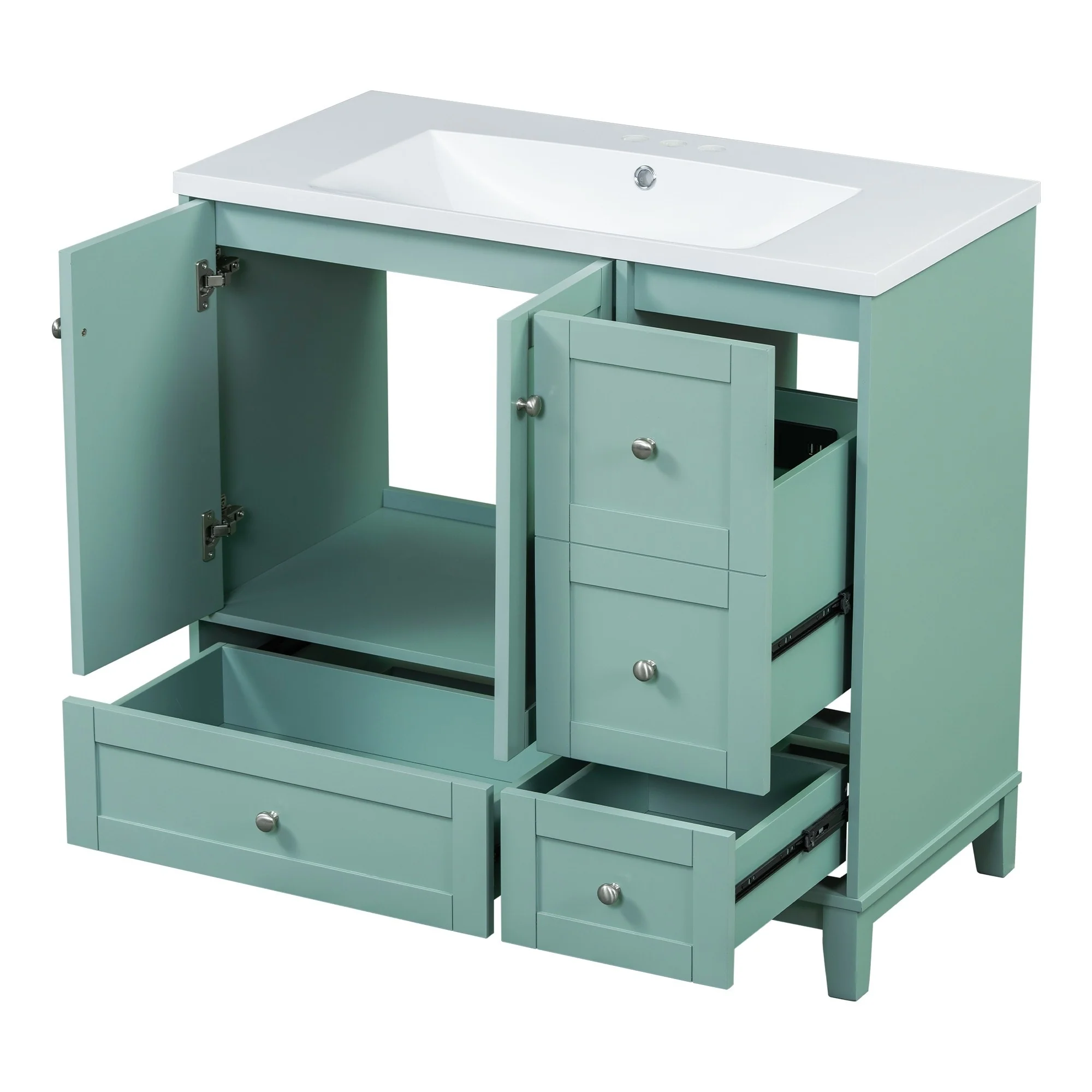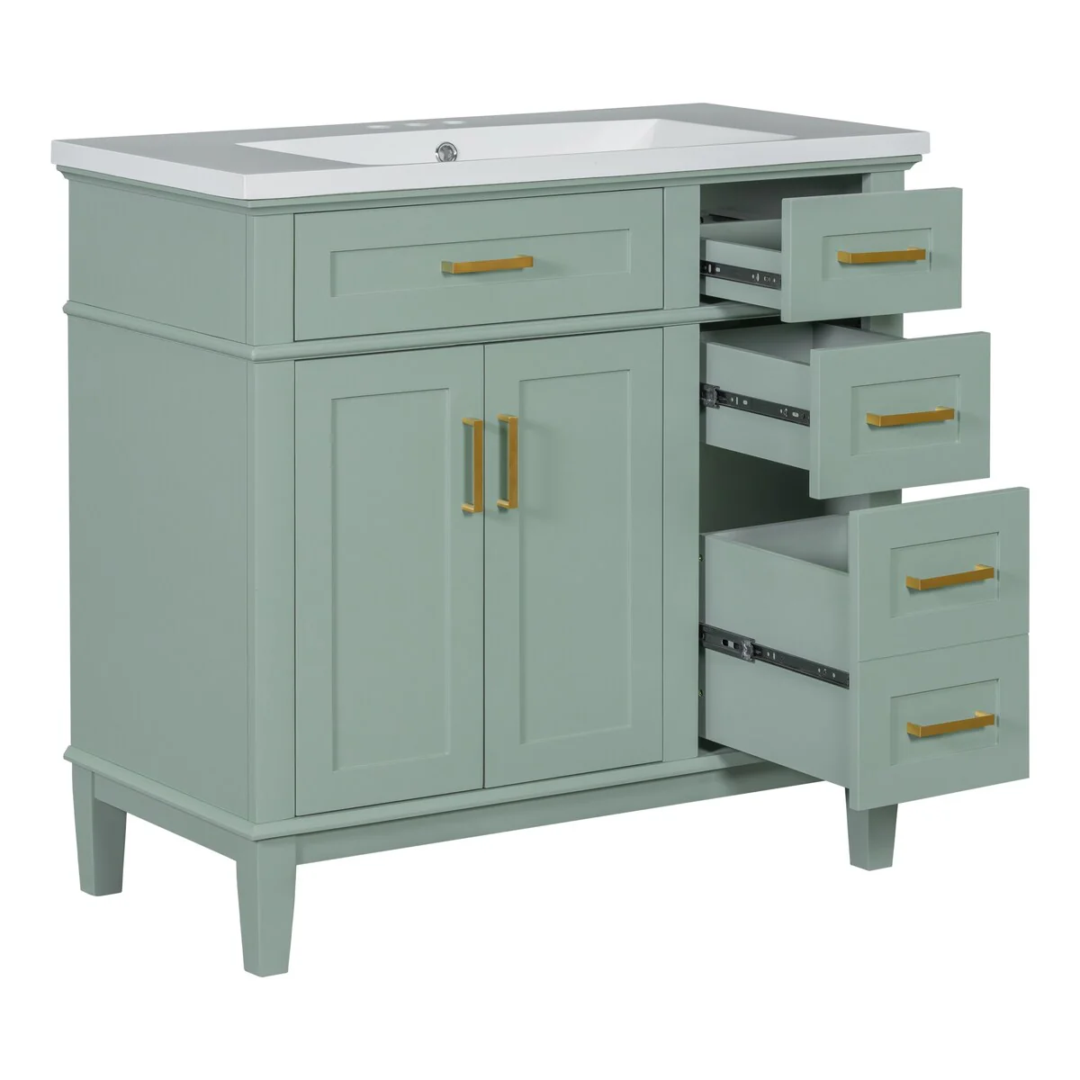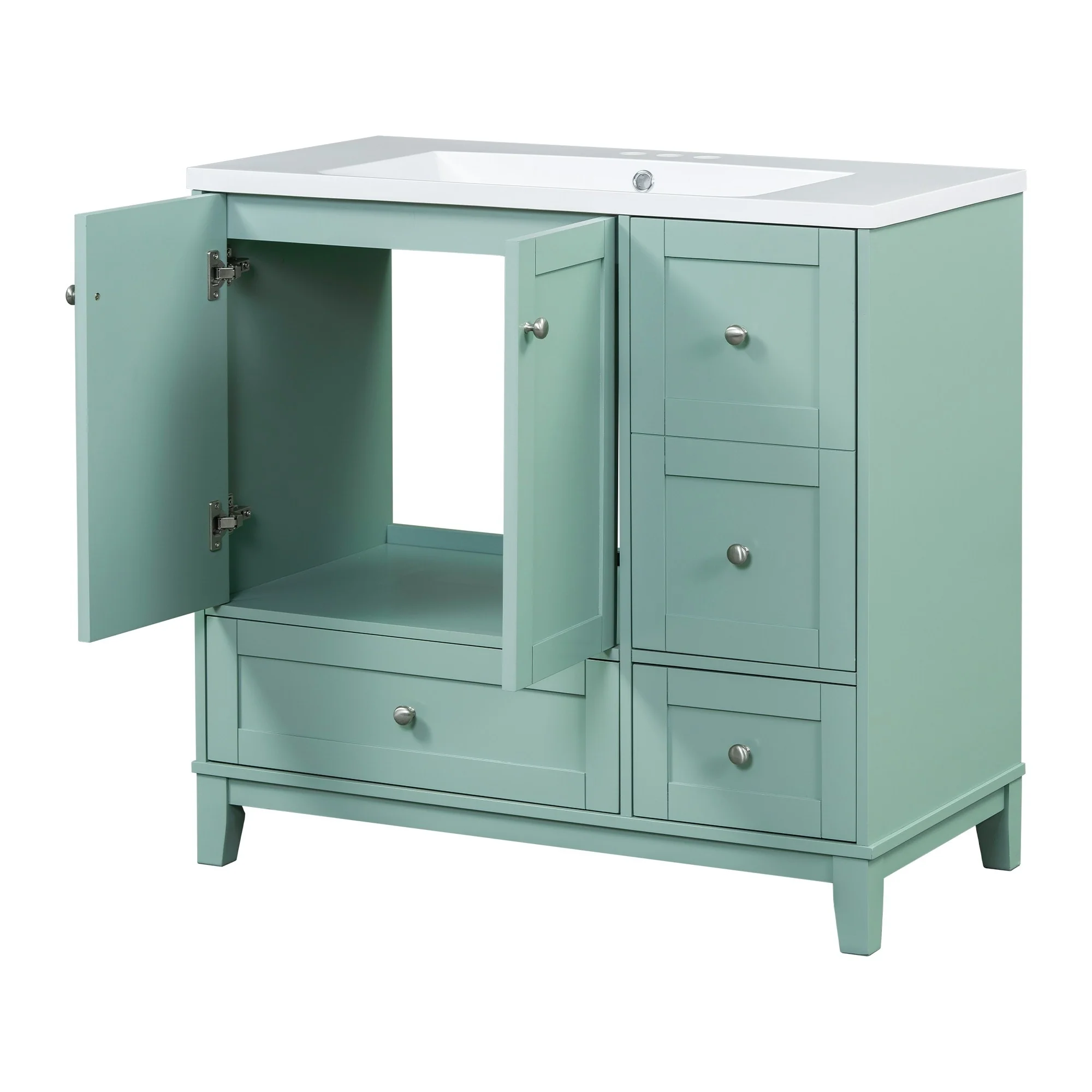 36 Inch Modern Green Bathroom Vanity with USB Charging, Resin Sink, 2 Doors and 3 Drawers