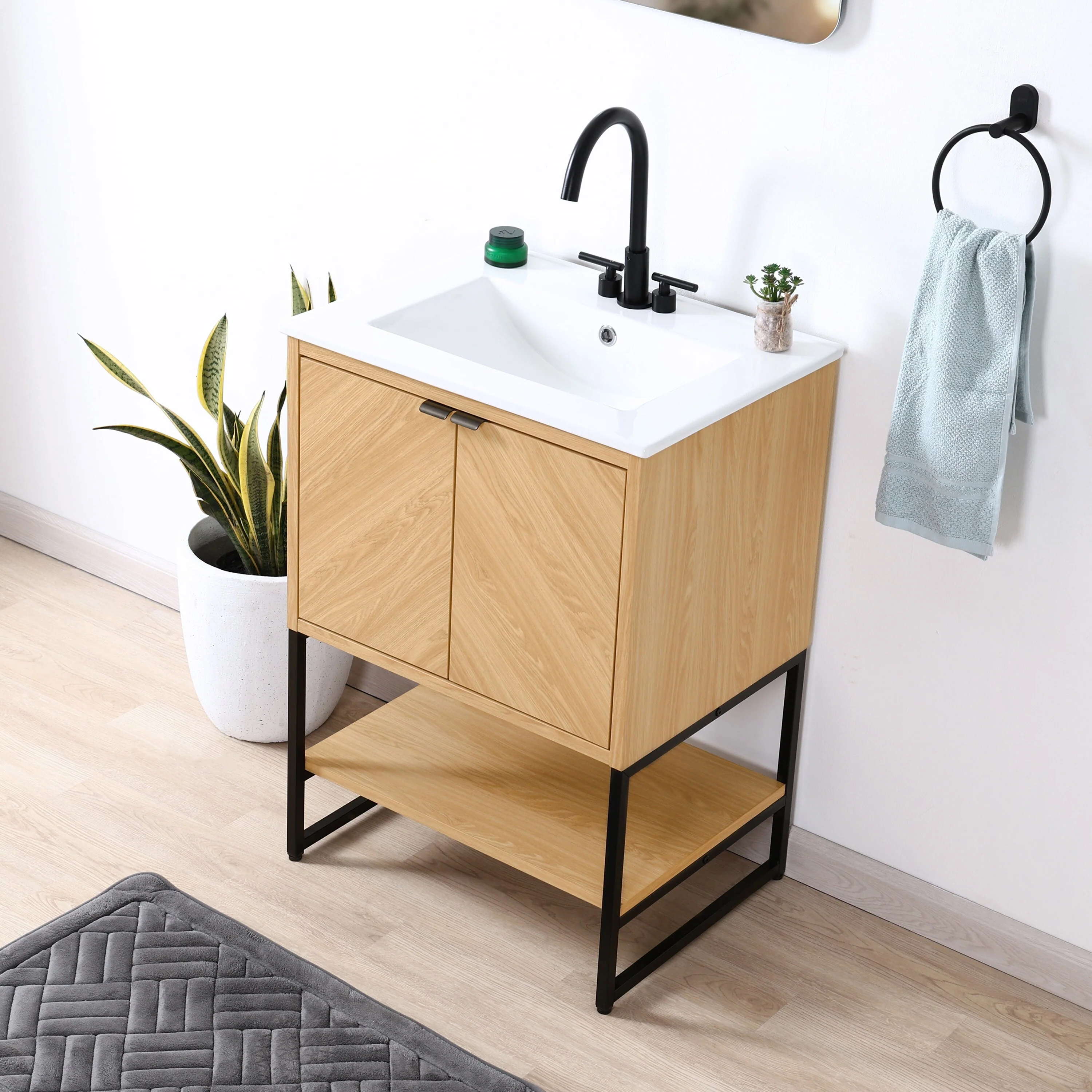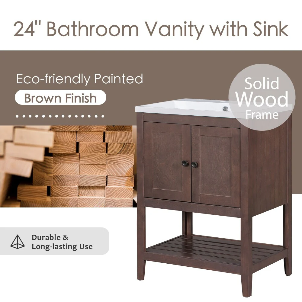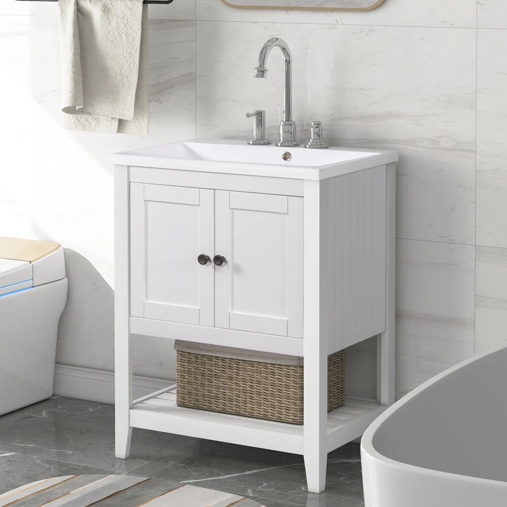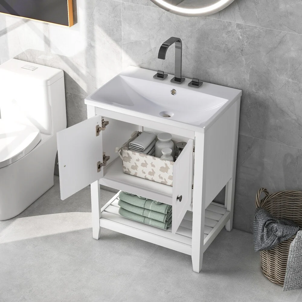 24" Modern Solid Wood Bathroom Vanity with Ceramic Sink and Open Style Shelf