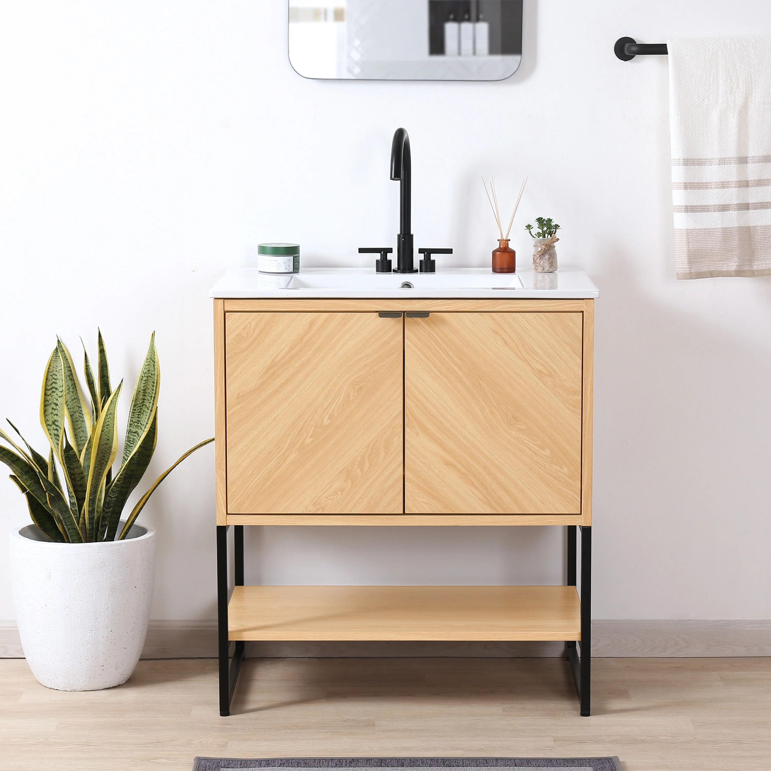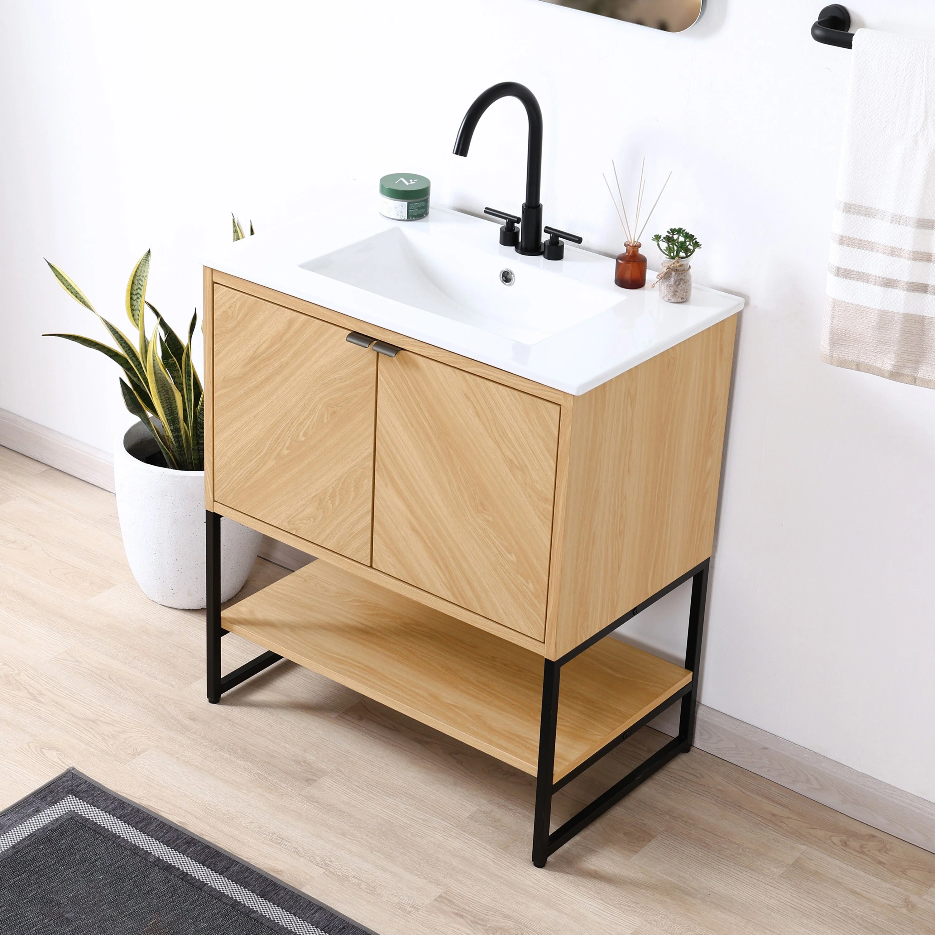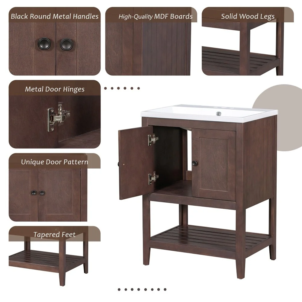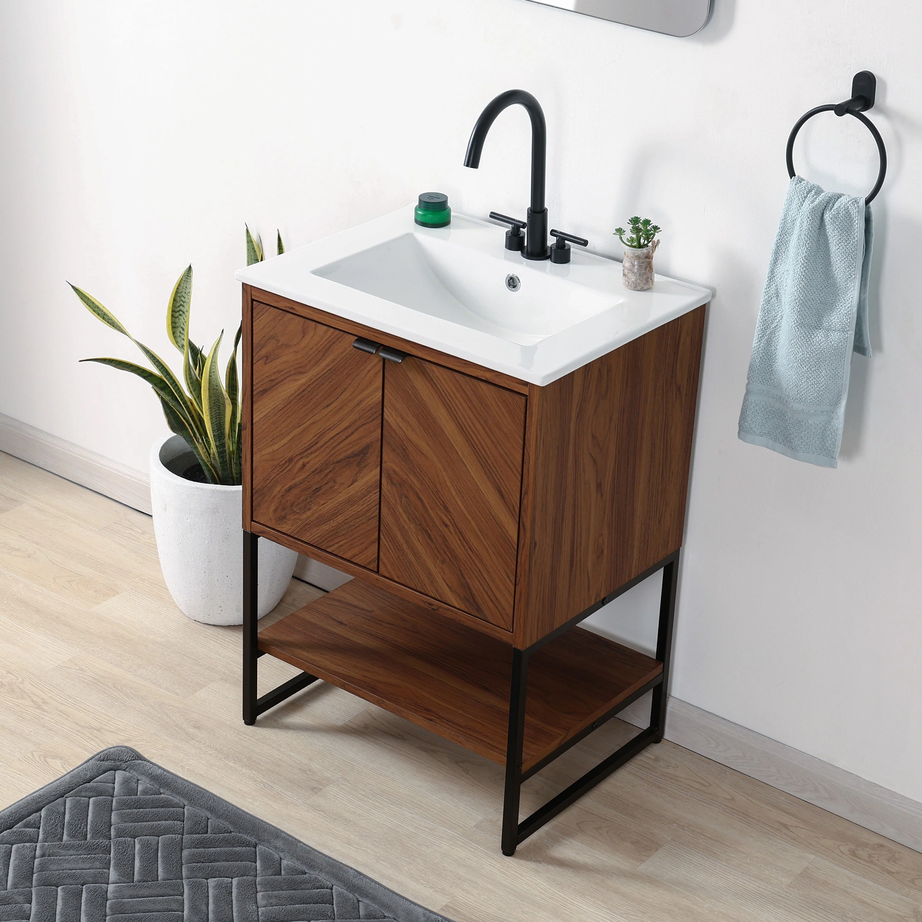 24" Modern Solid Wood Bathroom Vanity with Ceramic Sink and Open Style Shelf