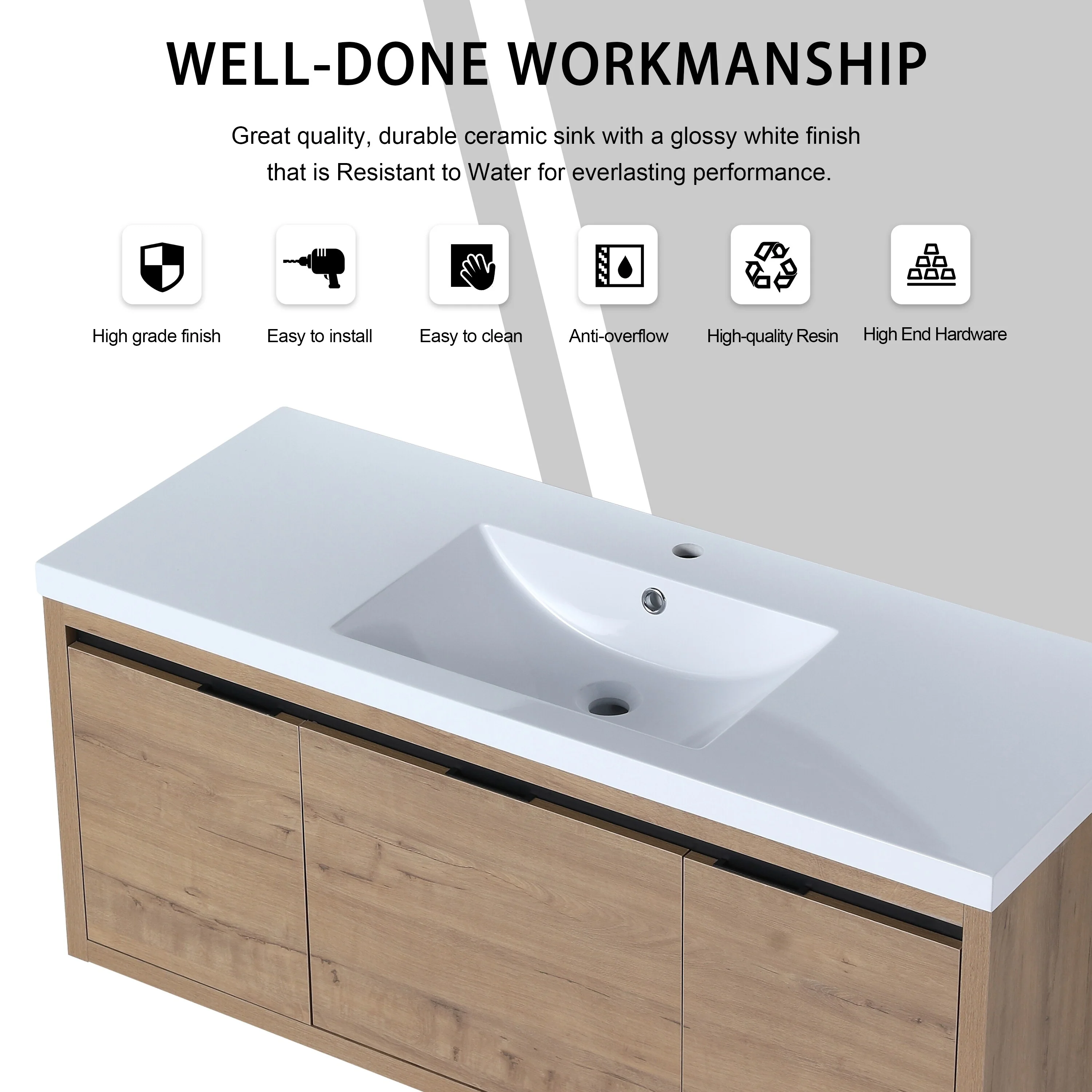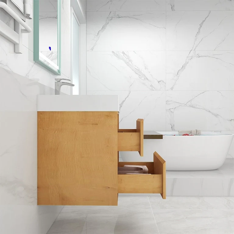 35.43" Floading Single Bathroom Vanities, with 2 Drawers, Glossy Sintered Stone Top, Light Wood