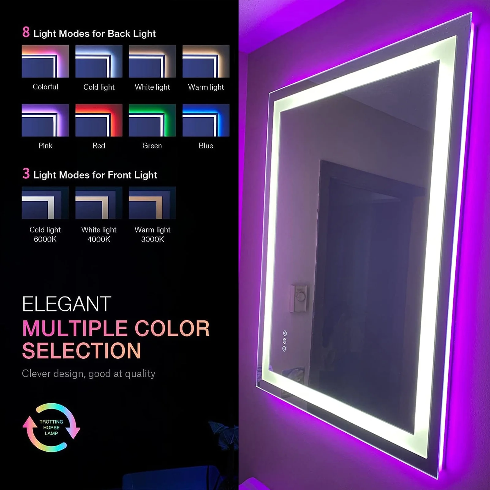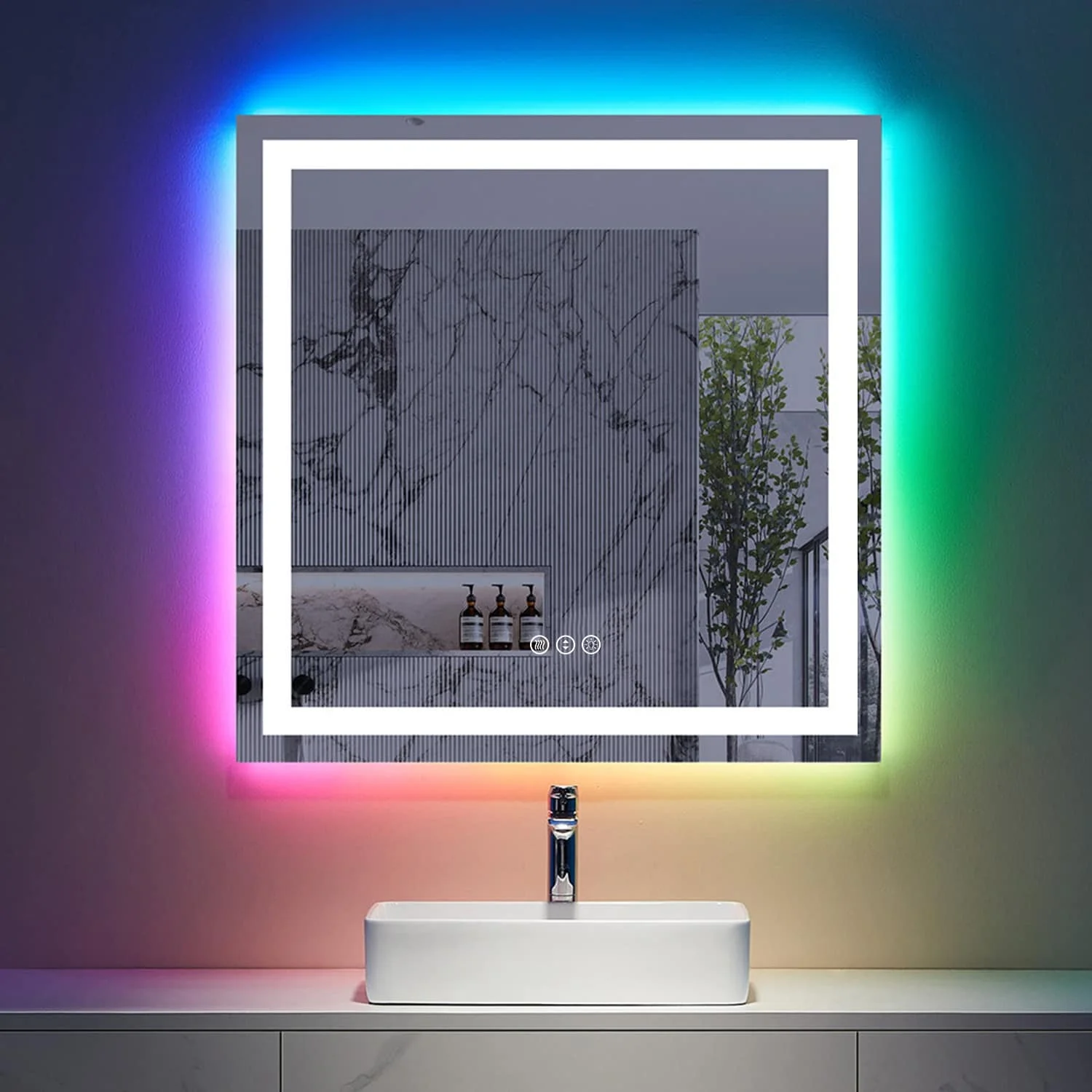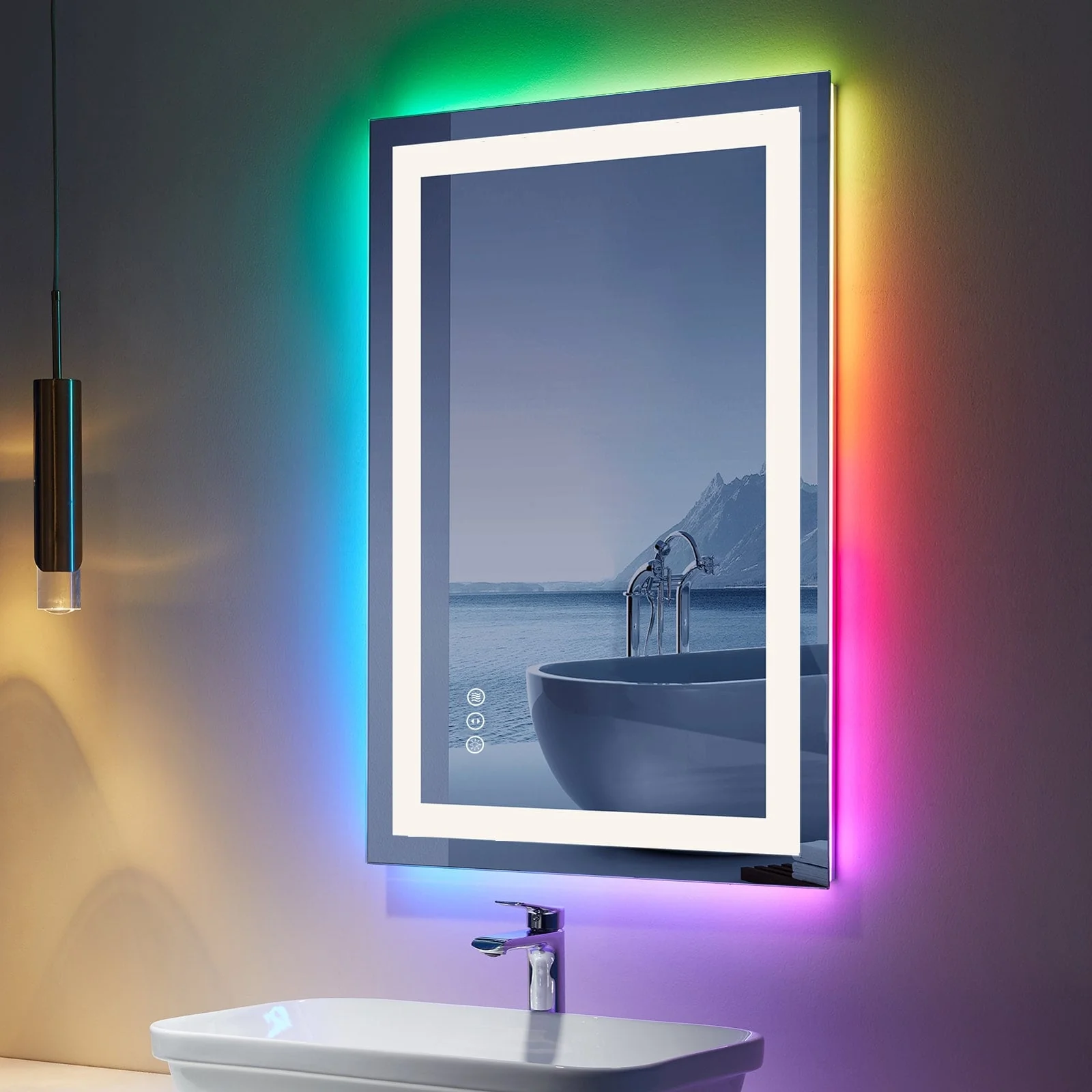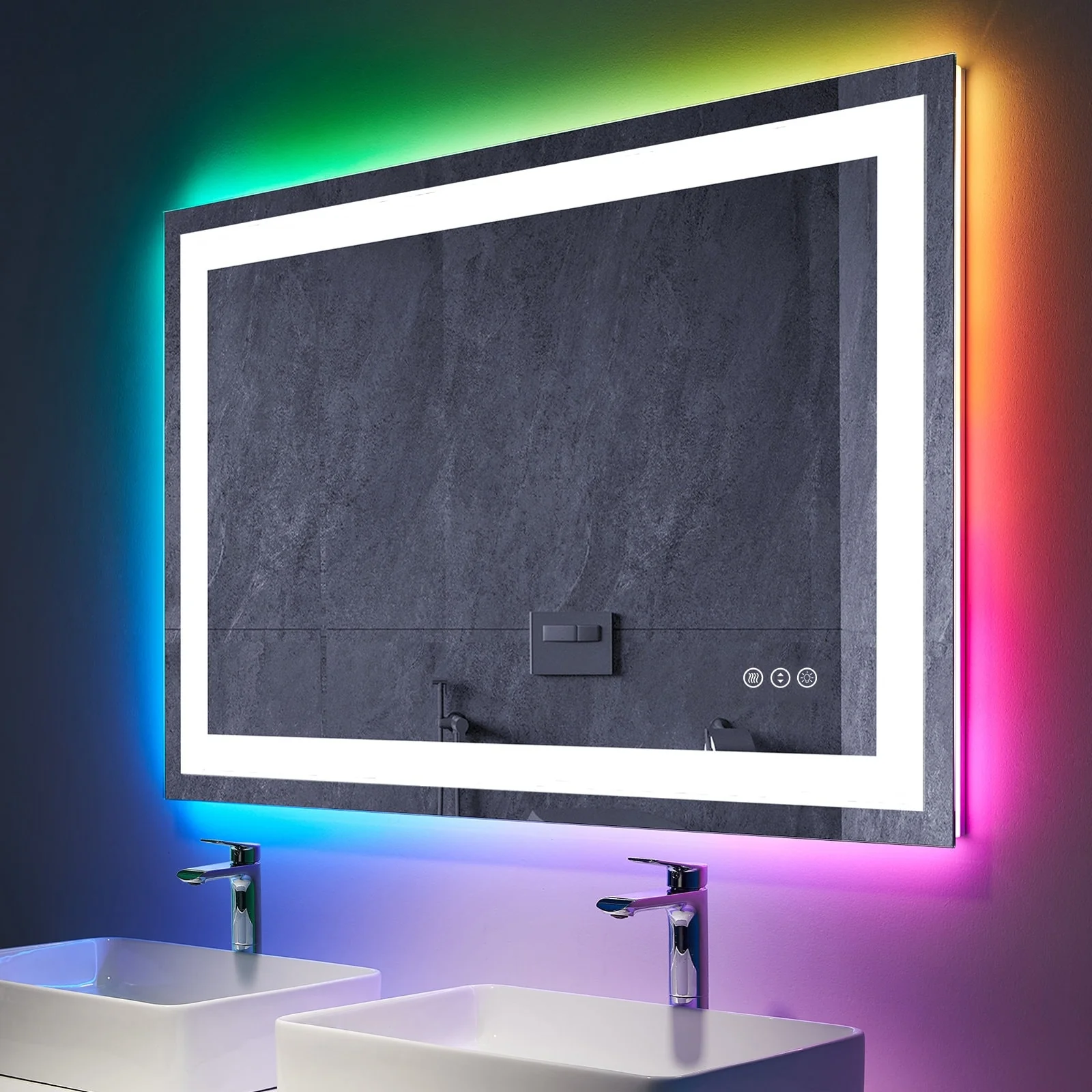 KIOTEE Rectangular LED Frontlit & RGB Backlit Anti-Fog Tempered Glass Bathroom Vanity Mirror with ETL and 3-Year Warranty