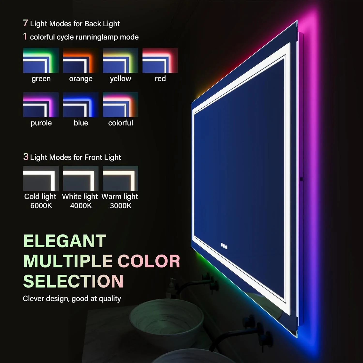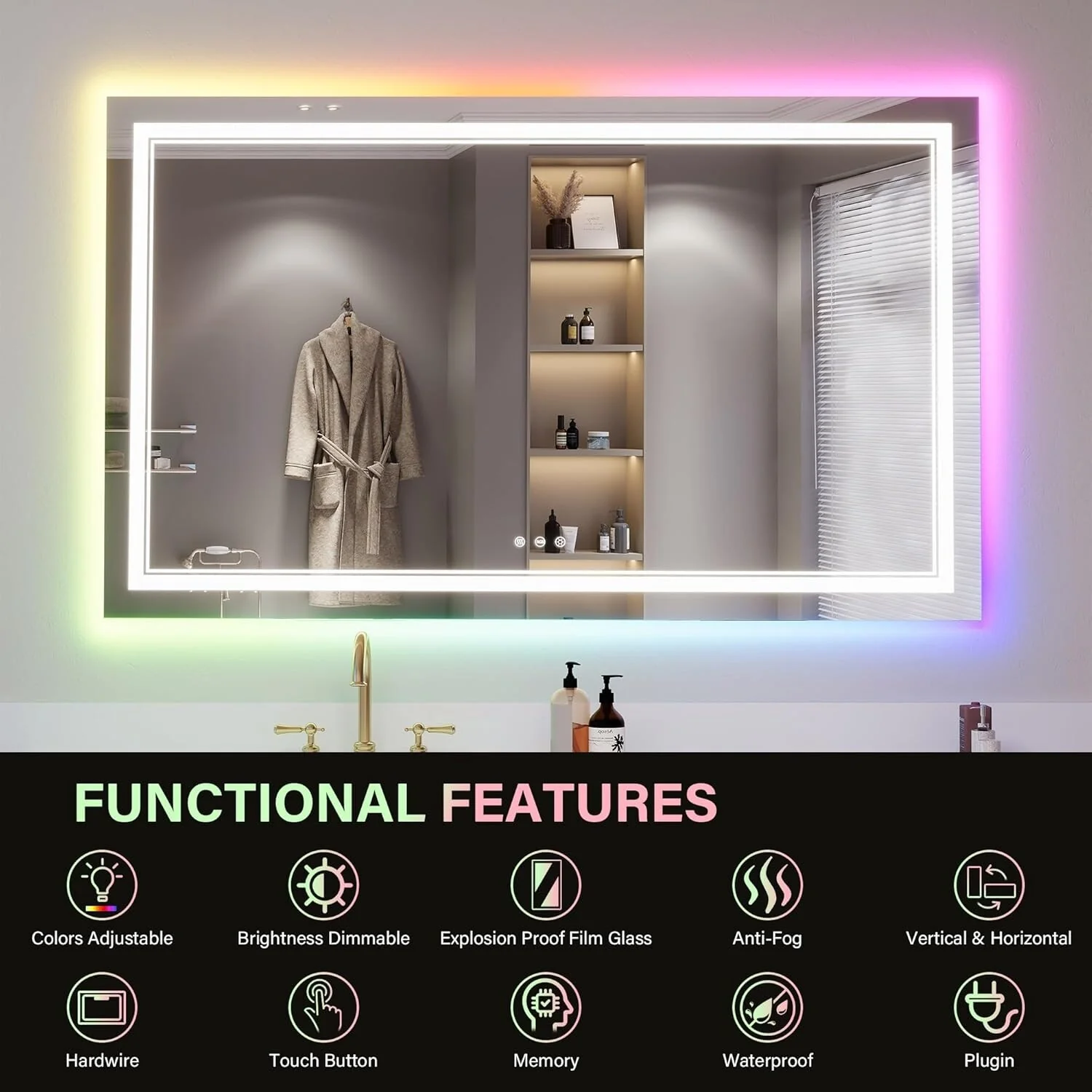 LED Bathroom Mirror with Lights,Bathroom Wall with 3 Colors Dimmable - 60"L x 36"W