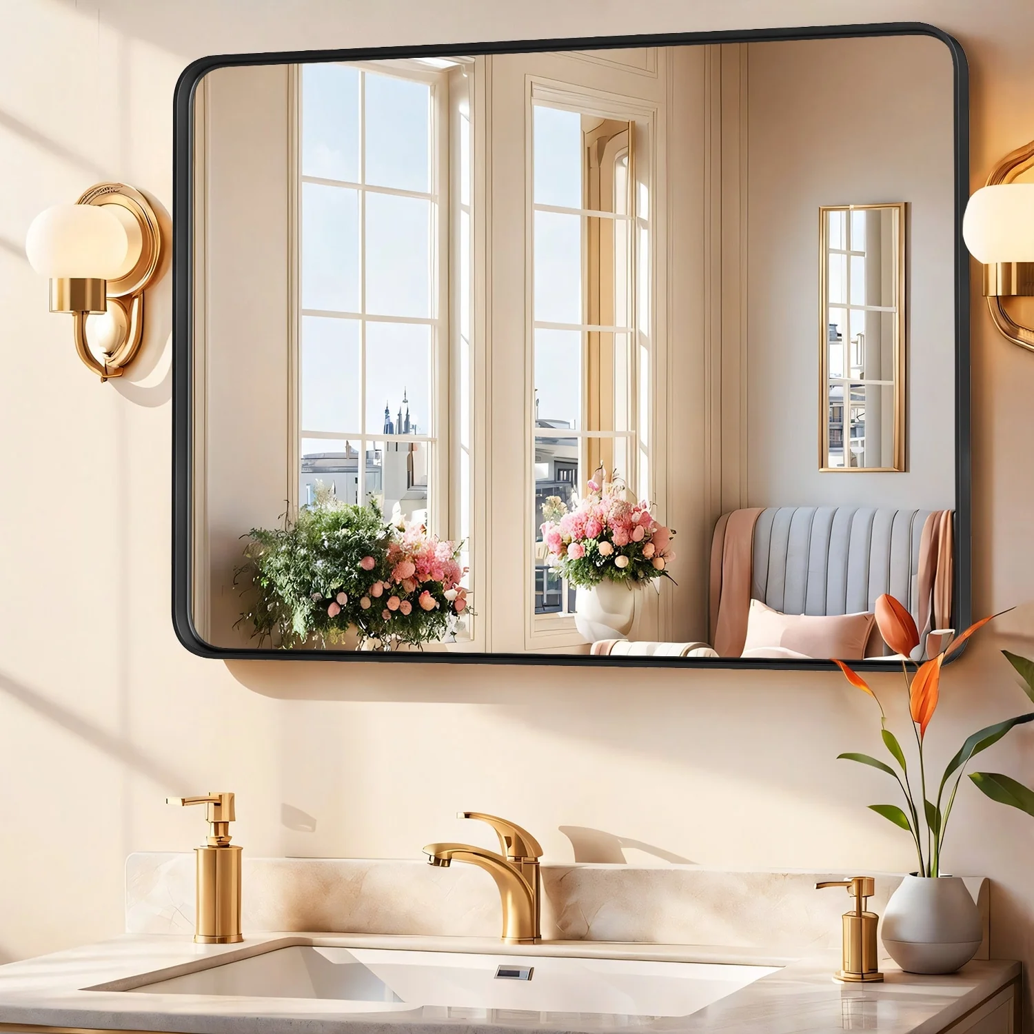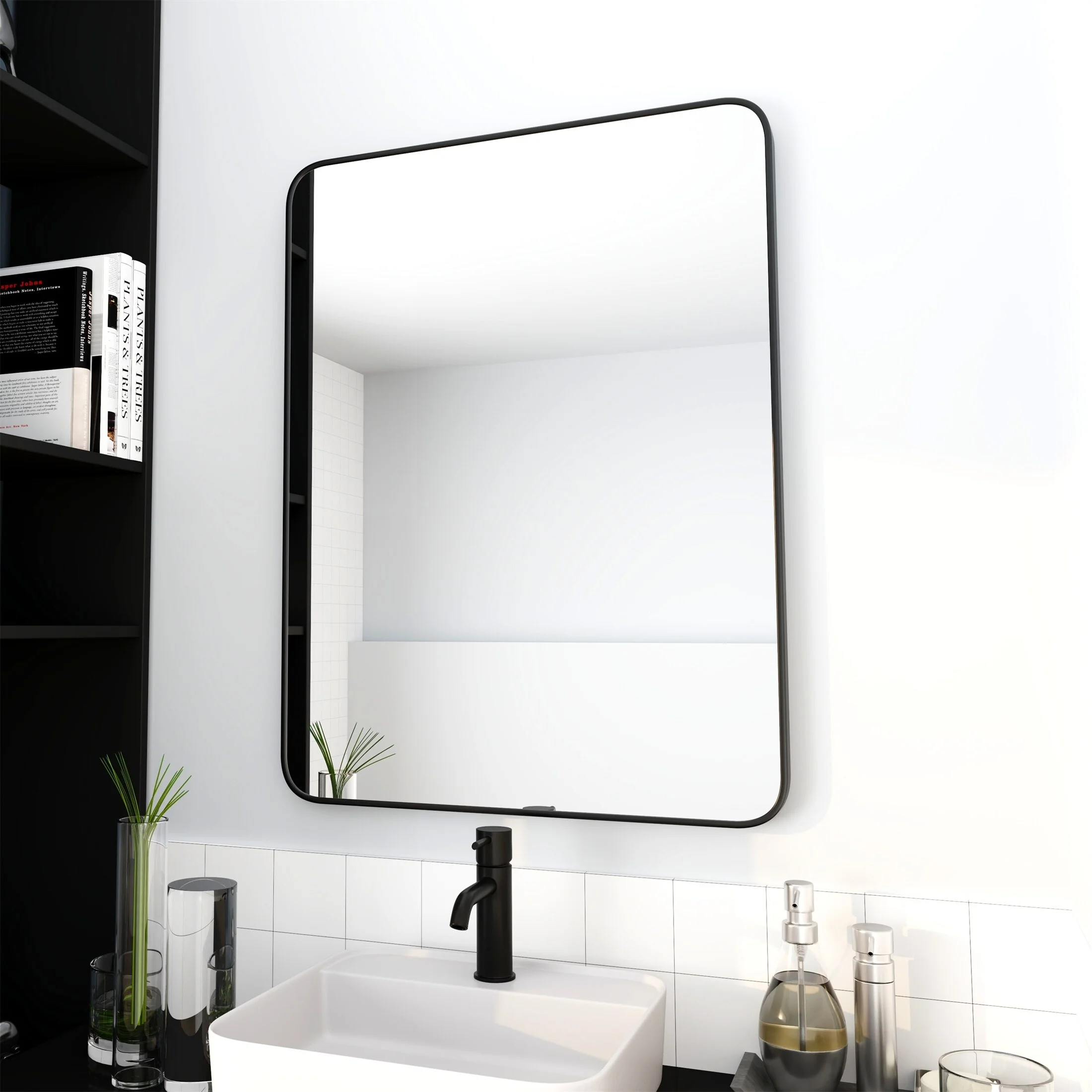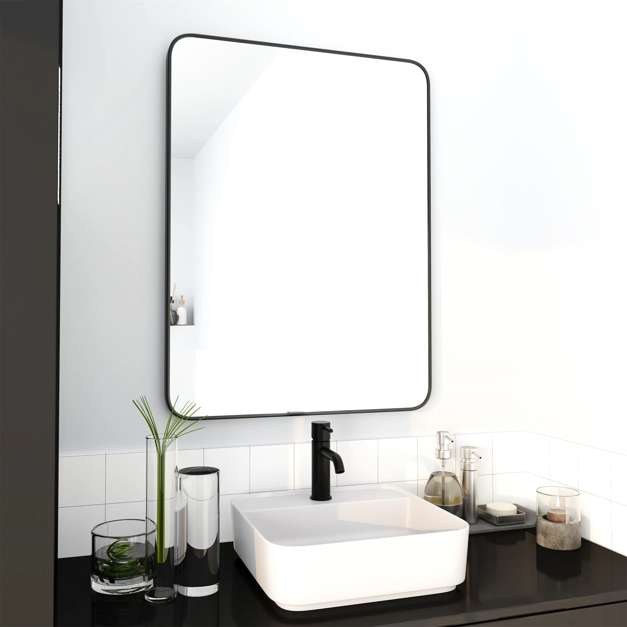 Black Aluminum Alloy Framed Vanity Rounded Rectangle Bathroom Mirrors for Over Sink Wall, Horizontally or Vertically Hanging