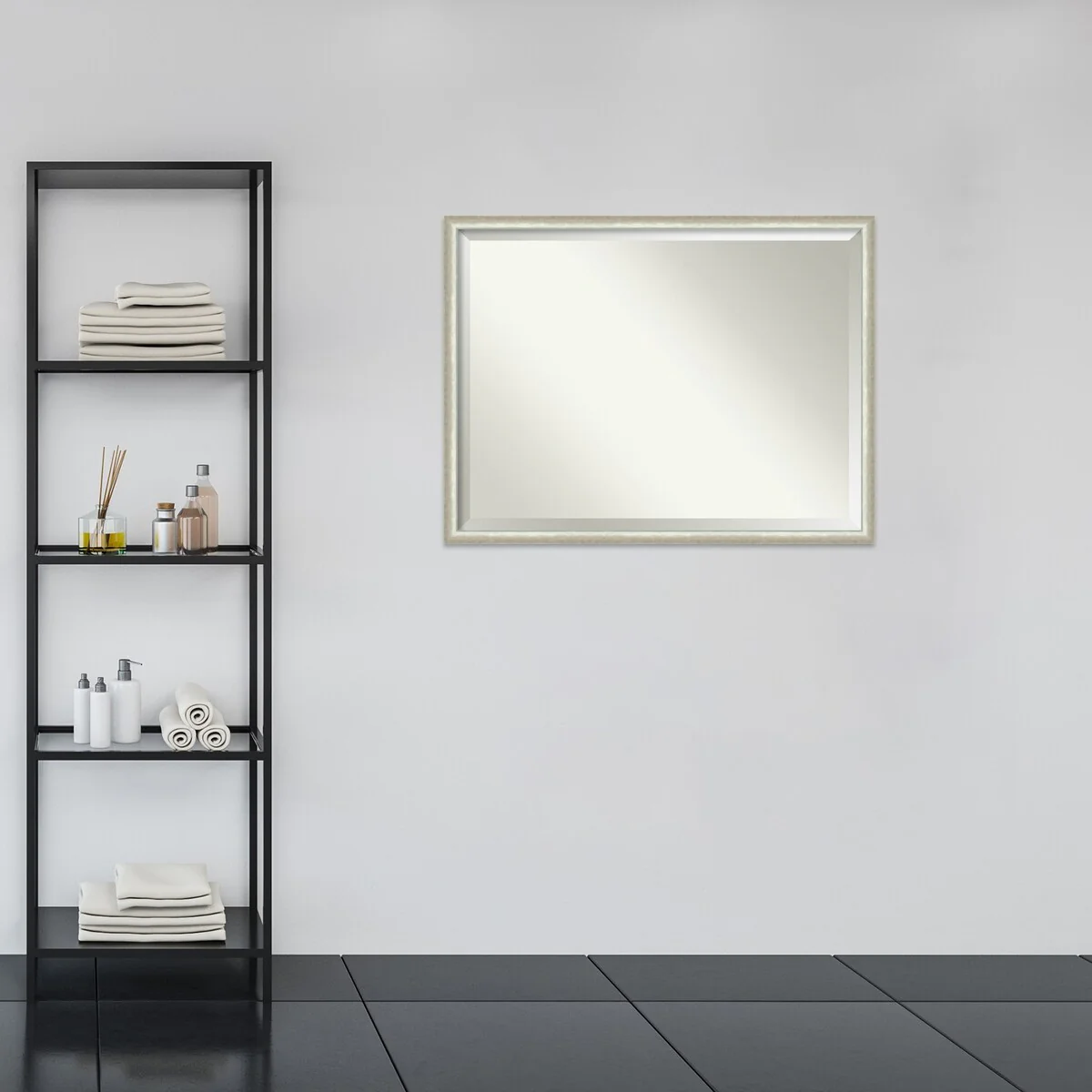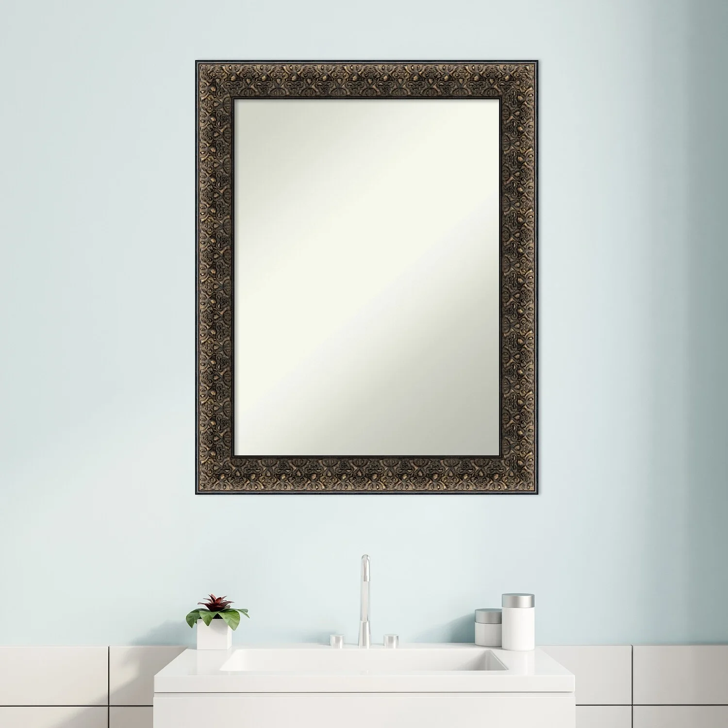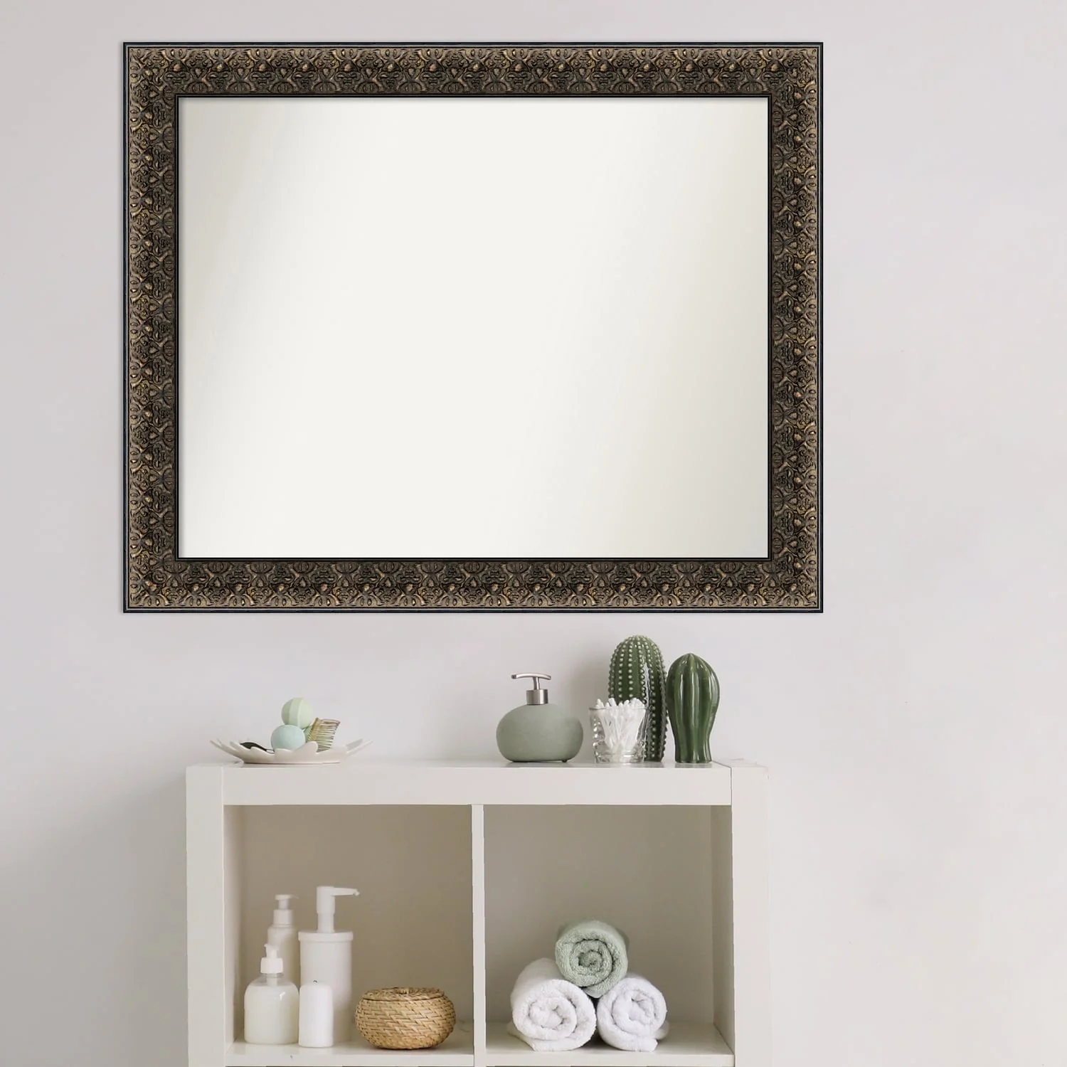 Non-Beveled Wood Bathroom Wall Mirror - Intaglio Embossed Black Frame