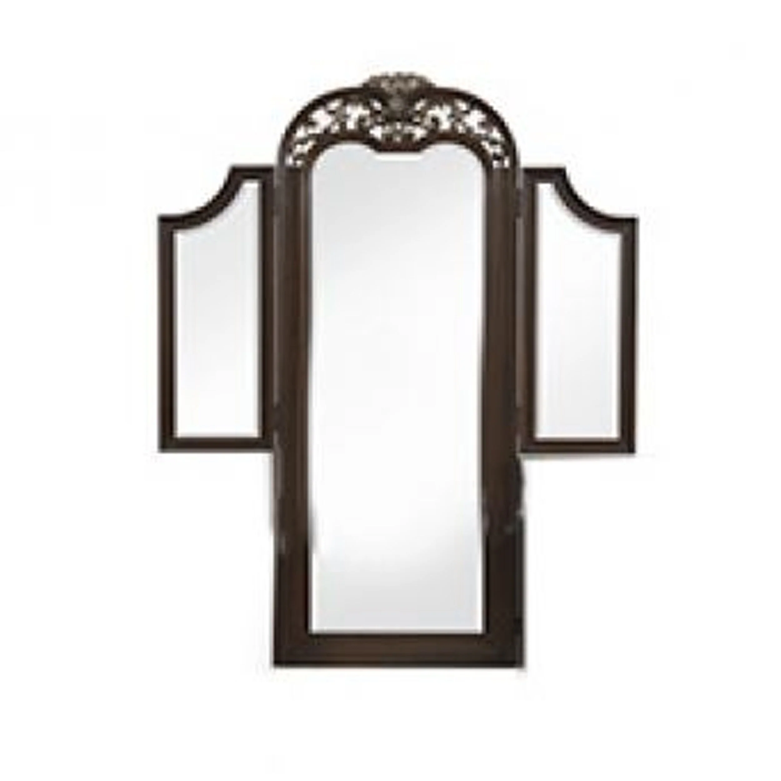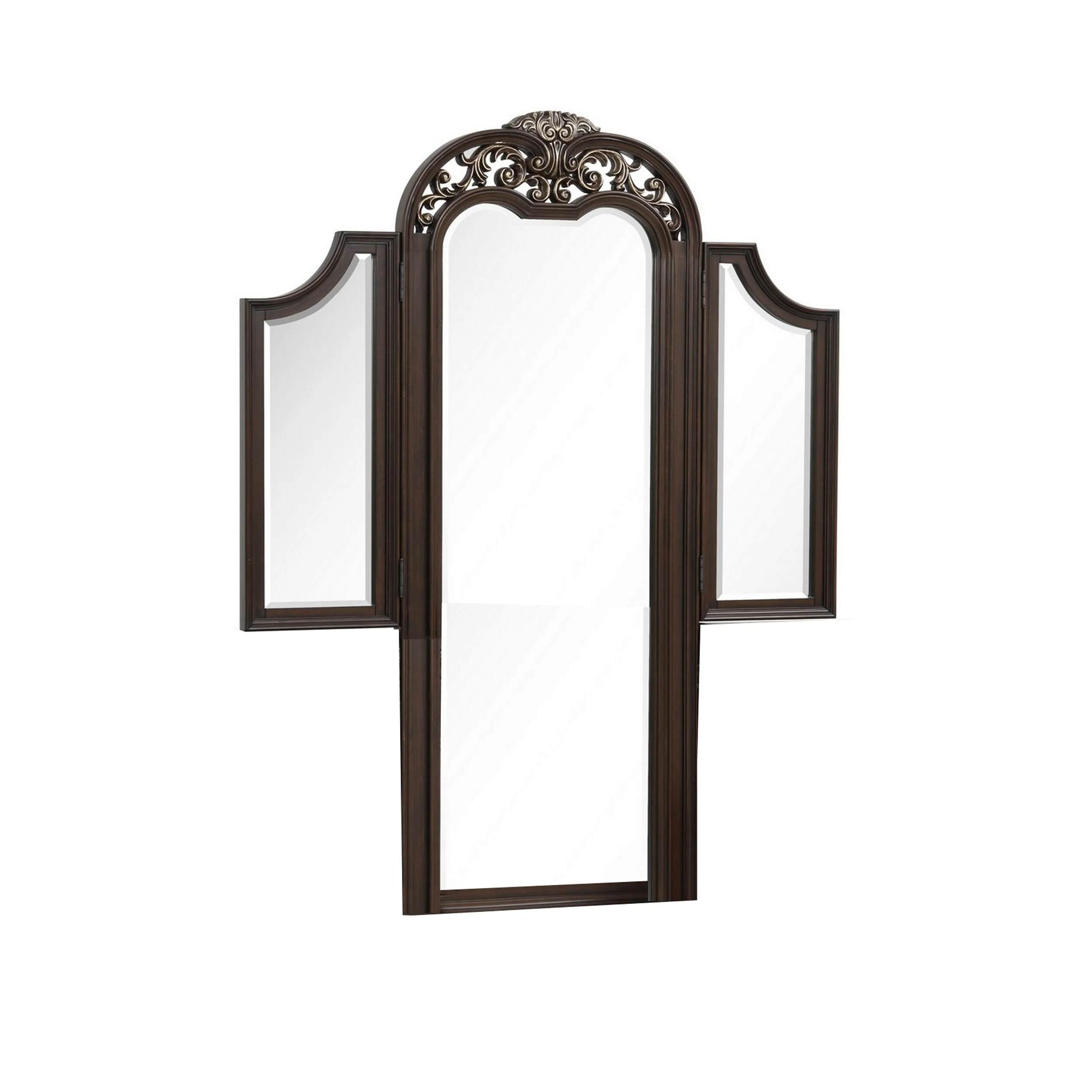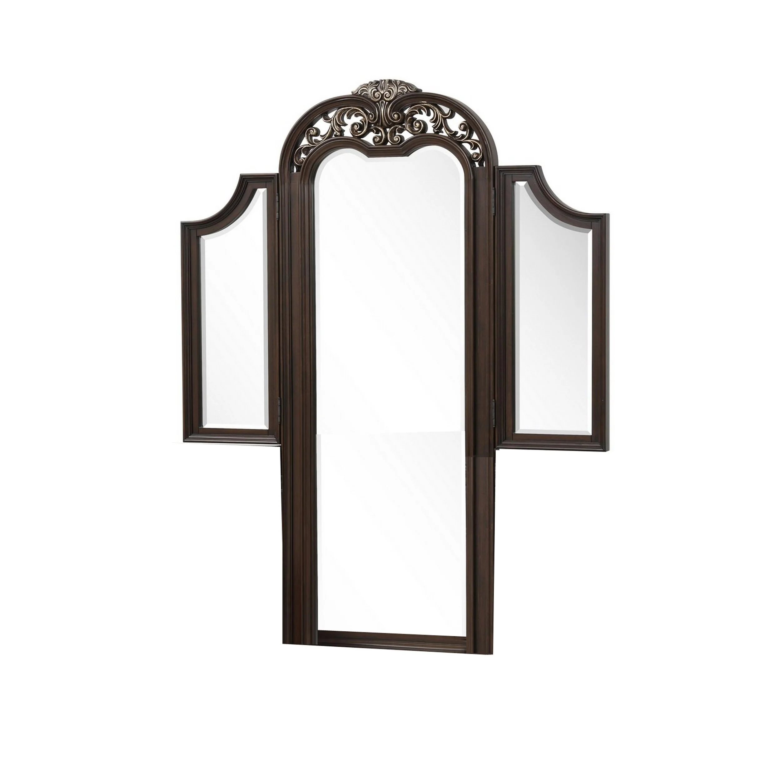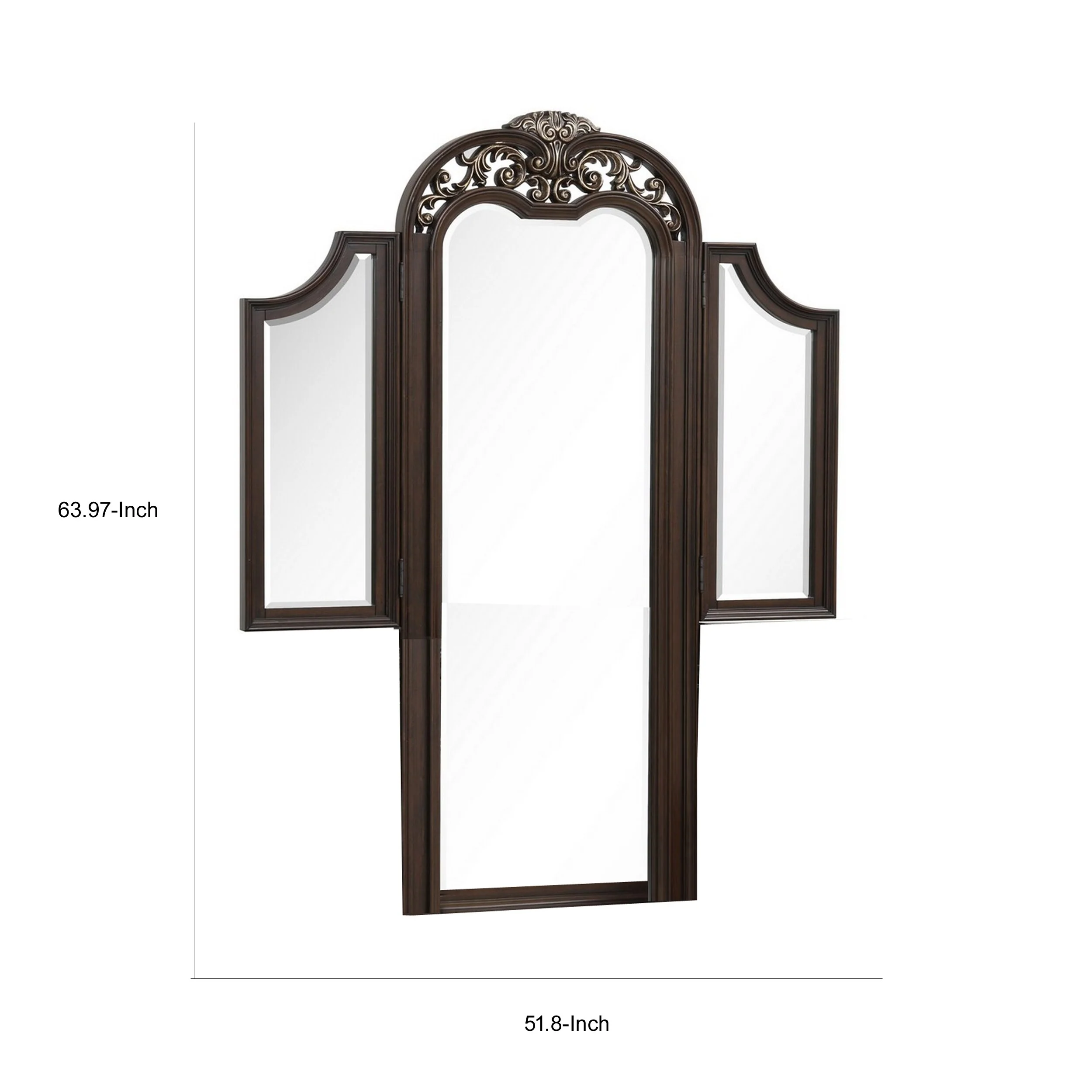 Liana 64 Inch Vanity Table Mirror, 3 Panels, Crown Carvings and Scrollwork