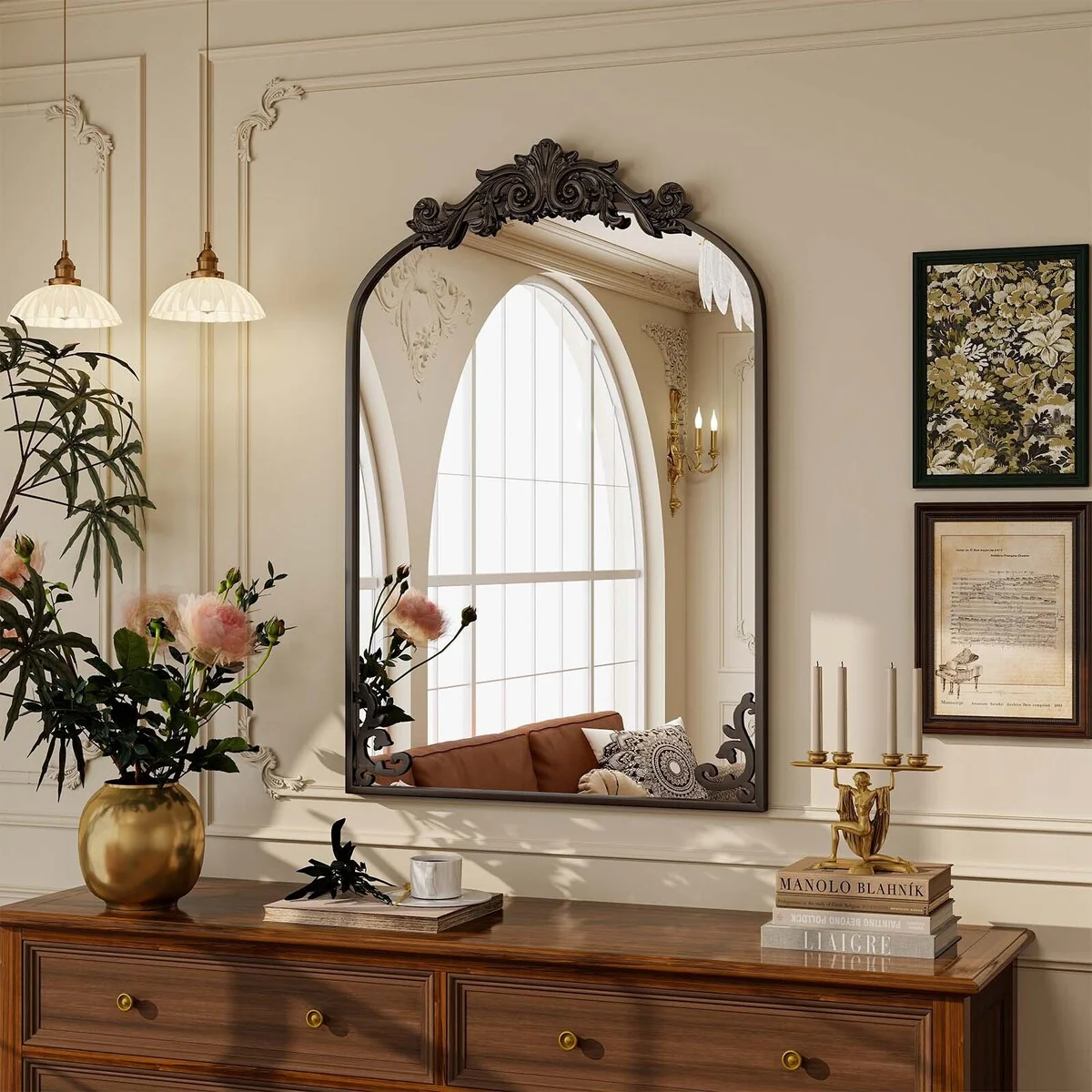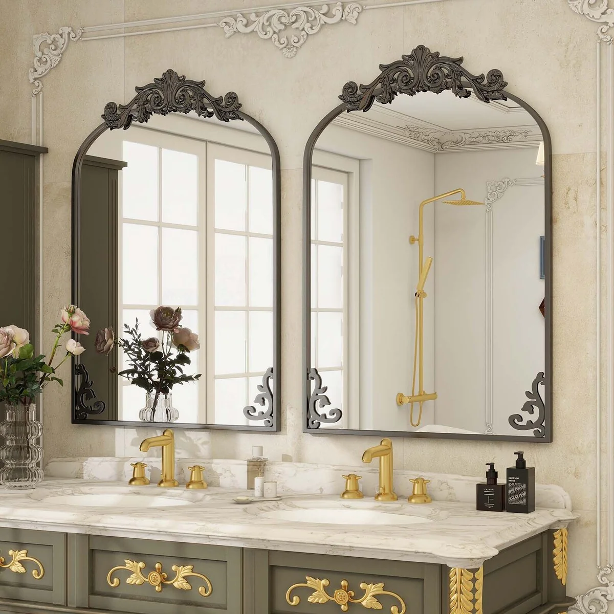 Arched Baroque Bathroom Mirror with Bottom Floral Decor