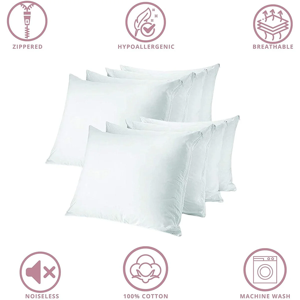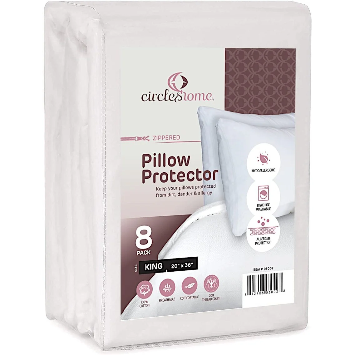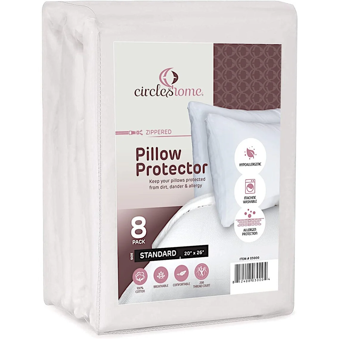 CIRCLESHOME Zippered Pillow Protectors 100% Cotton, Breathable & Quiet (8 Pack)