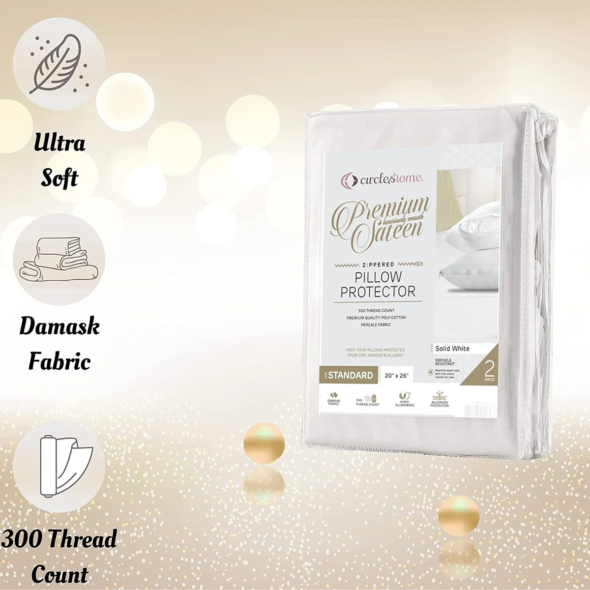CIRCLESHOME Premium Sateen Zippered Pillow Protector, Percale Fabric, 300 Thread Count