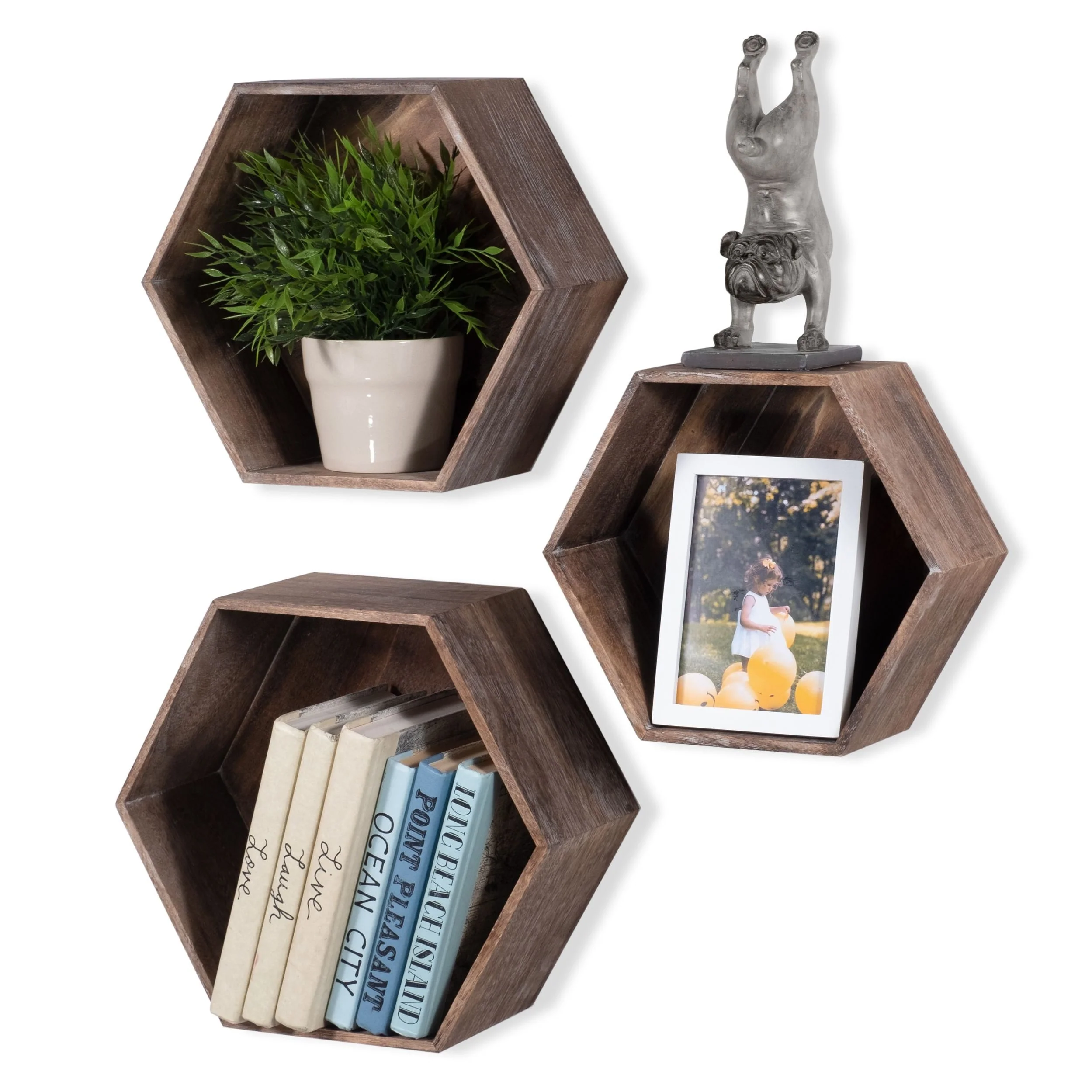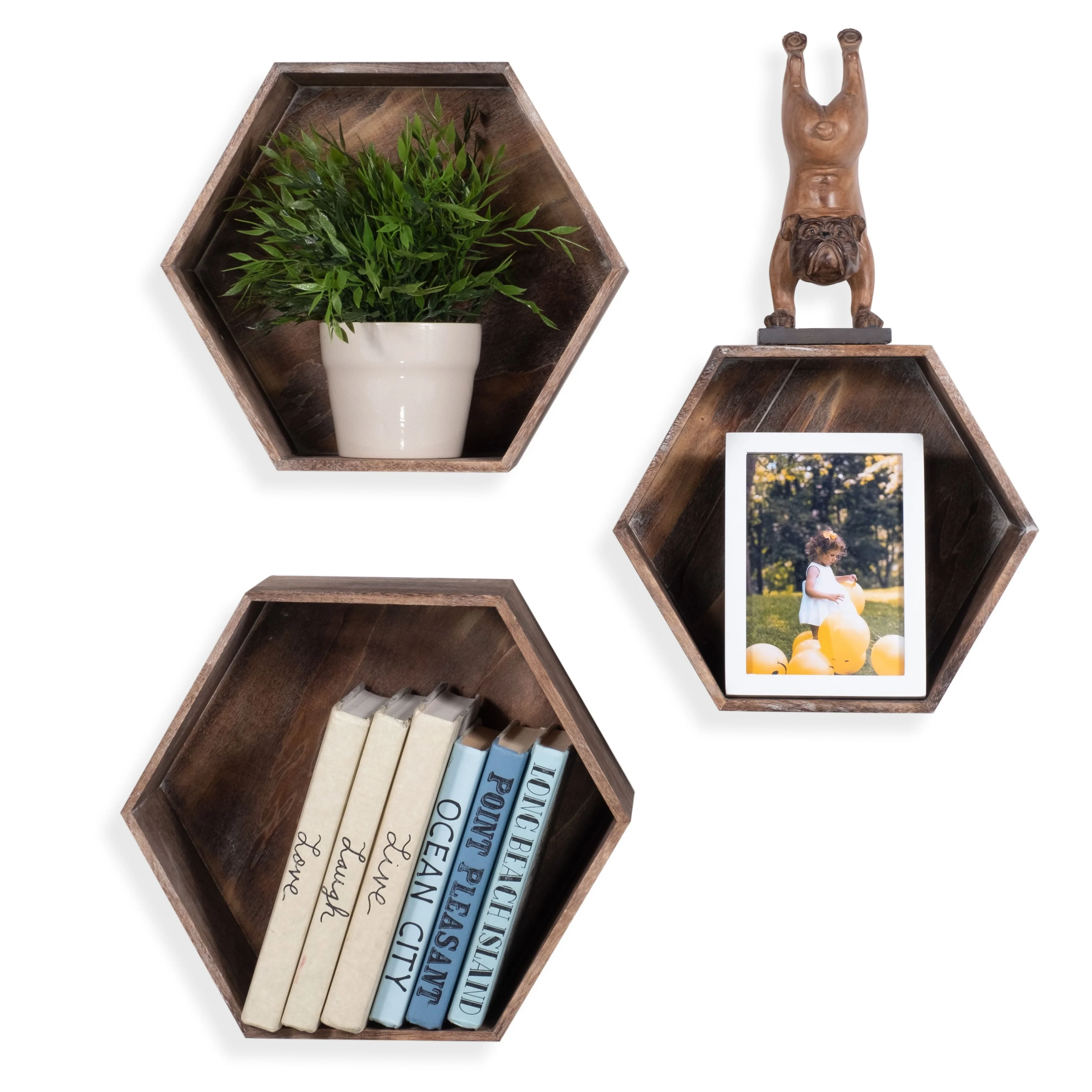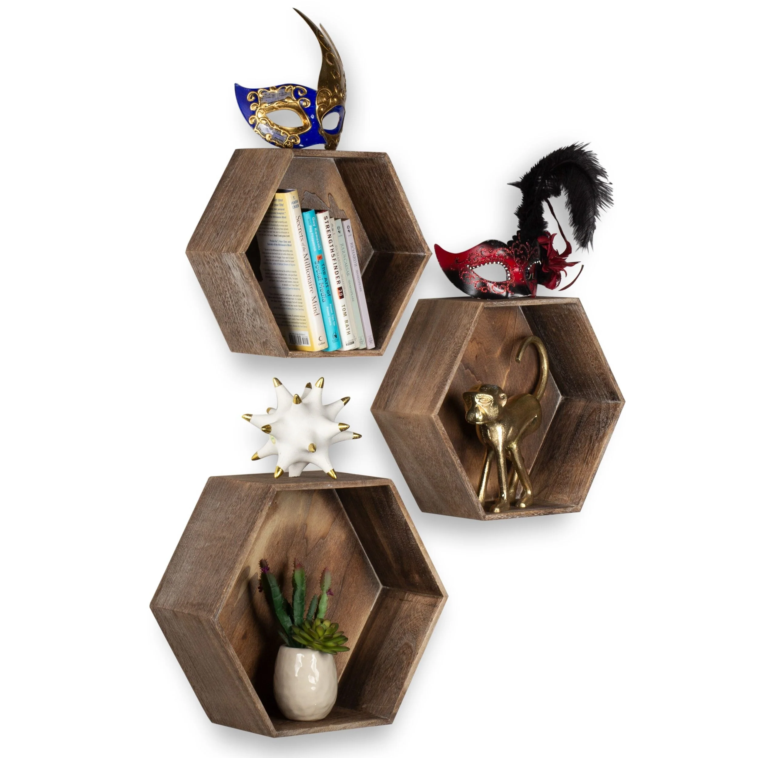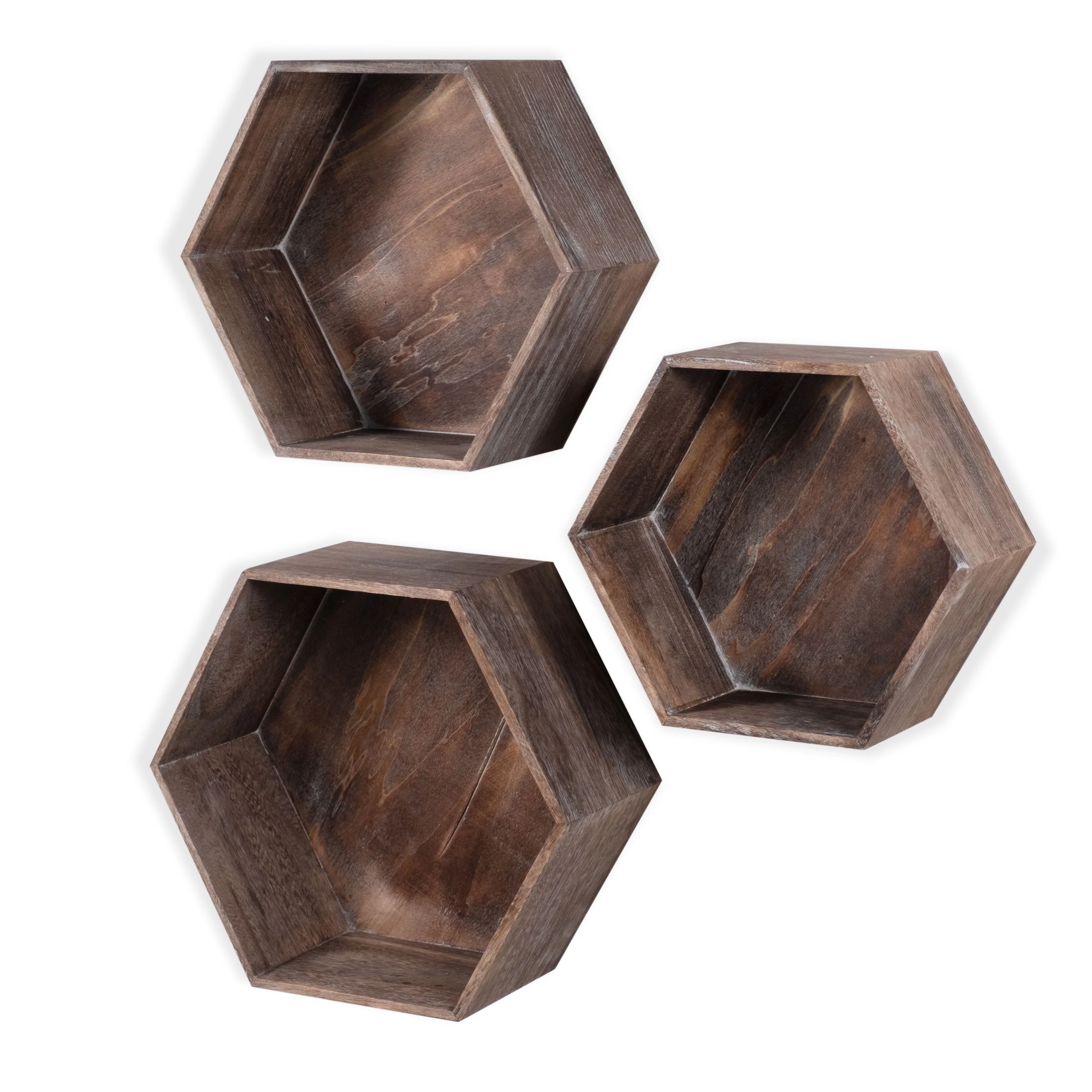 Rustic State Wall Mount Hexagon Wooden Box Shelf Varying Sizes - Pack of 3
