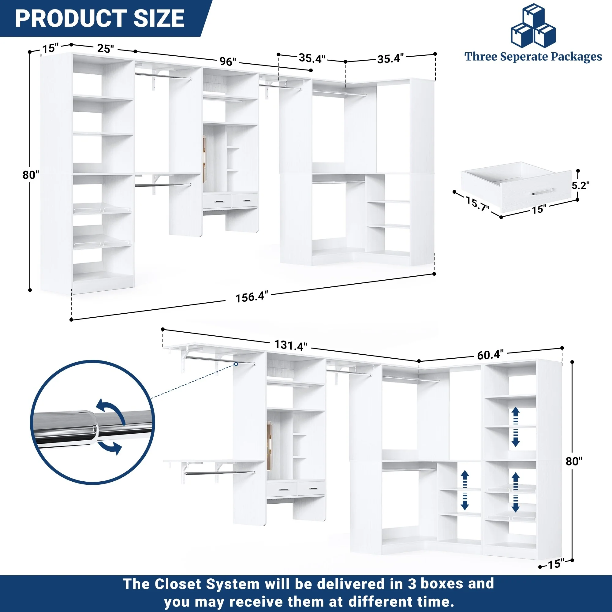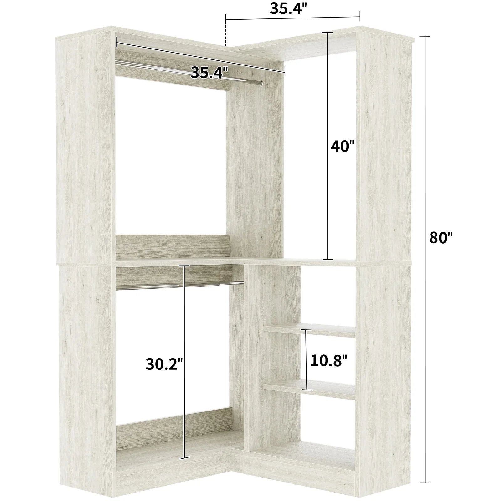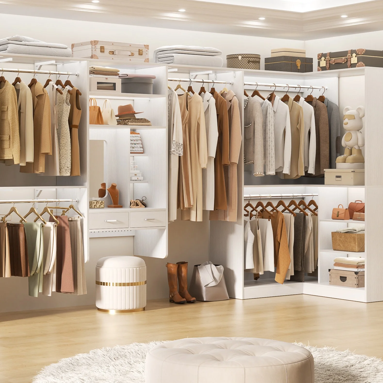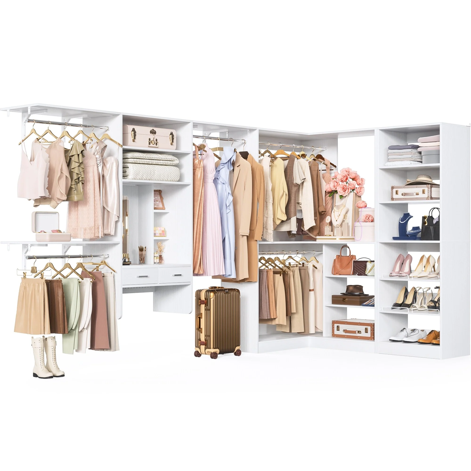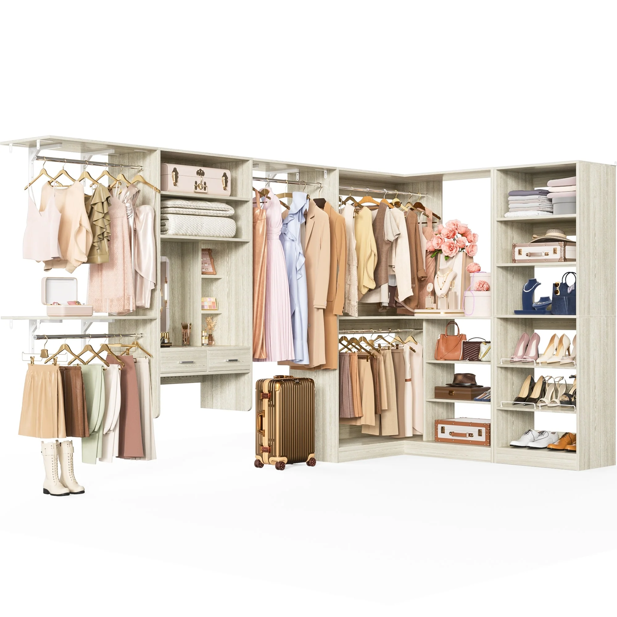 Cimly 131'' - 156'' Closet System with Makeup Vanity, All-in-one Corner Closet Organizer with Shoe Rack and Tower Shelves