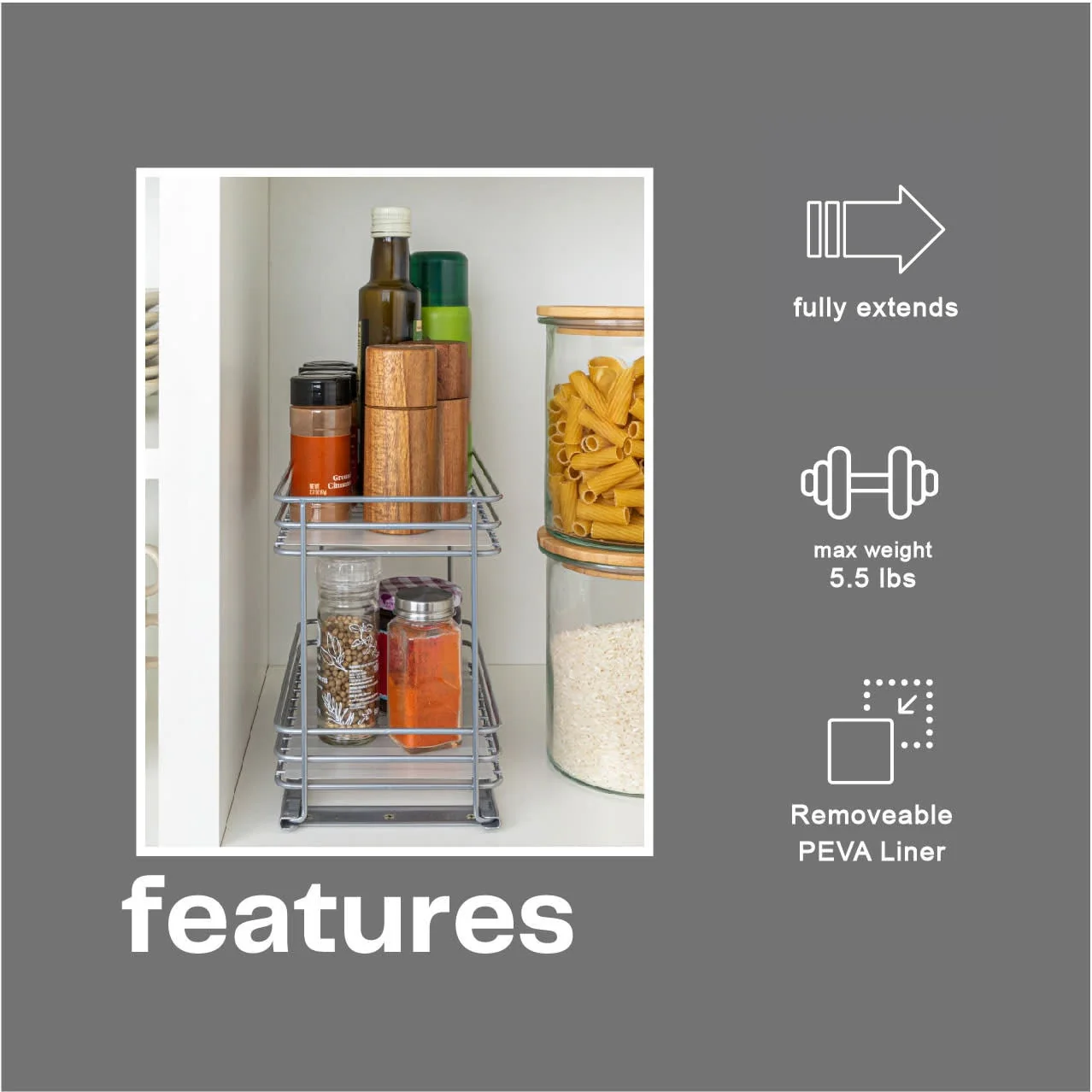 Household Essentials 2-Tier Brushed Nickel Spice Rack Organizer, Sliding Pantry Organizer