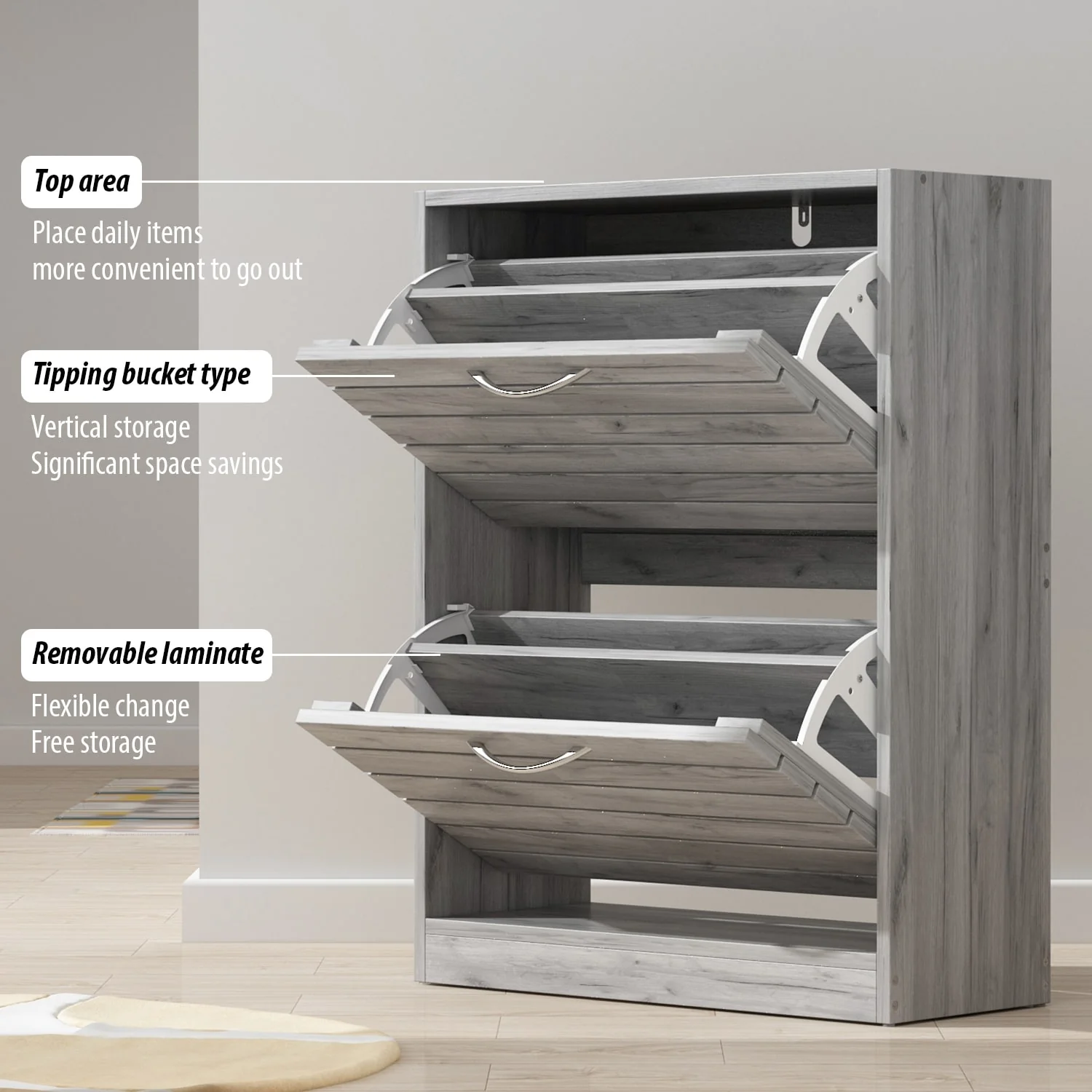 Shoe Storage Cabinet Two Drawer Space Saving Grey/Oak/White Dresser