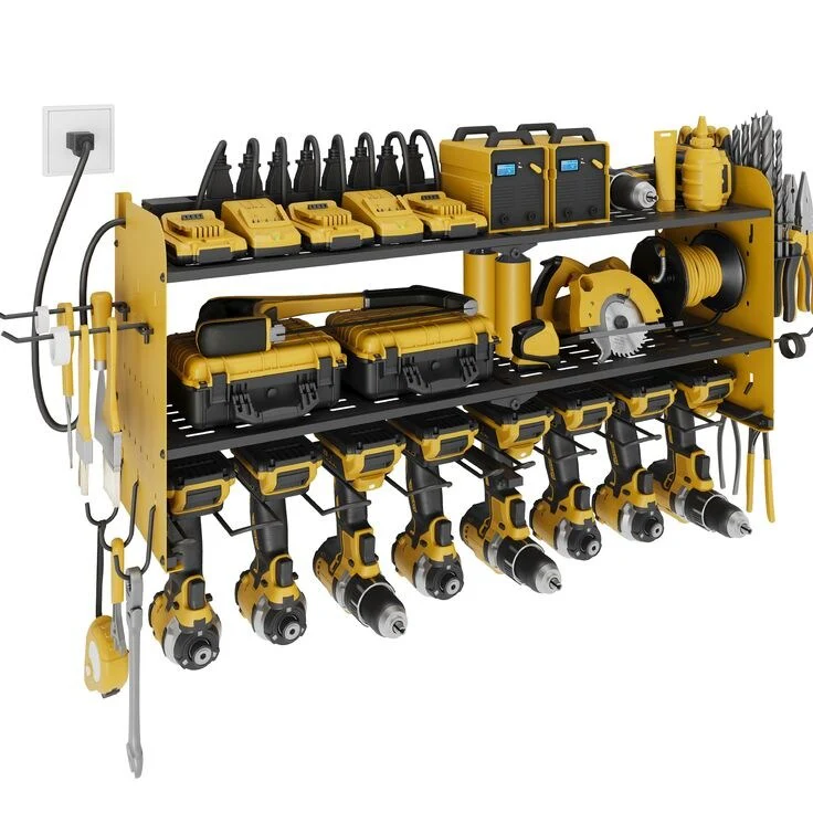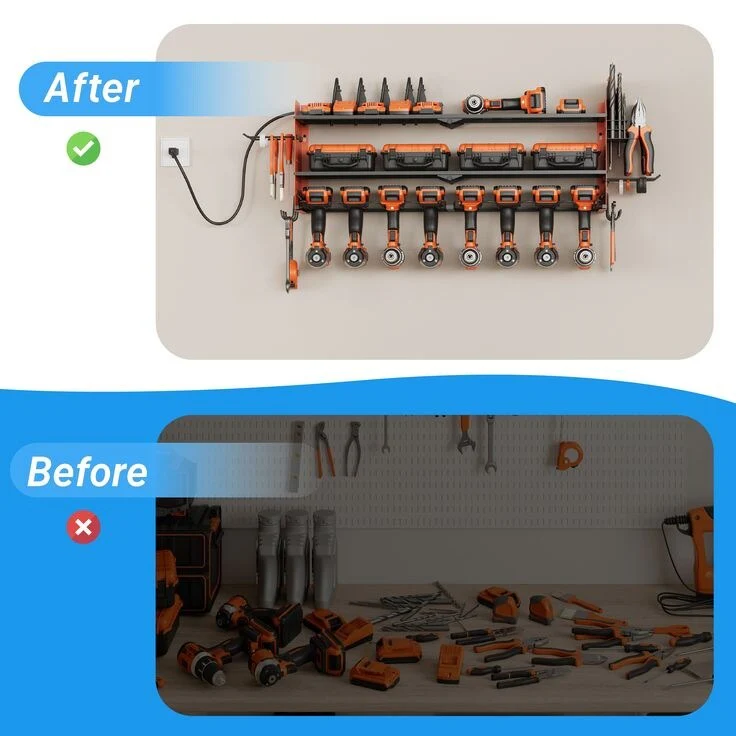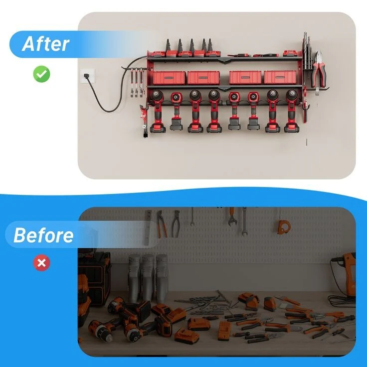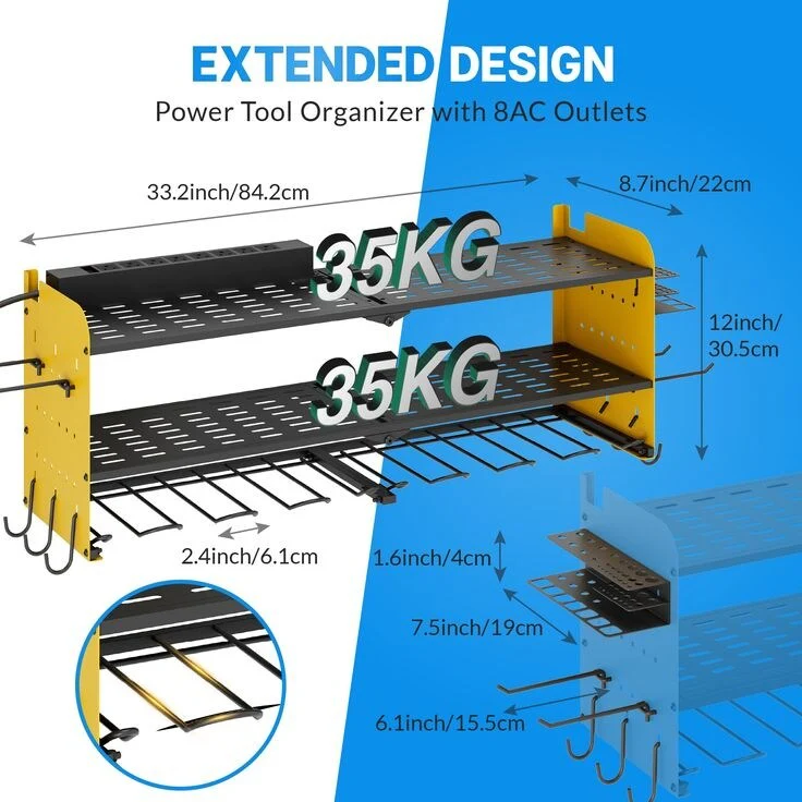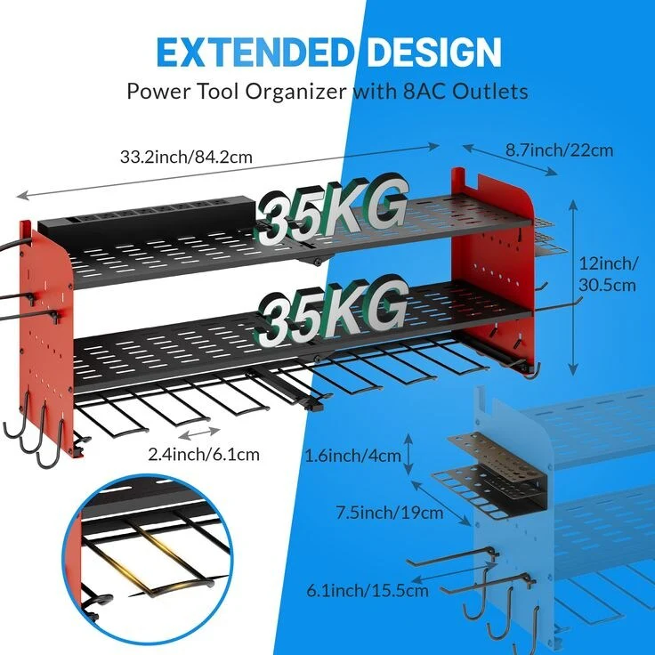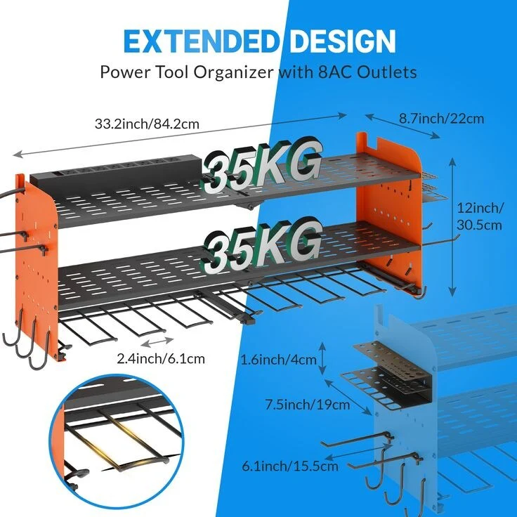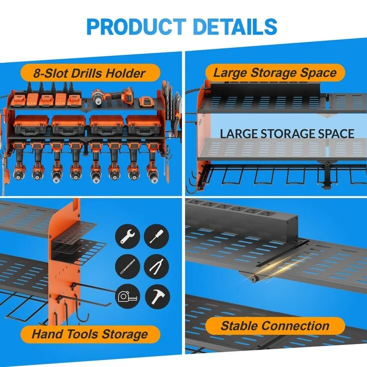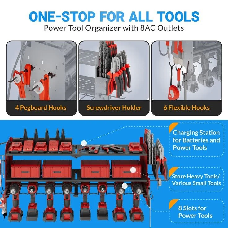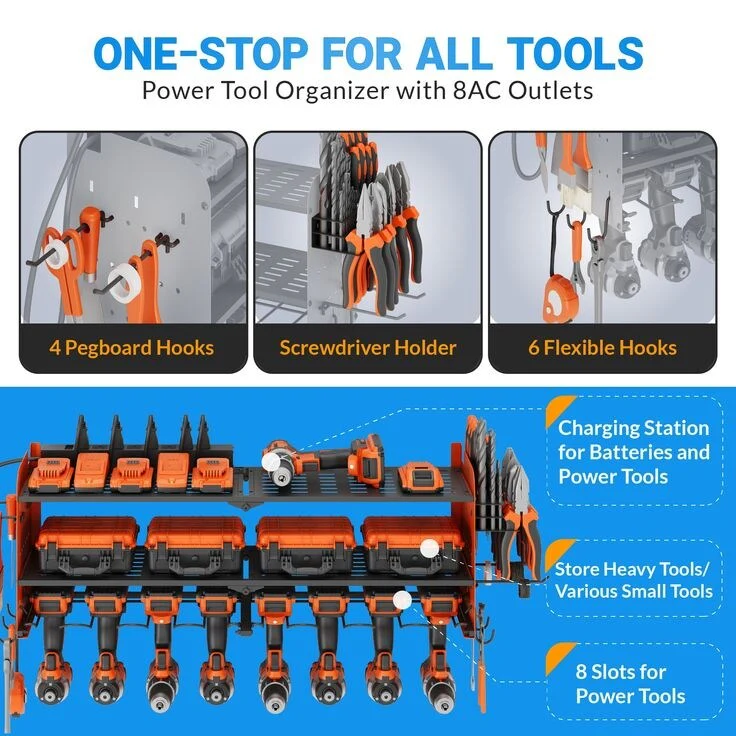 Power Tool Organizer with Charging Station Garage 8 Drill Holders Wall Mount with 8 Outlets Power Strip