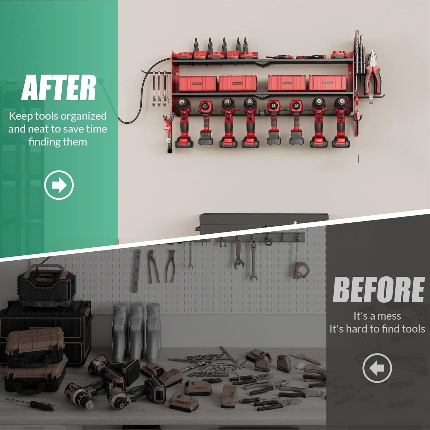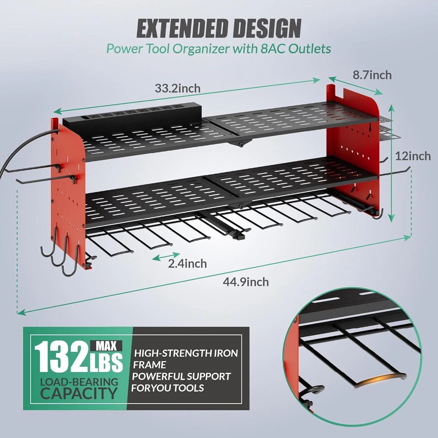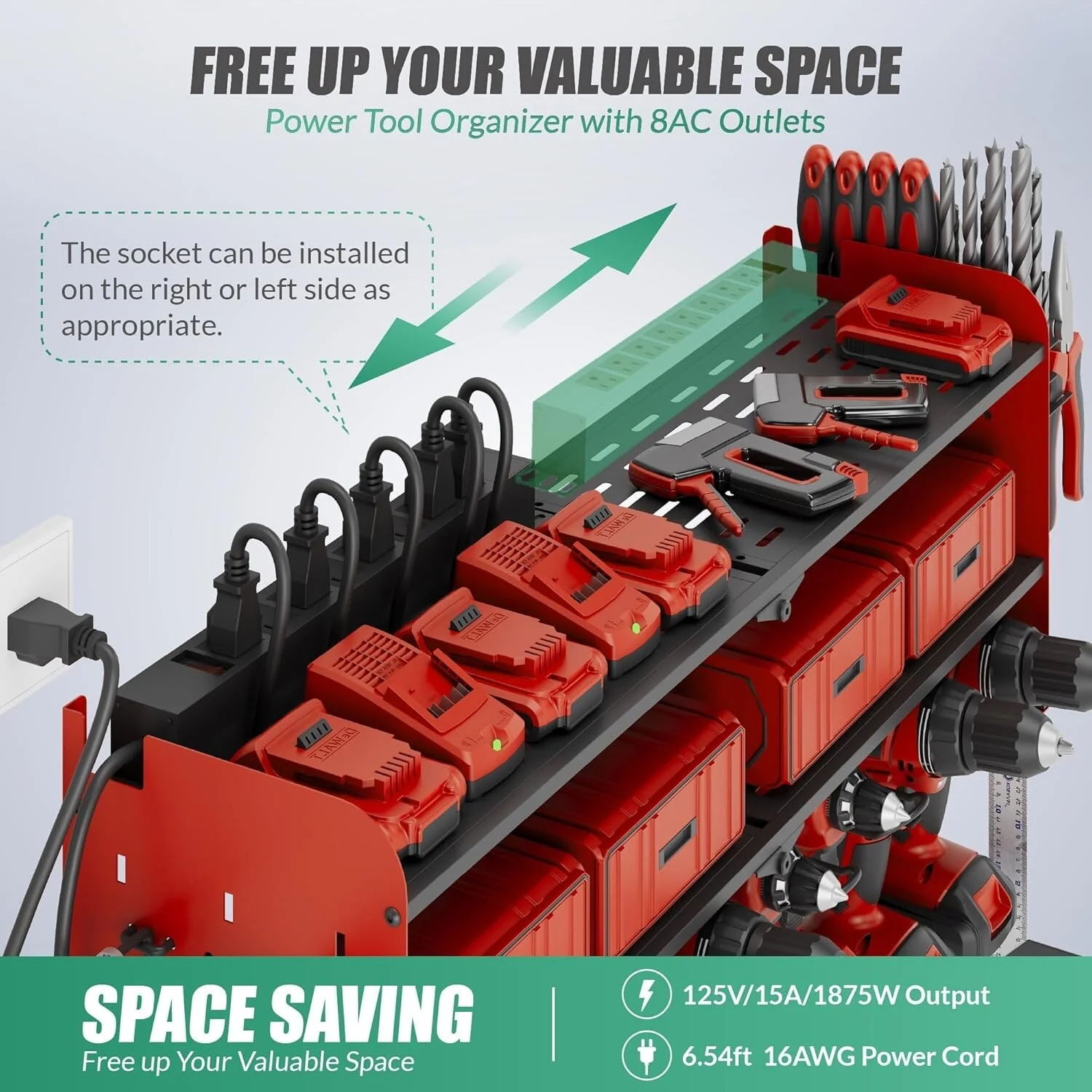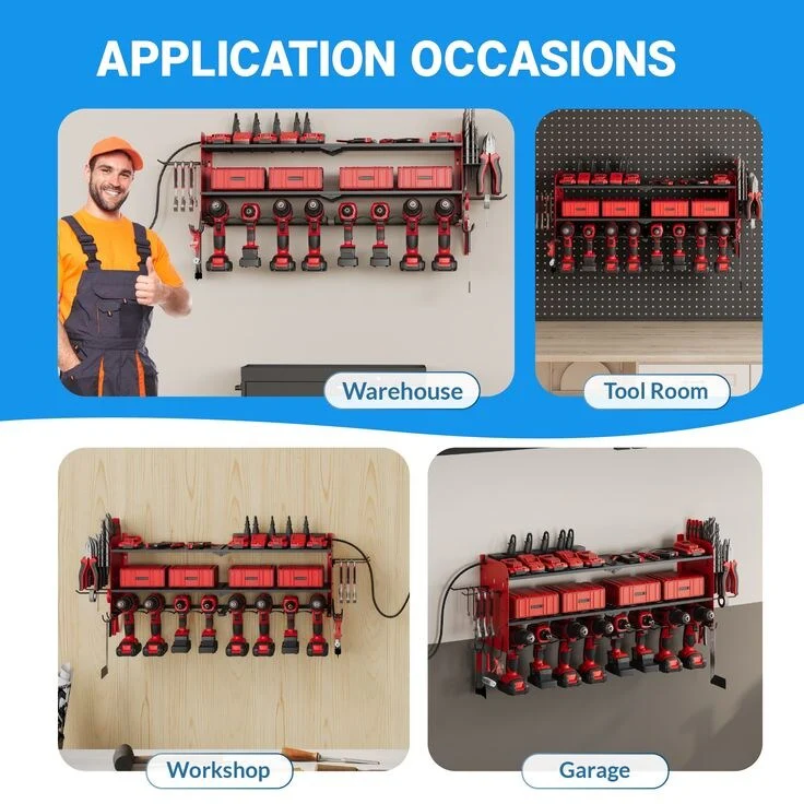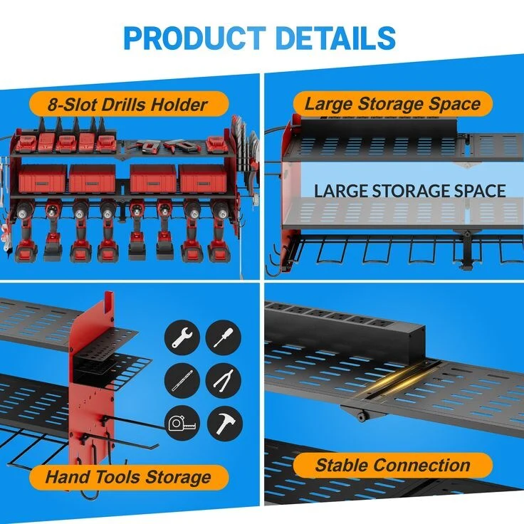 Power Tool Organizer with Charging Station Garage 8 Drill Holders Wall Mount with 8 Outlets Power Strip