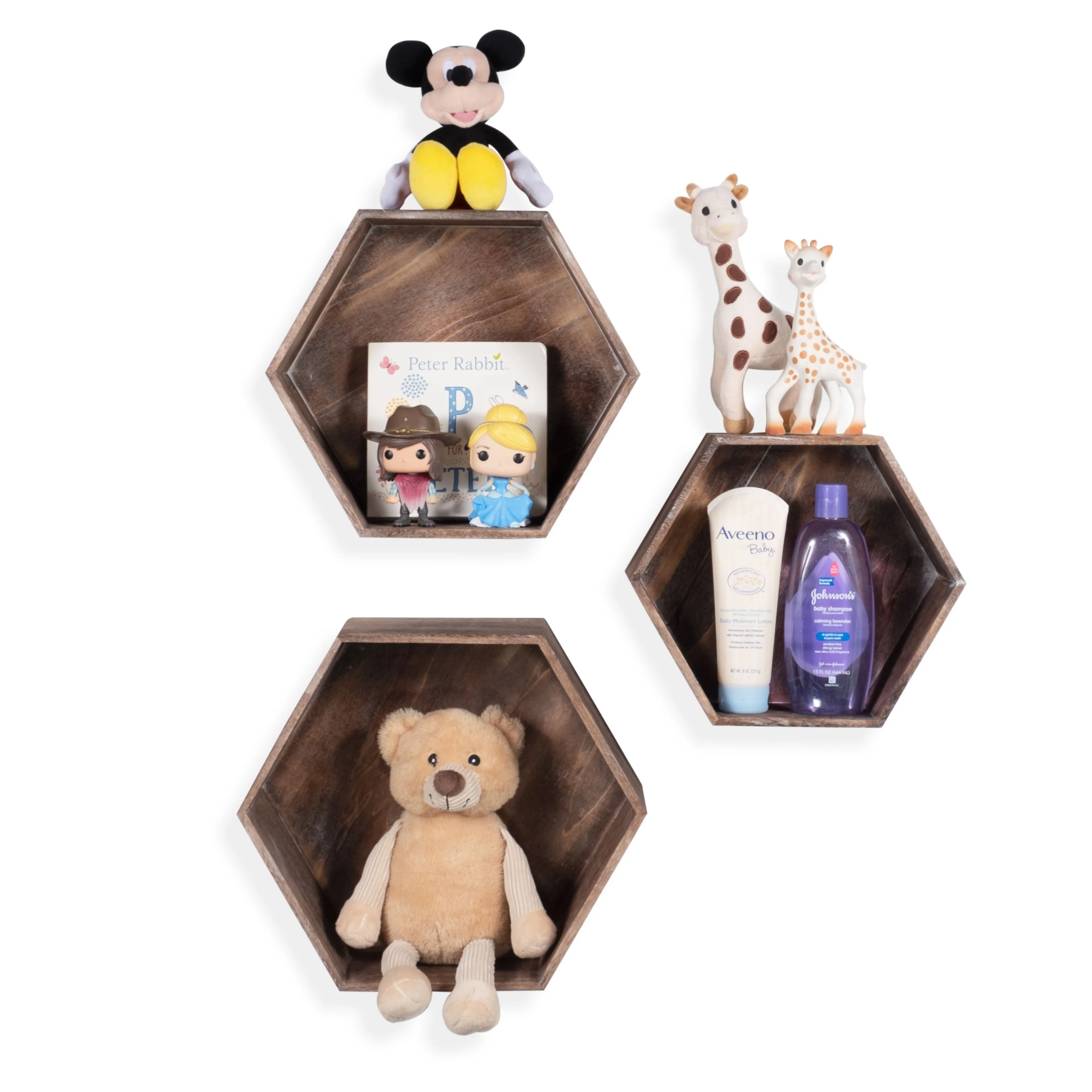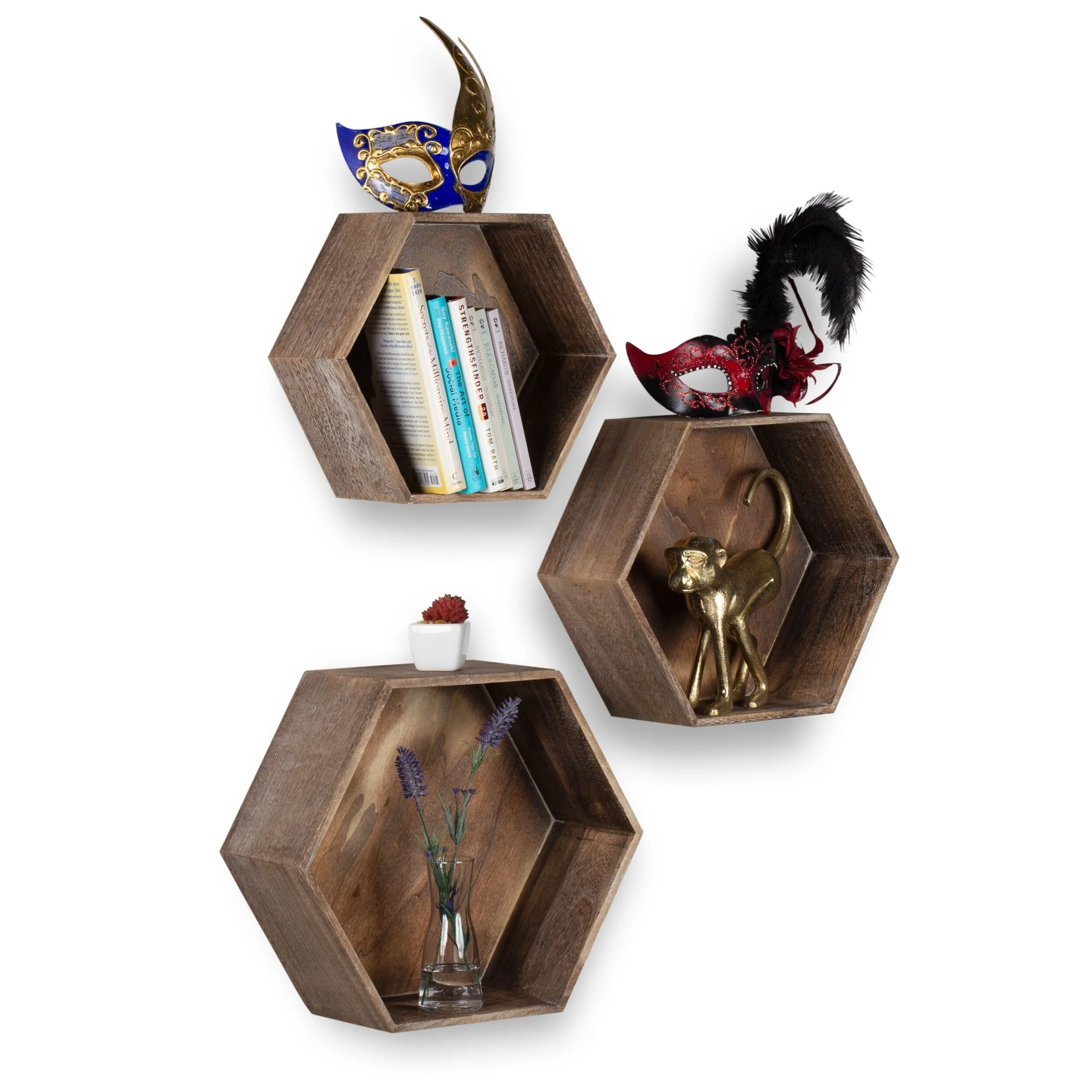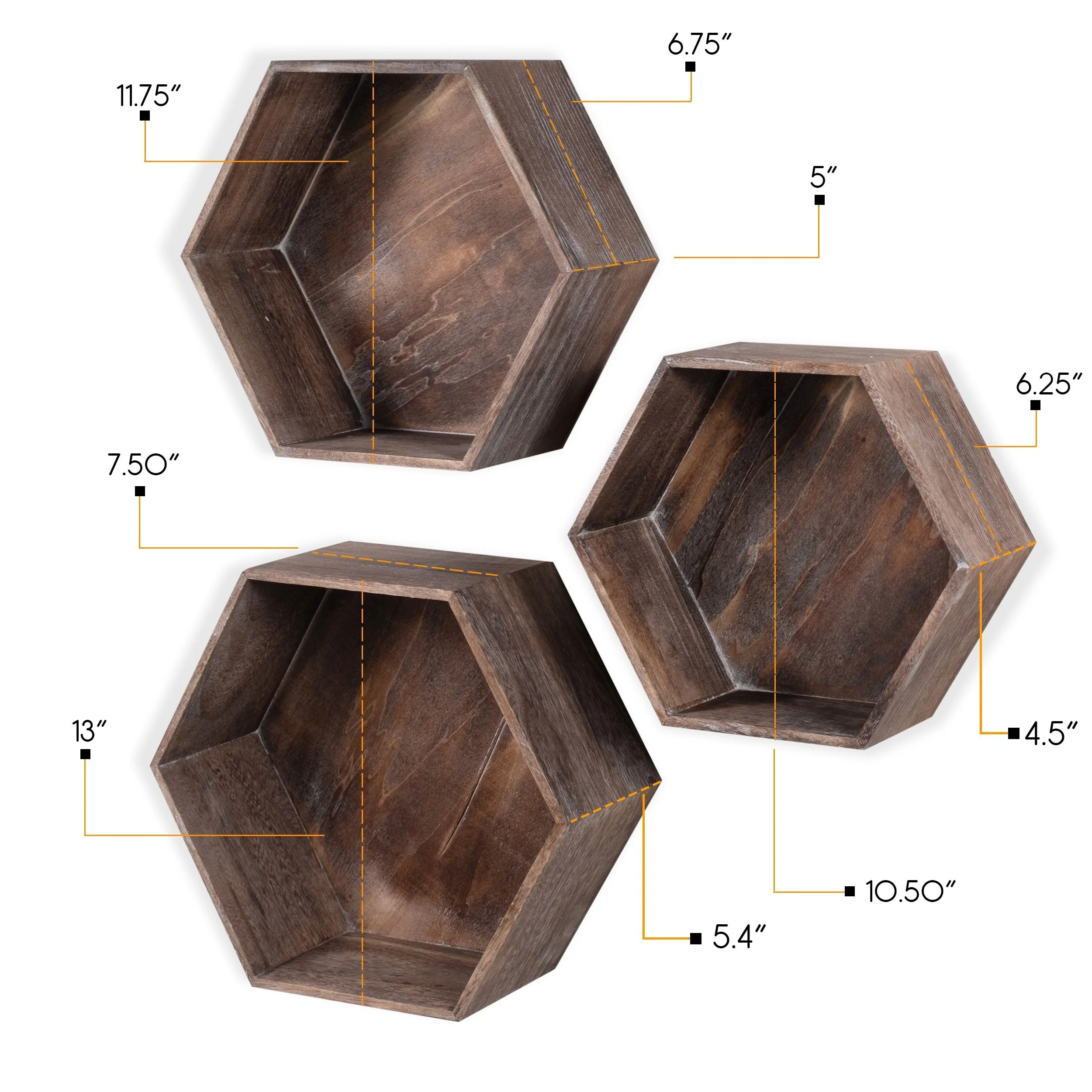 Rustic State Wall Mount Hexagon Wooden Box Shelf Varying Sizes - Pack of 3