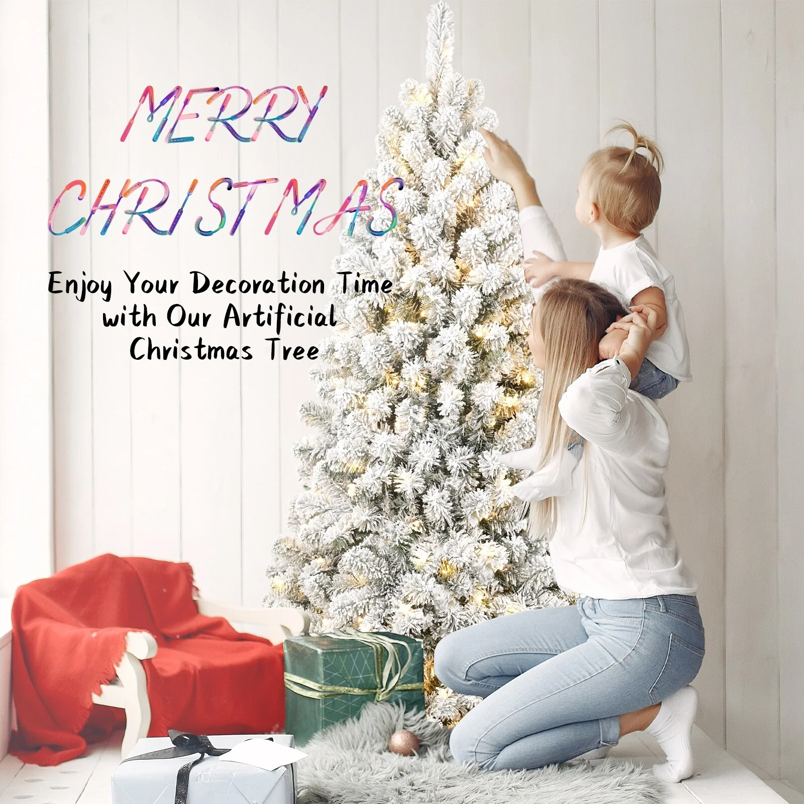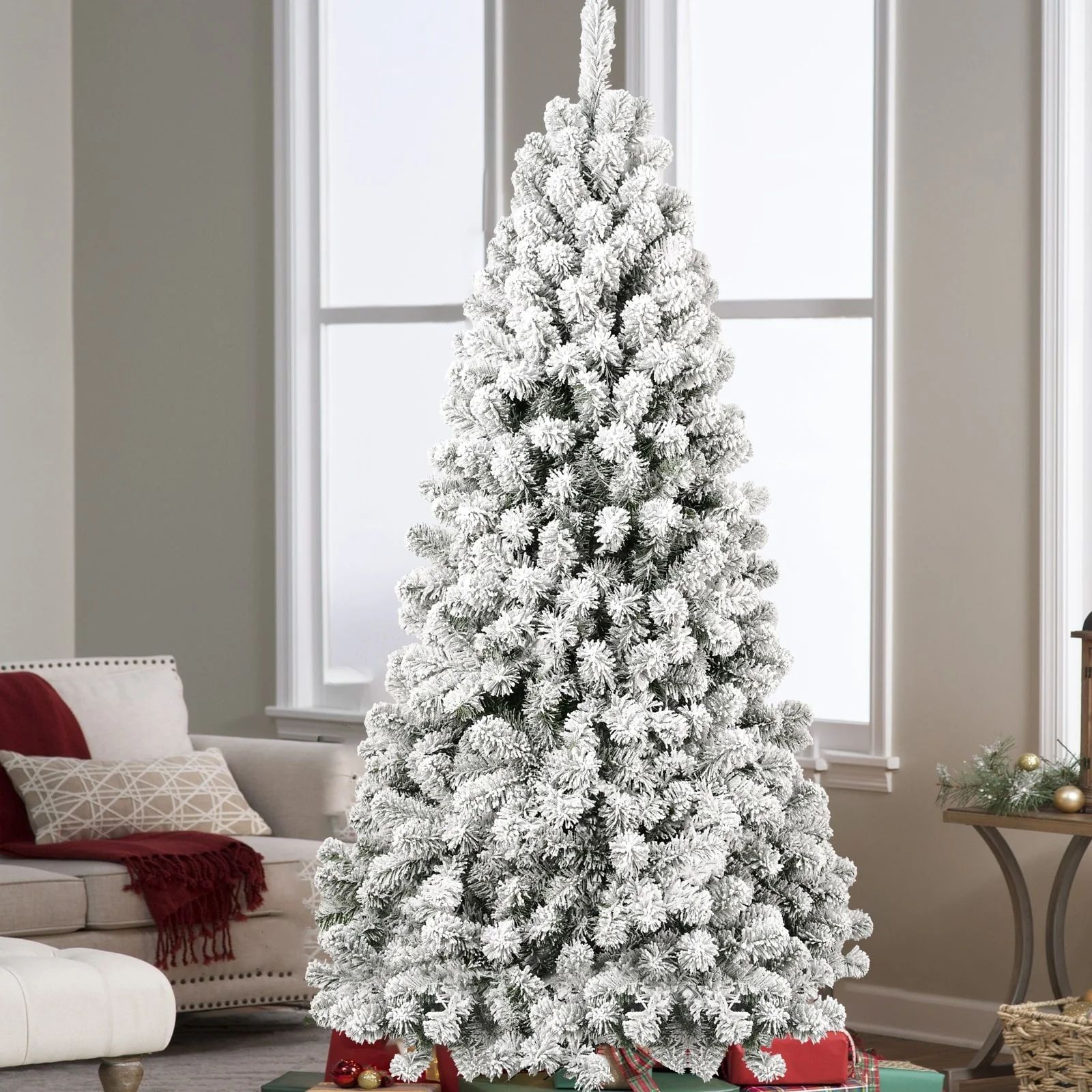 Snow-Flocked Pre-Lit Christmas Tree with Memory Wire Tips and 300-400 Warm Lights, Easy Setup for Indoor Holiday Display