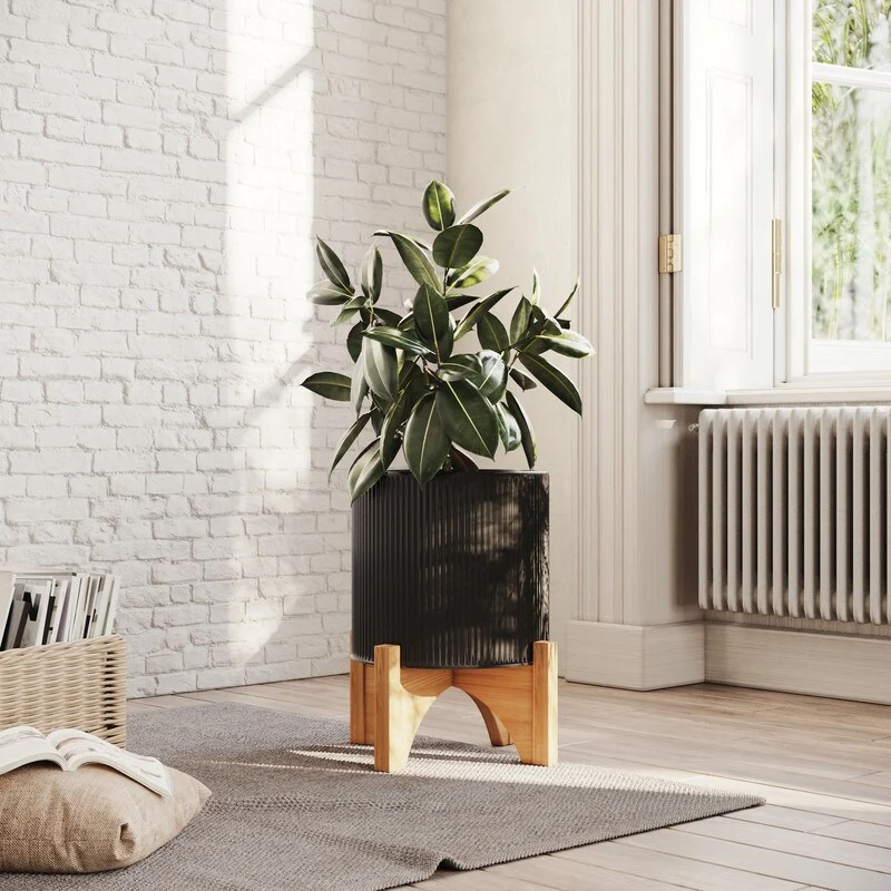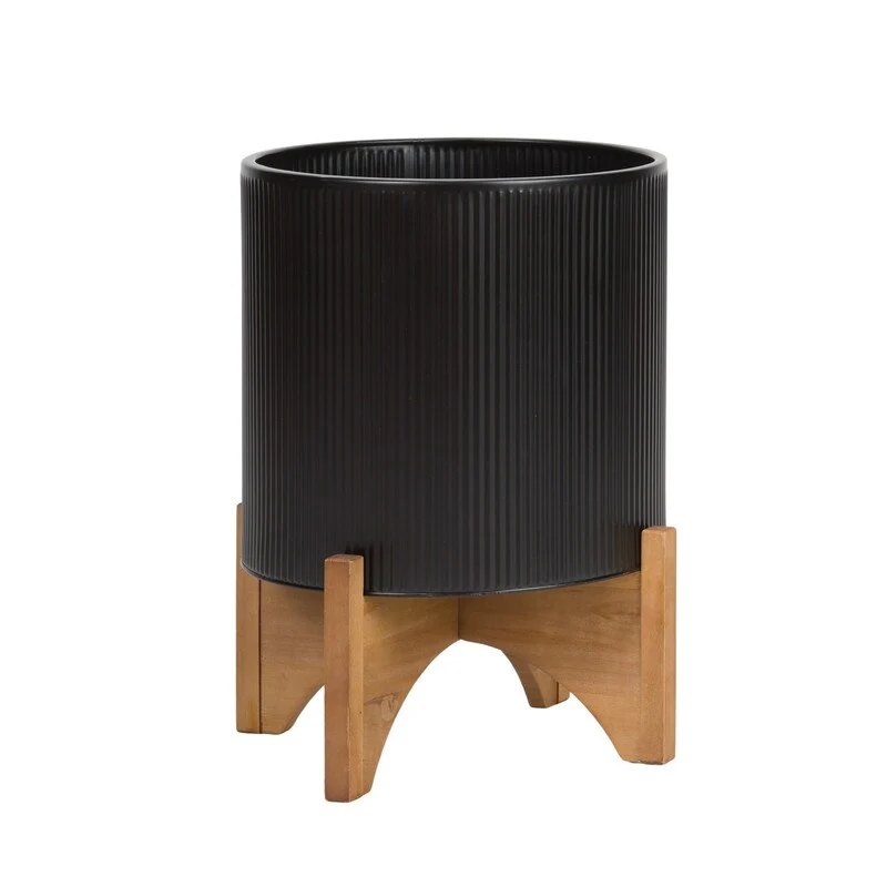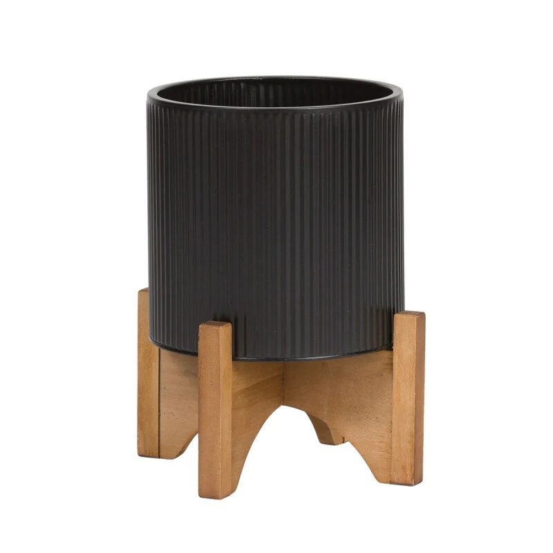 Everett Black Mid-Century Modern Indoor Metal Pot Planter with Arch Wood Base