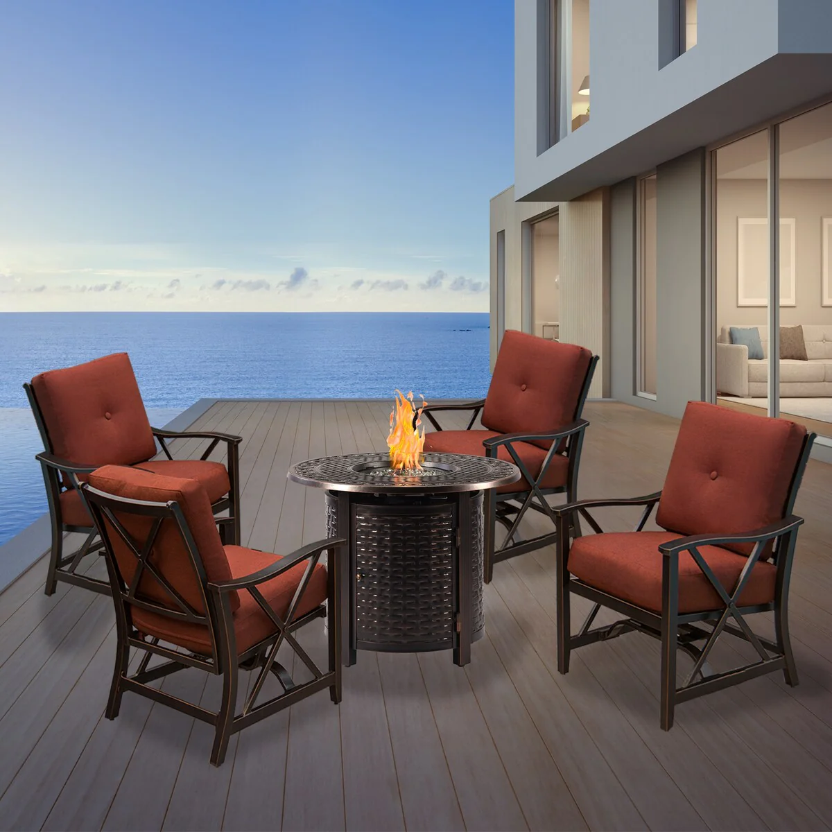 Aluminum 34-in Round Antique Copper Fire Table Set with Four Deep Seating Rocking Chairs with Accessories