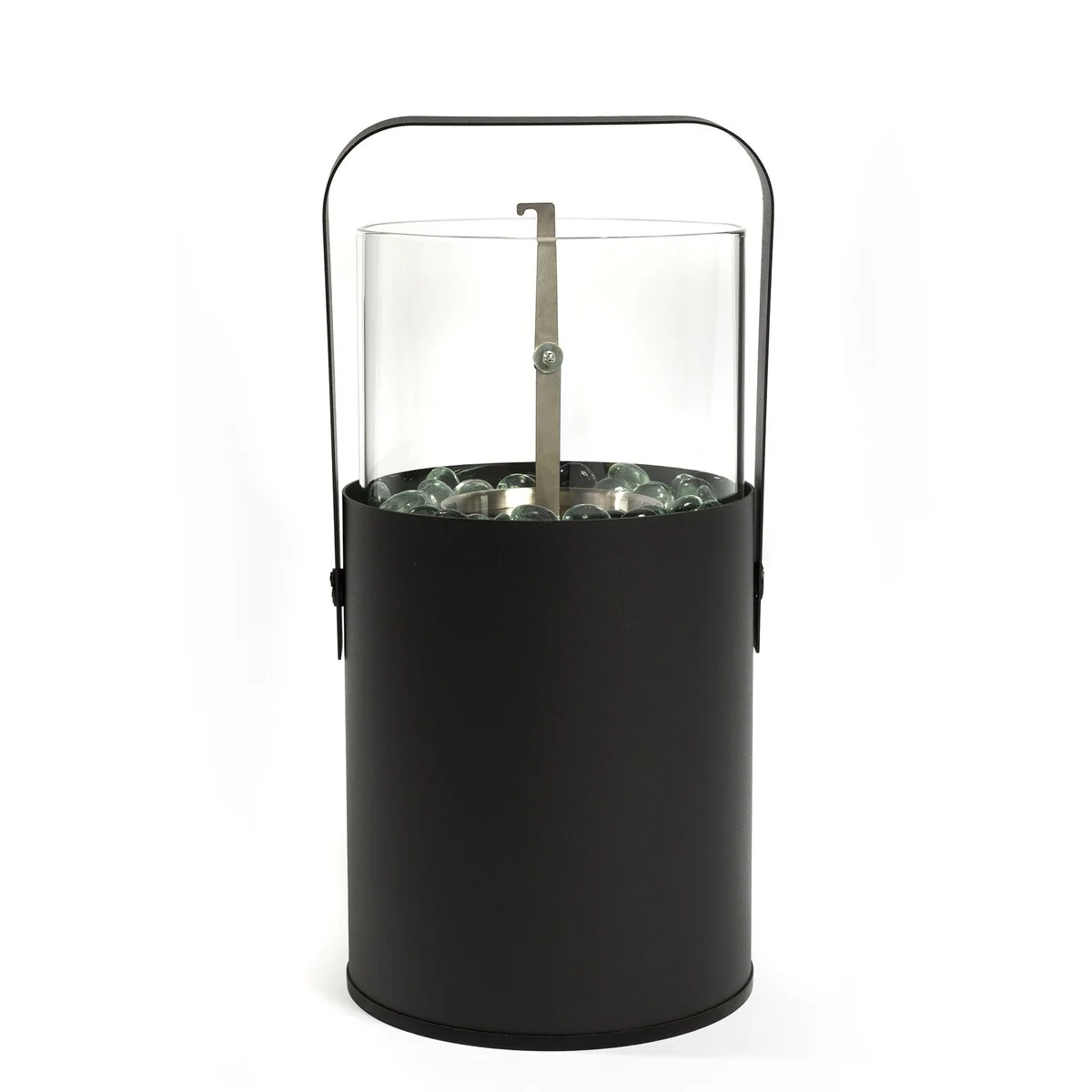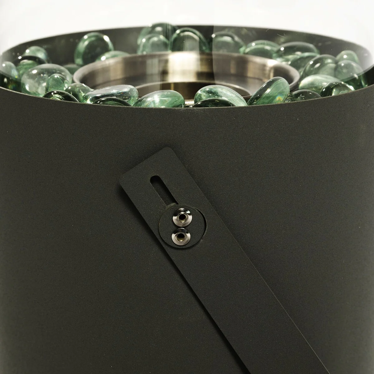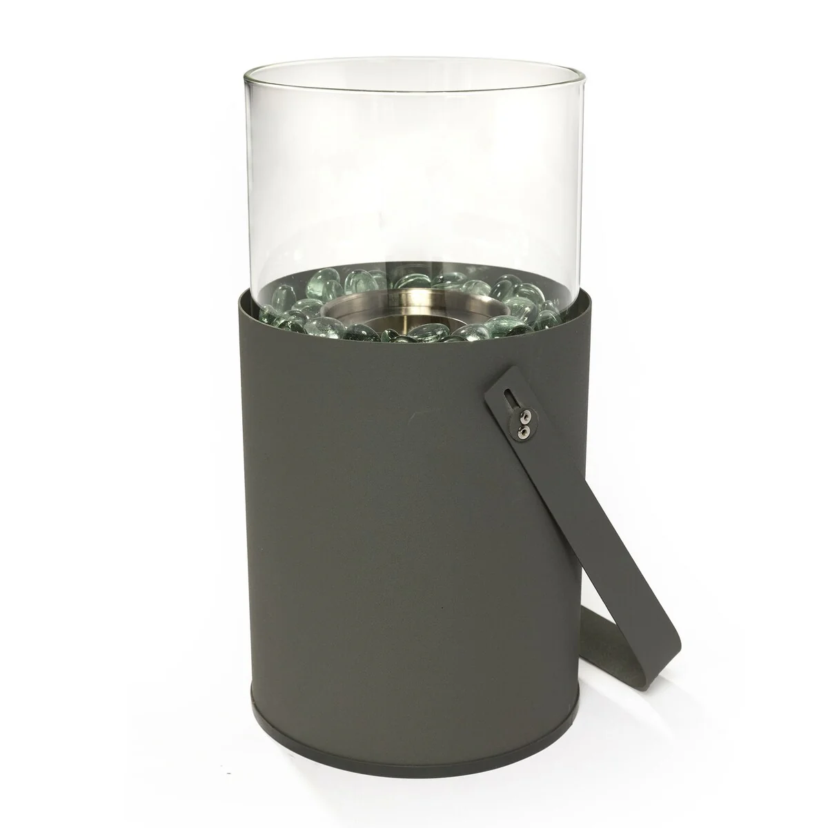 Patio Watcher iron outdoor fire pit table with gas tank cover, lid, and glass wind guard