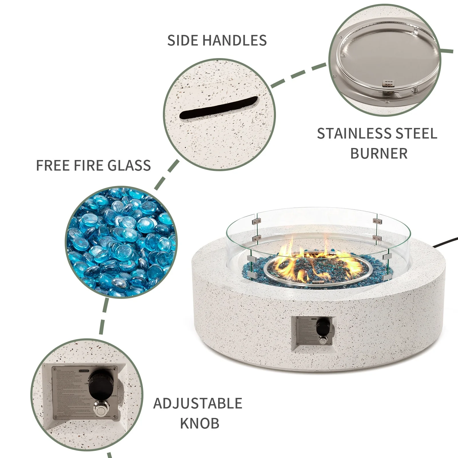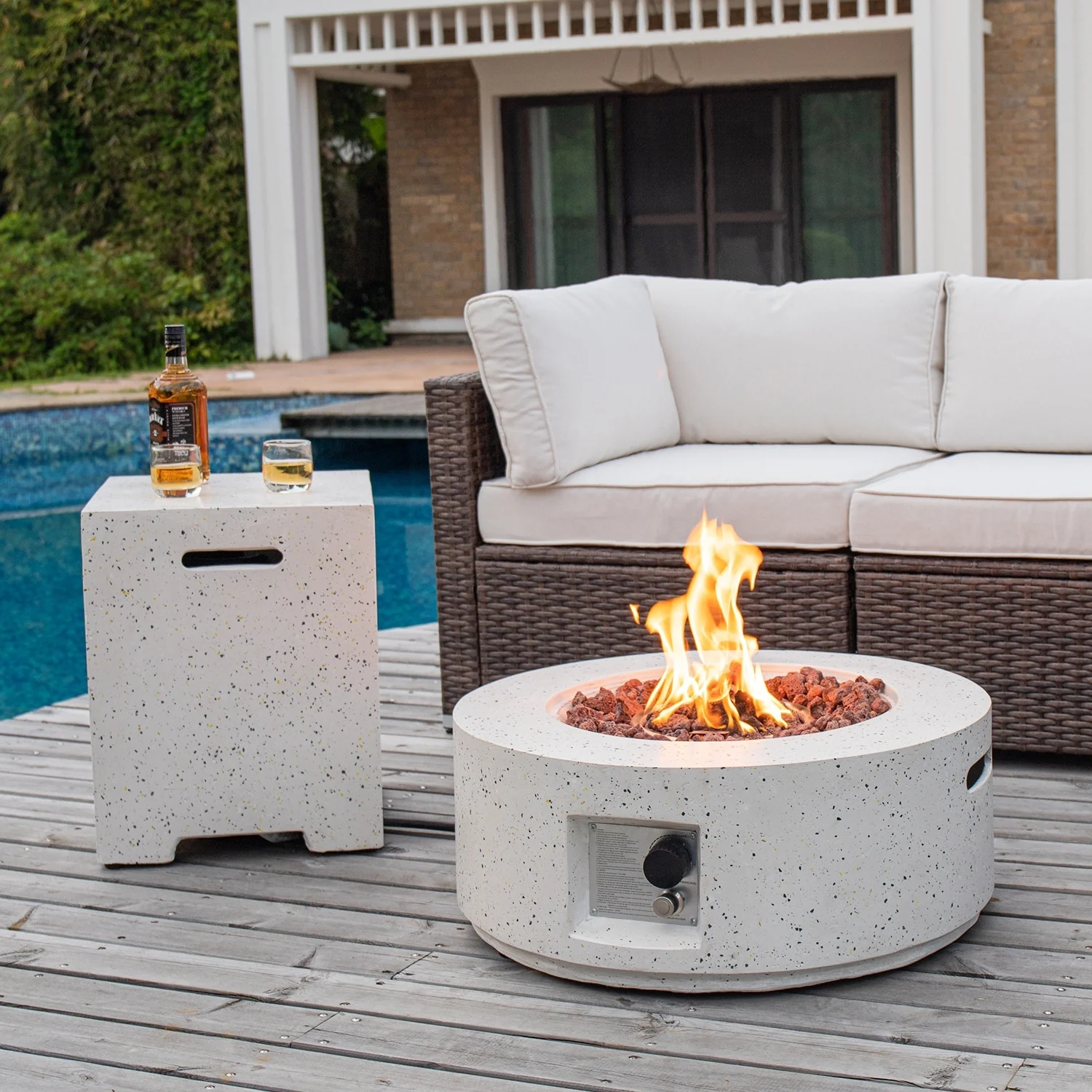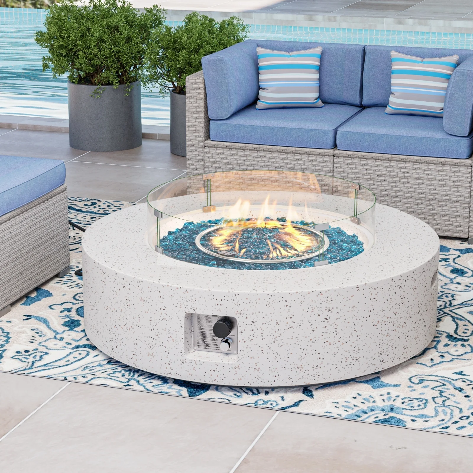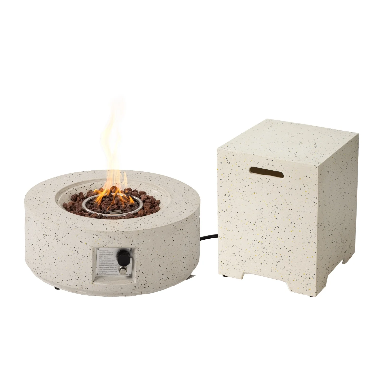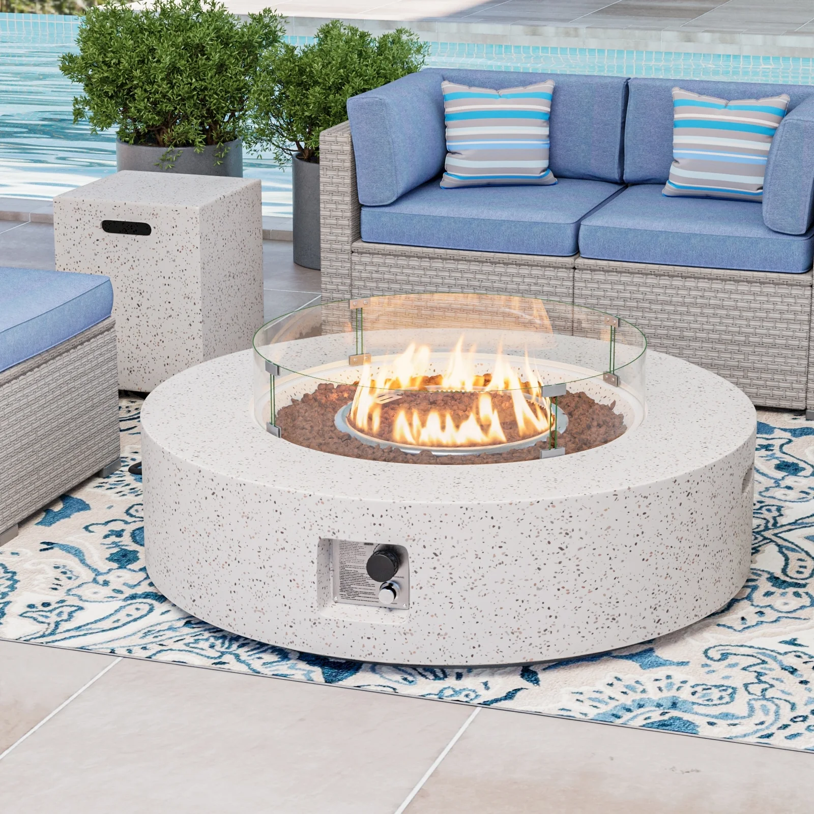 Round Terrazzo Outdoor Firepit with Propane Tank Cover & Wind Guard