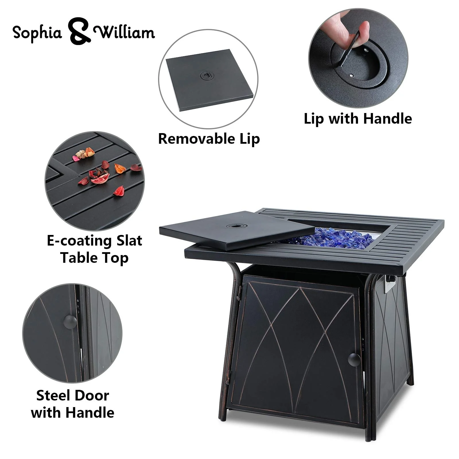 Gas Fire Pit Table, 28 Inch 50,000BTU Progane Fire Pits Table with Blue Fire Glass and Lid, Black