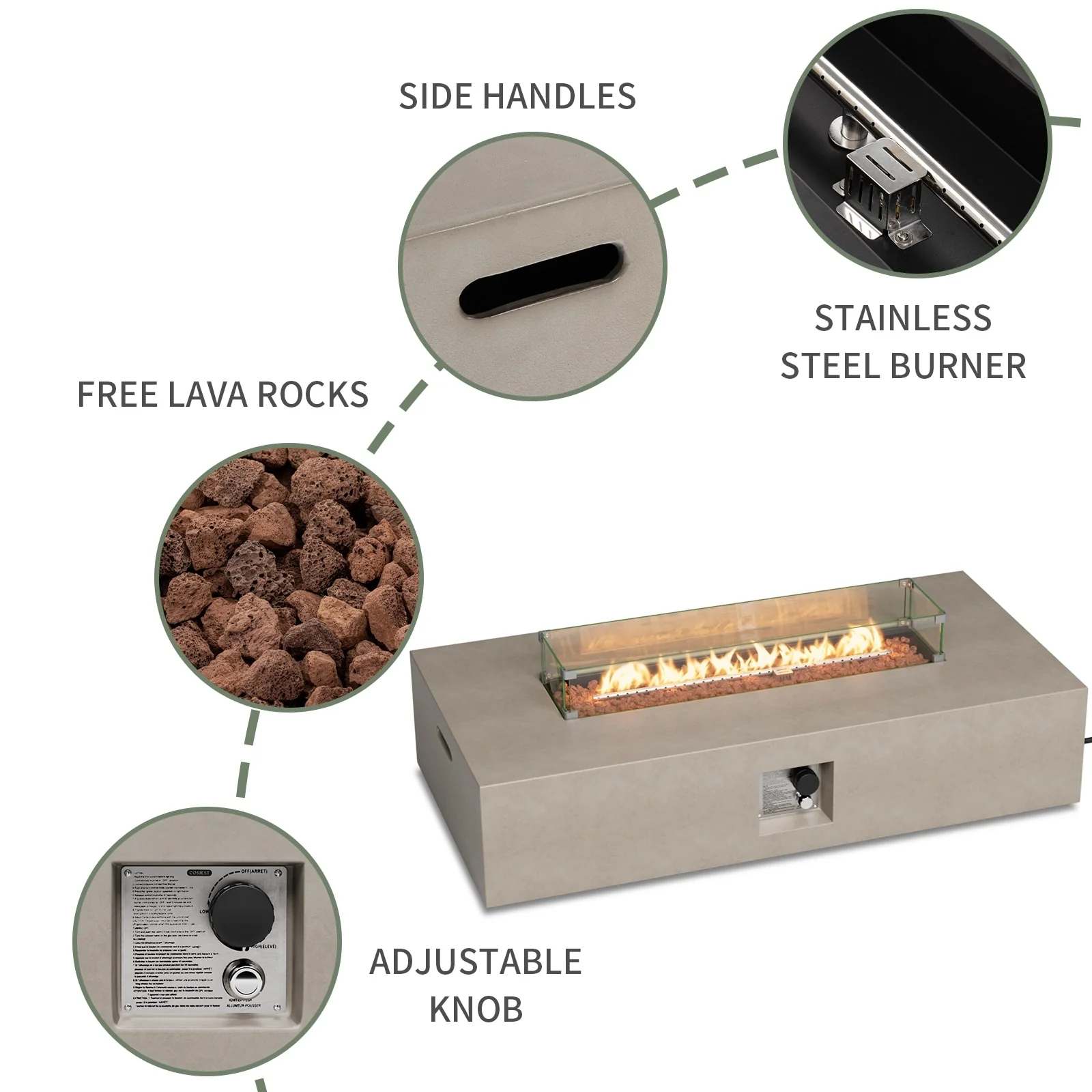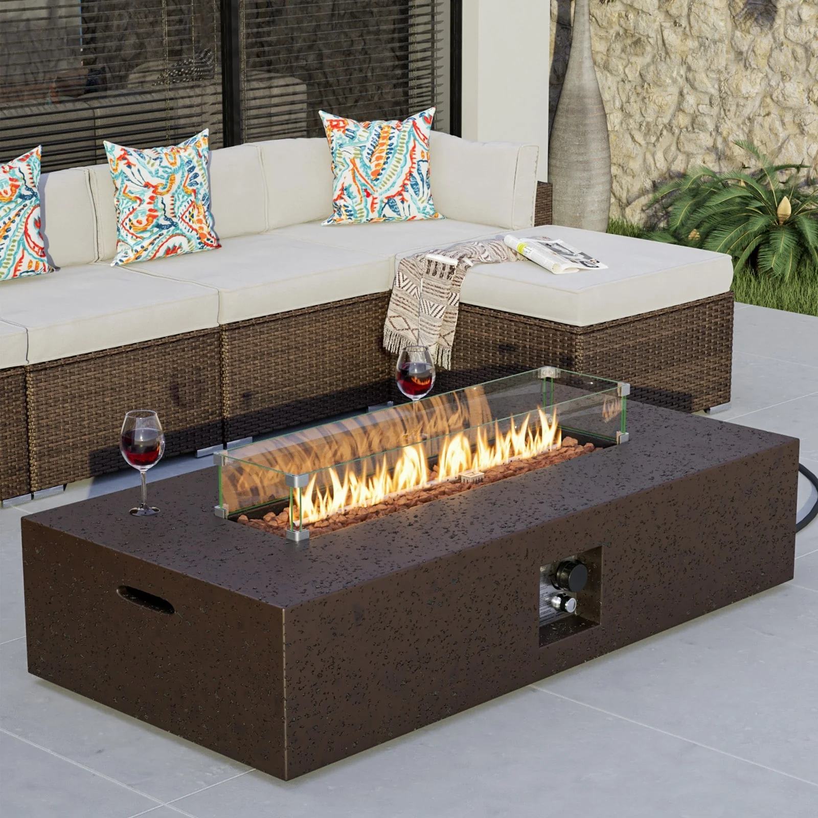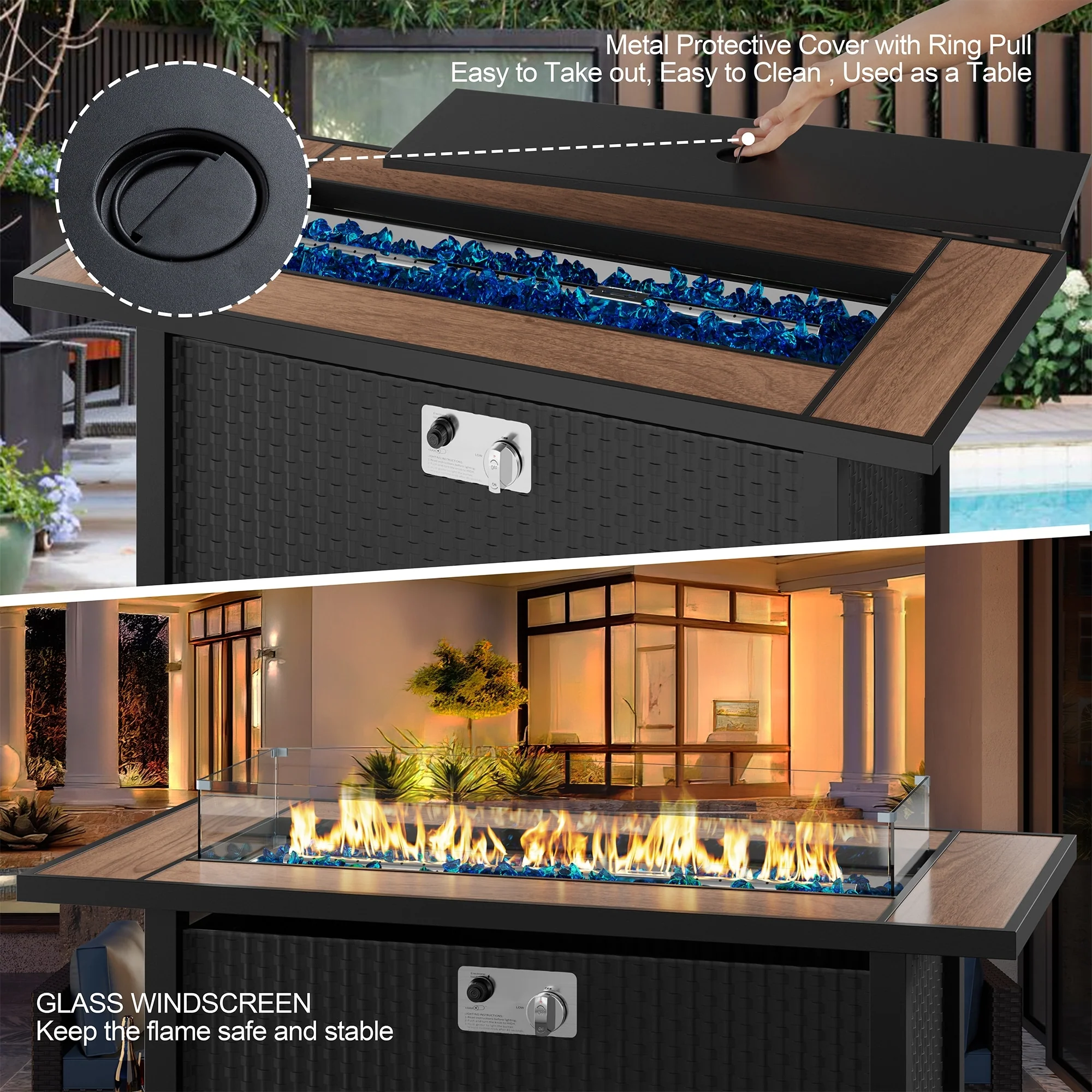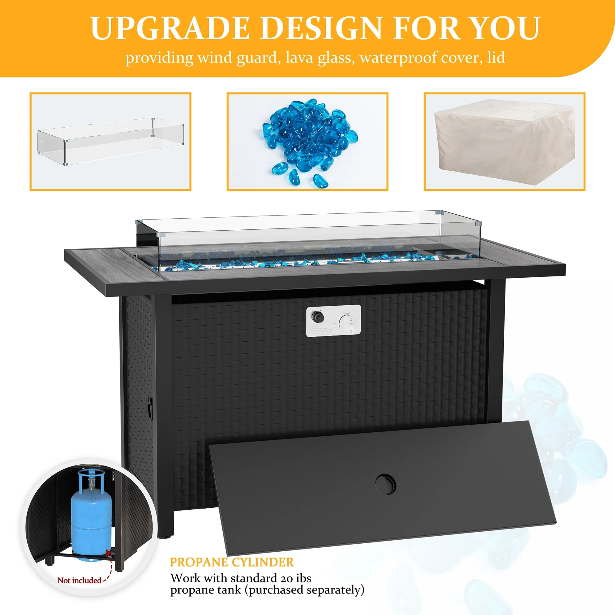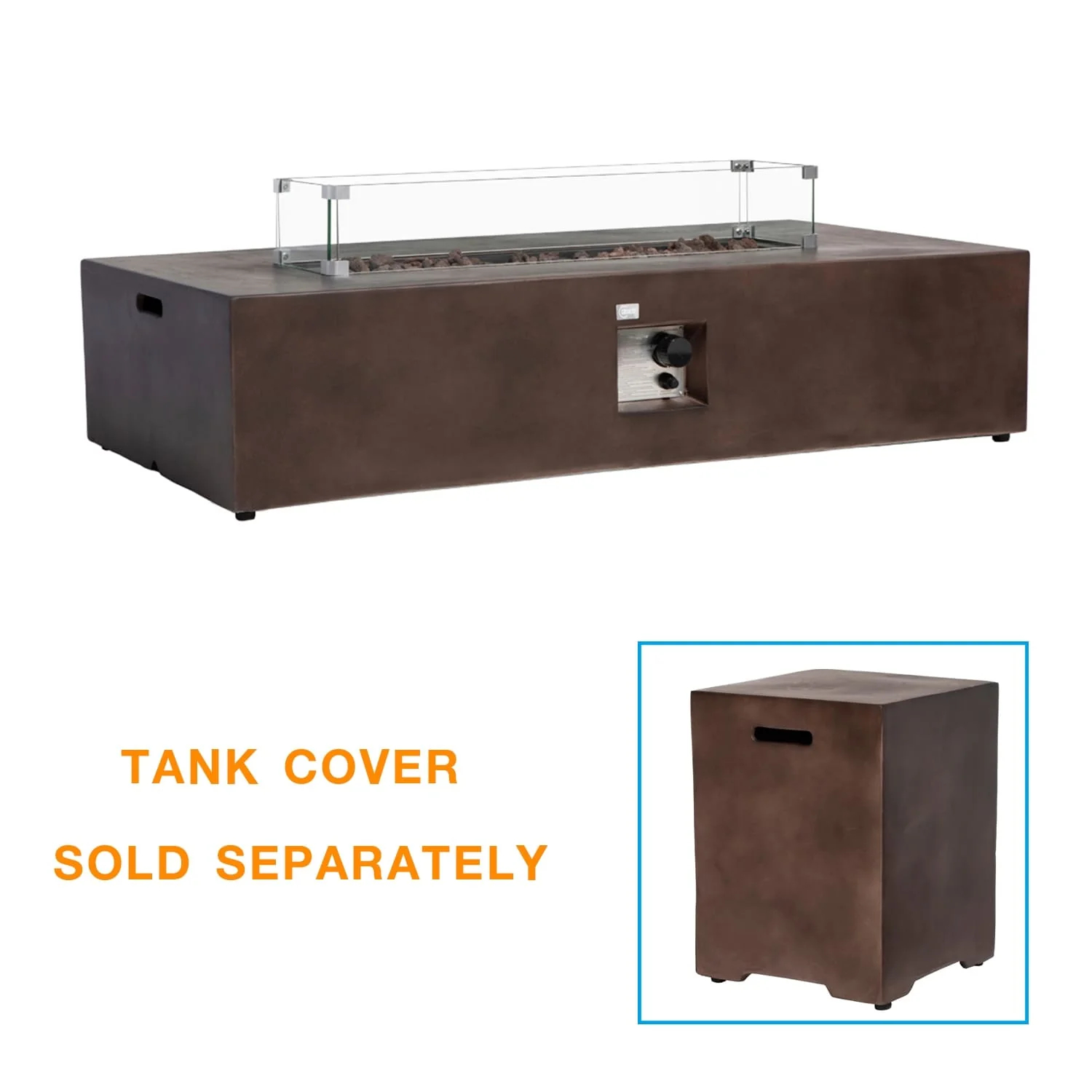 COSIEST Outdoor Rectangular Propane Fire Pit with Wind Guard, Tank Cover Table