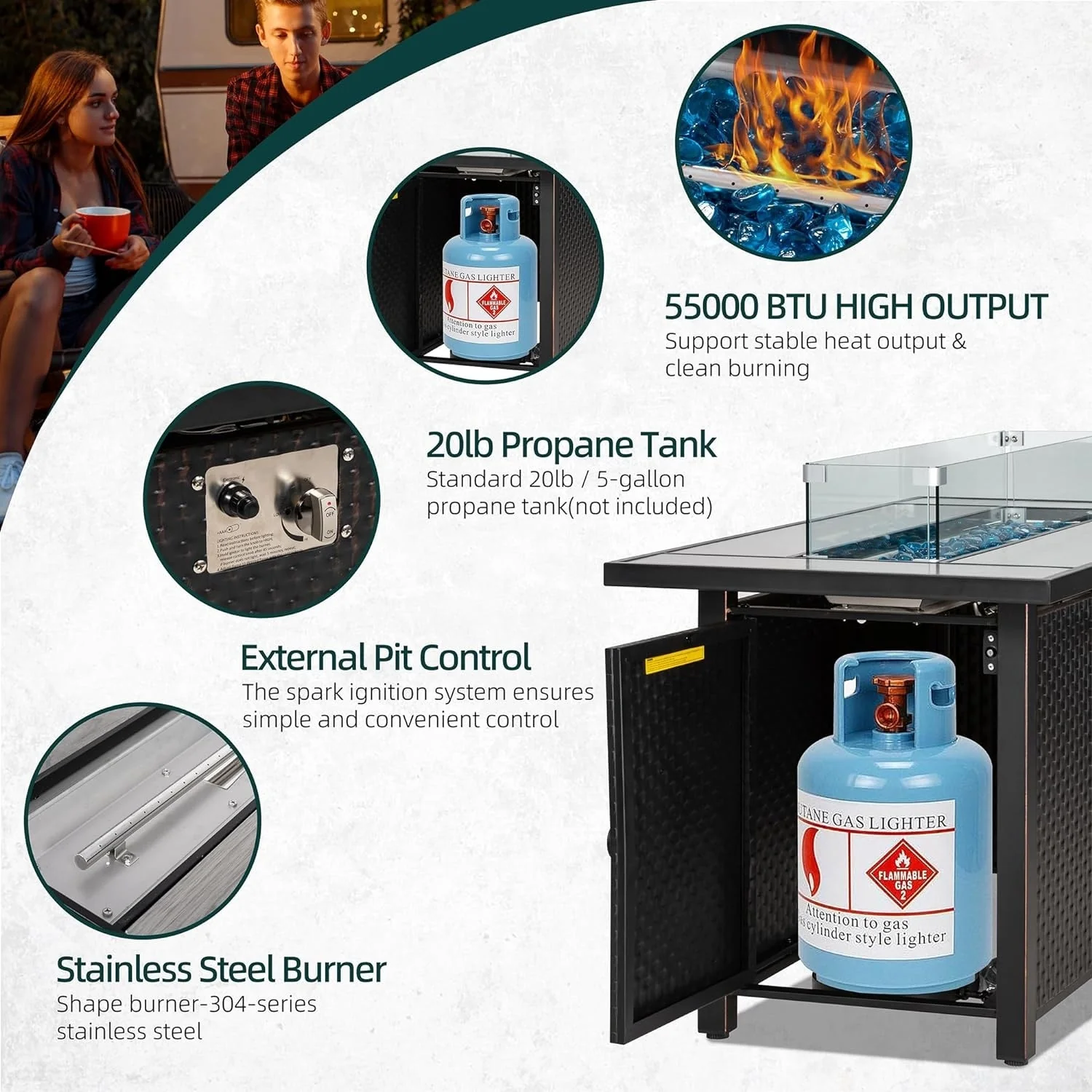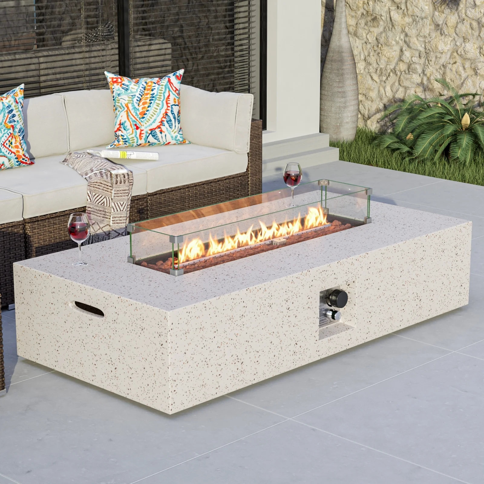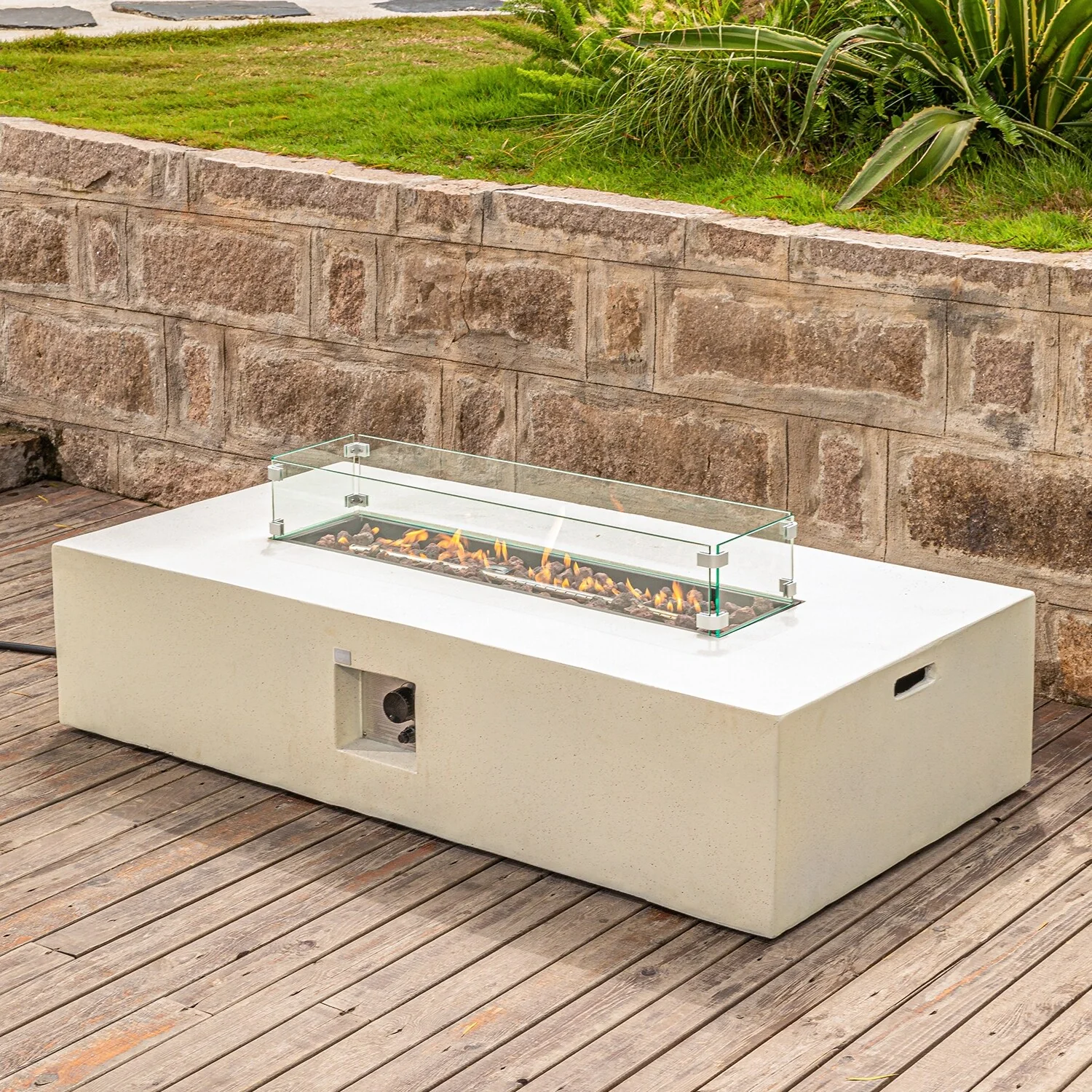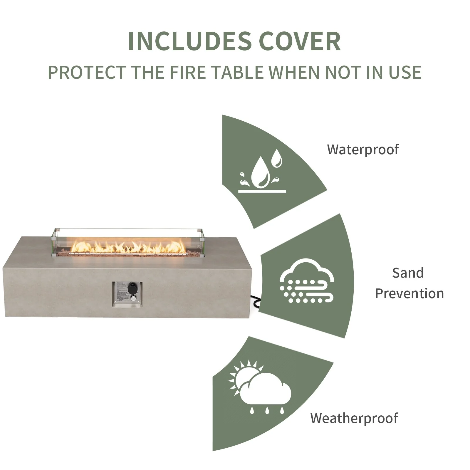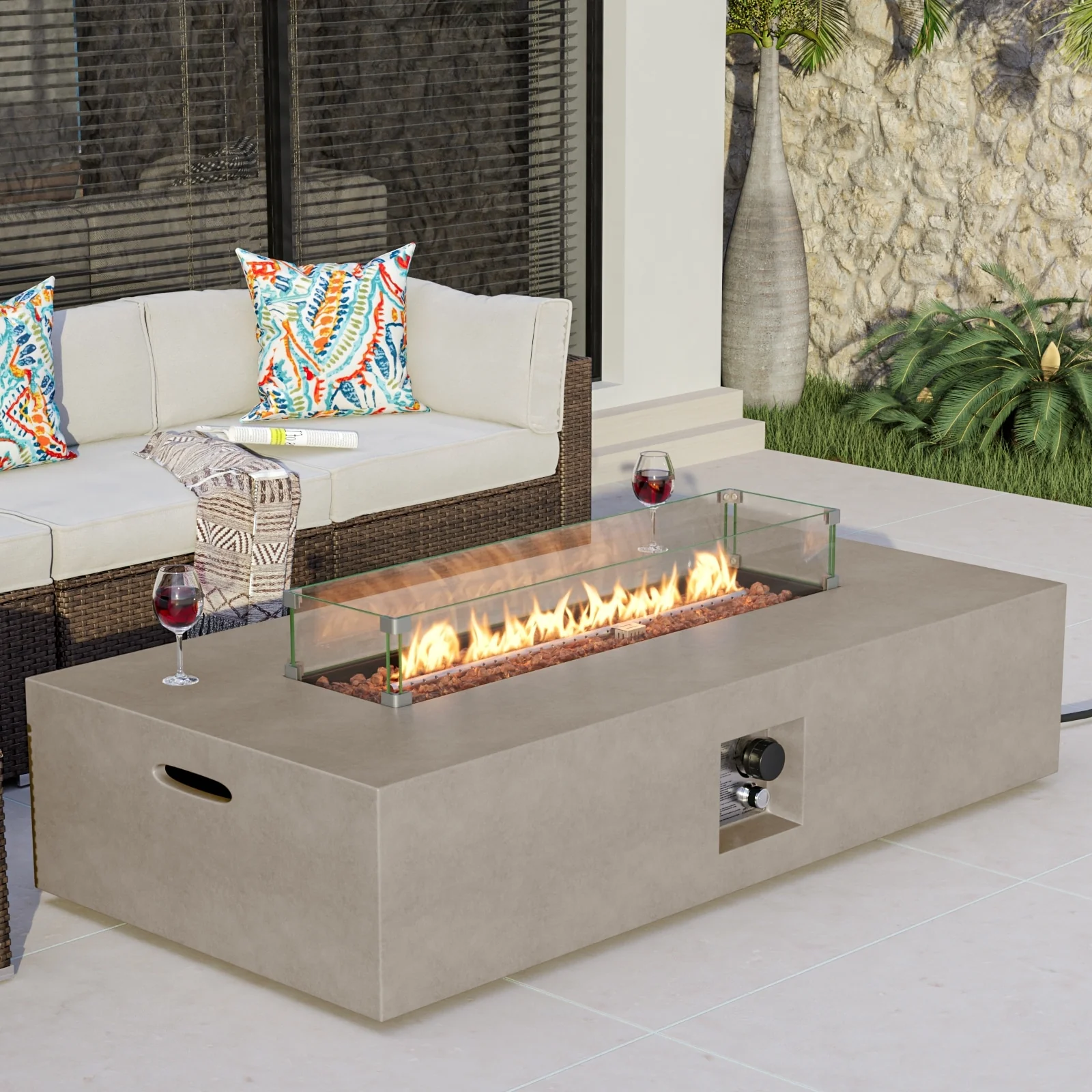 COSIEST Outdoor Rectangular Propane Fire Pit with Wind Guard, Tank Cover Table
