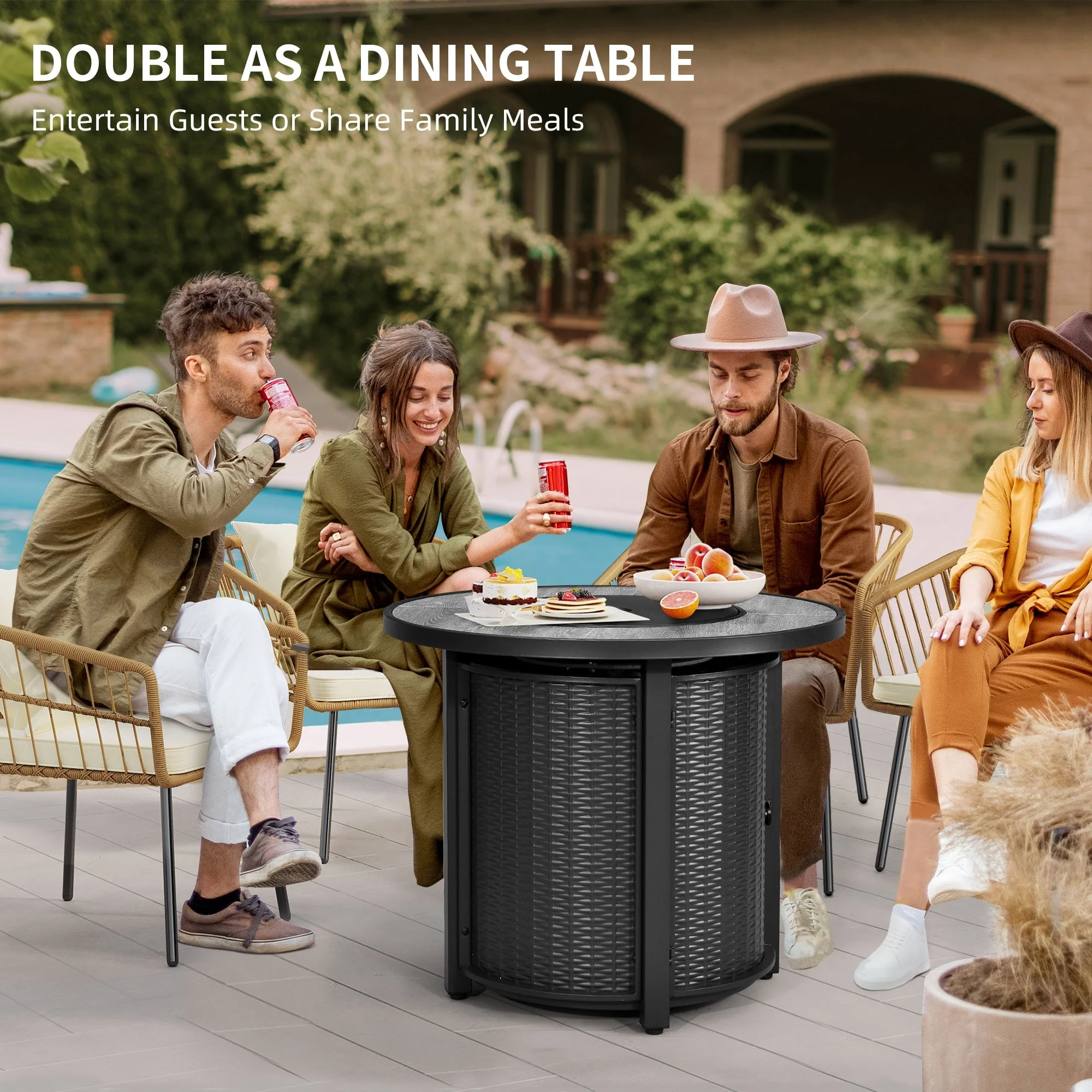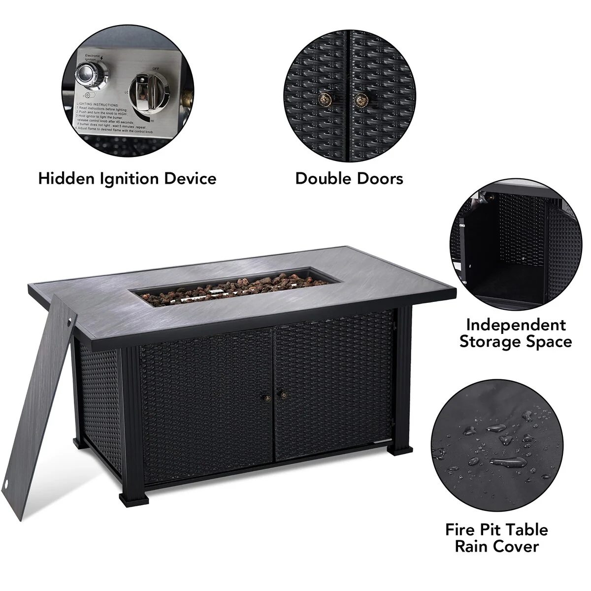 Outdoor Propane Fire Pit Table Set 40000 BTU Rattan Patio Heater with Lid and Tank Holder Ceramic Tile Top for Deck Backyard