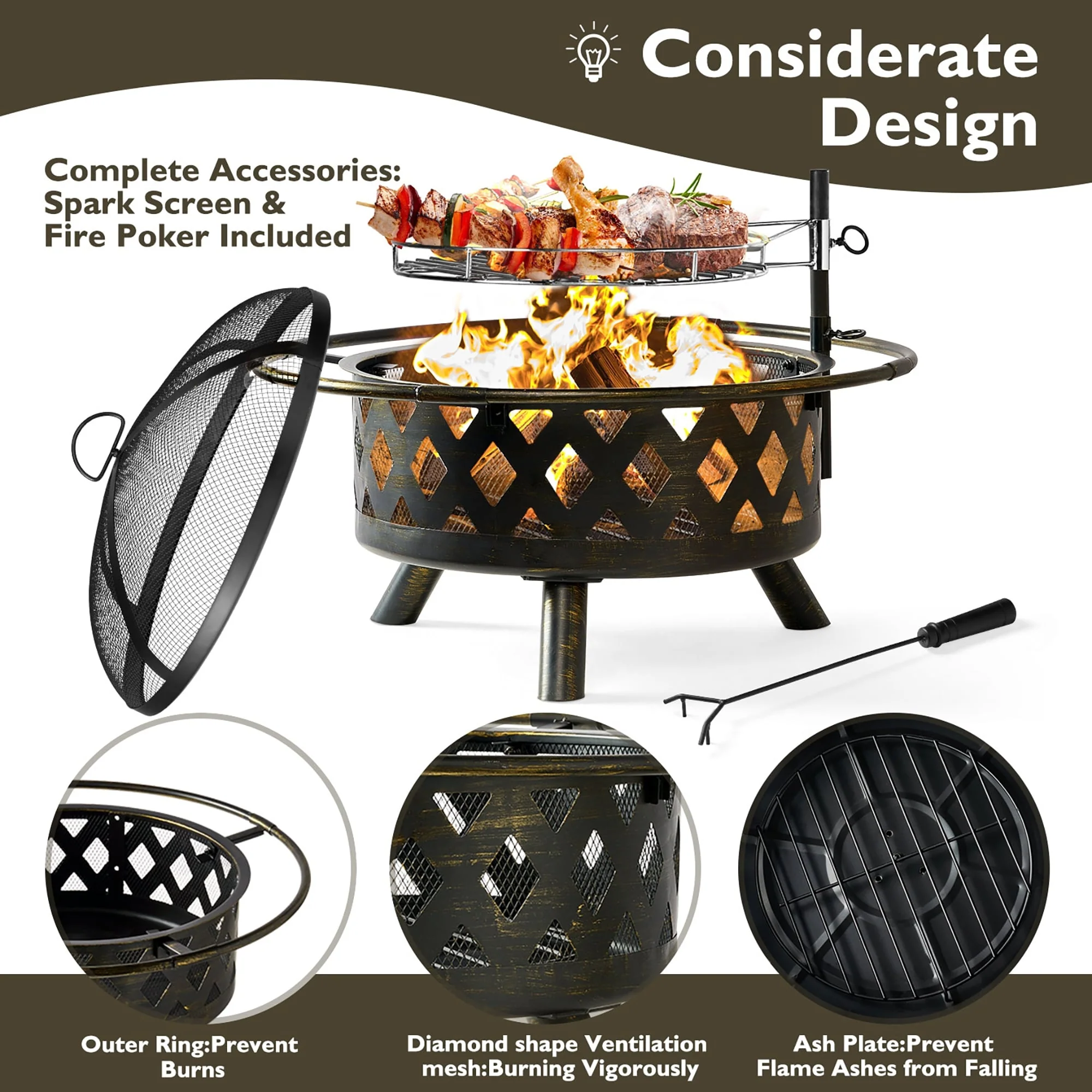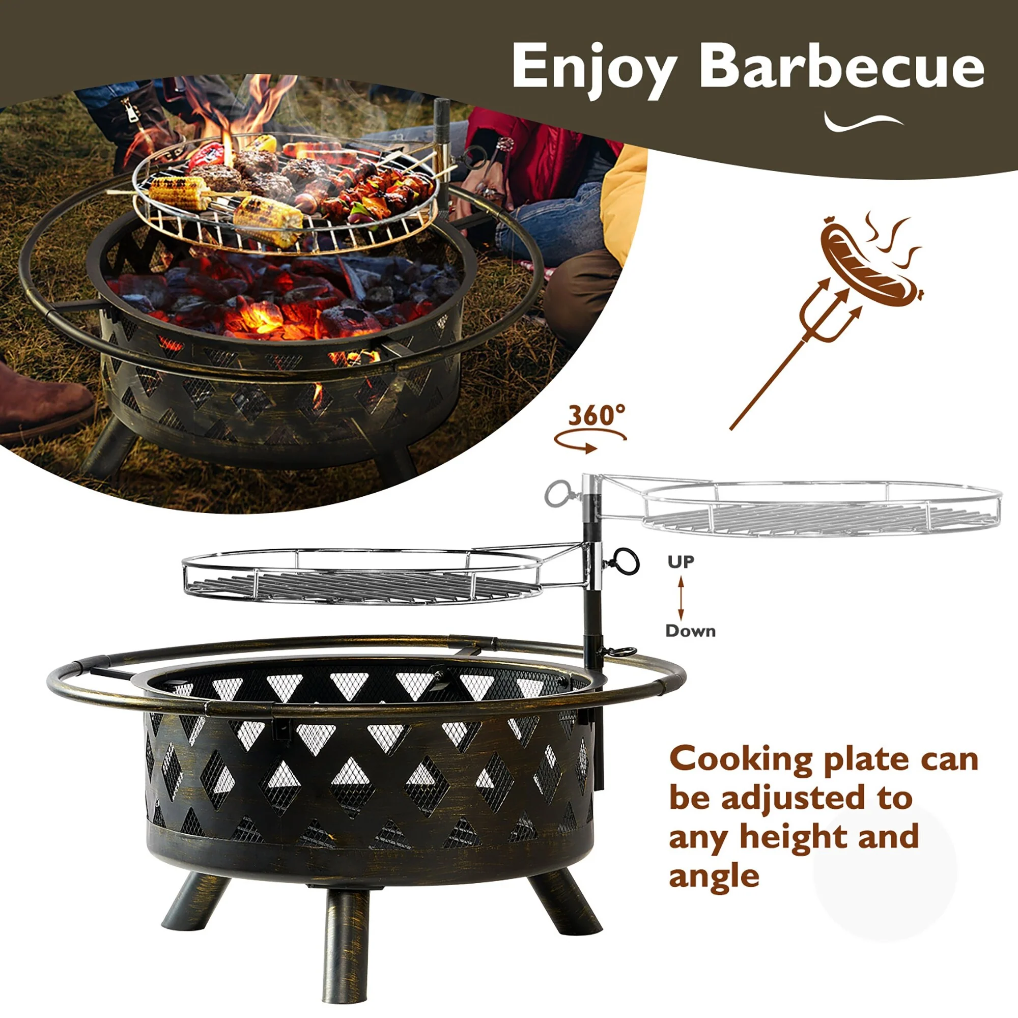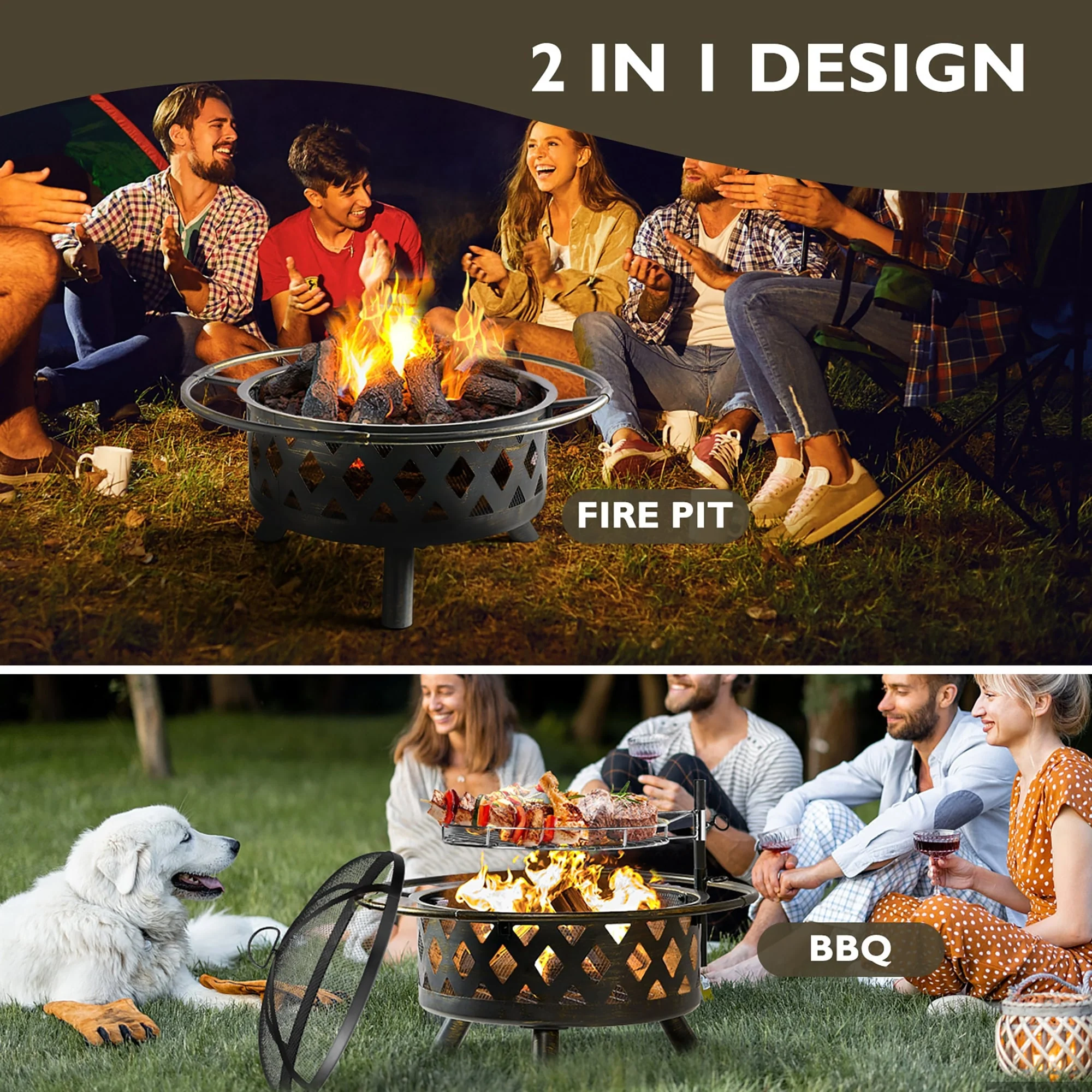 Aoxun 2 in 1 Fire Pit 30in with Grill Outdoor Wood Burning