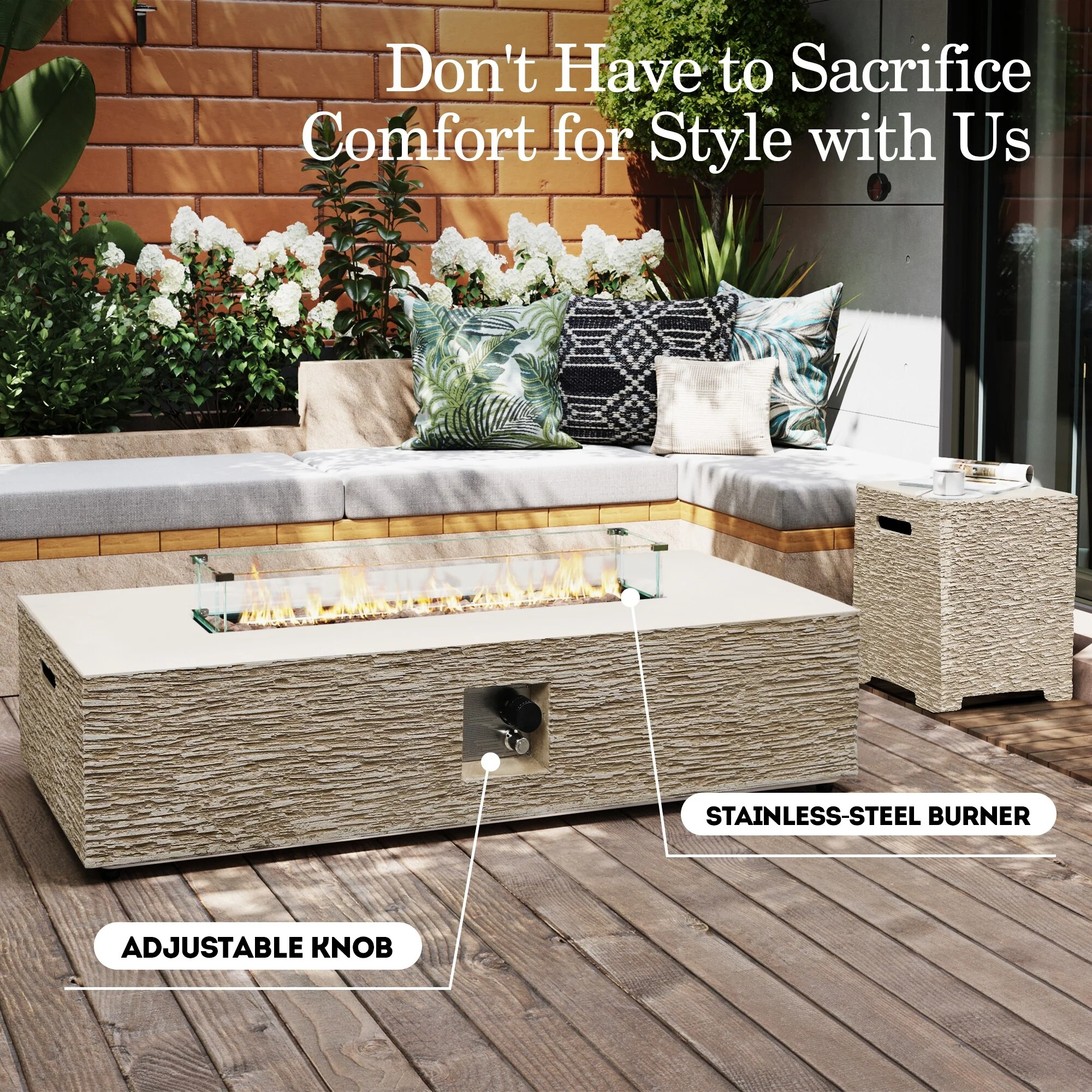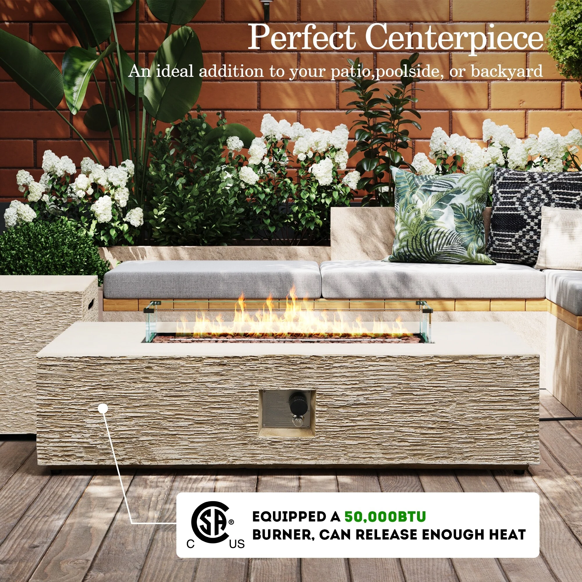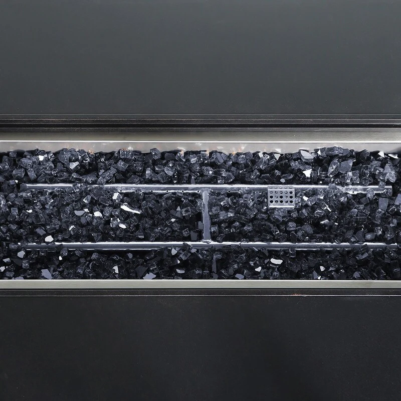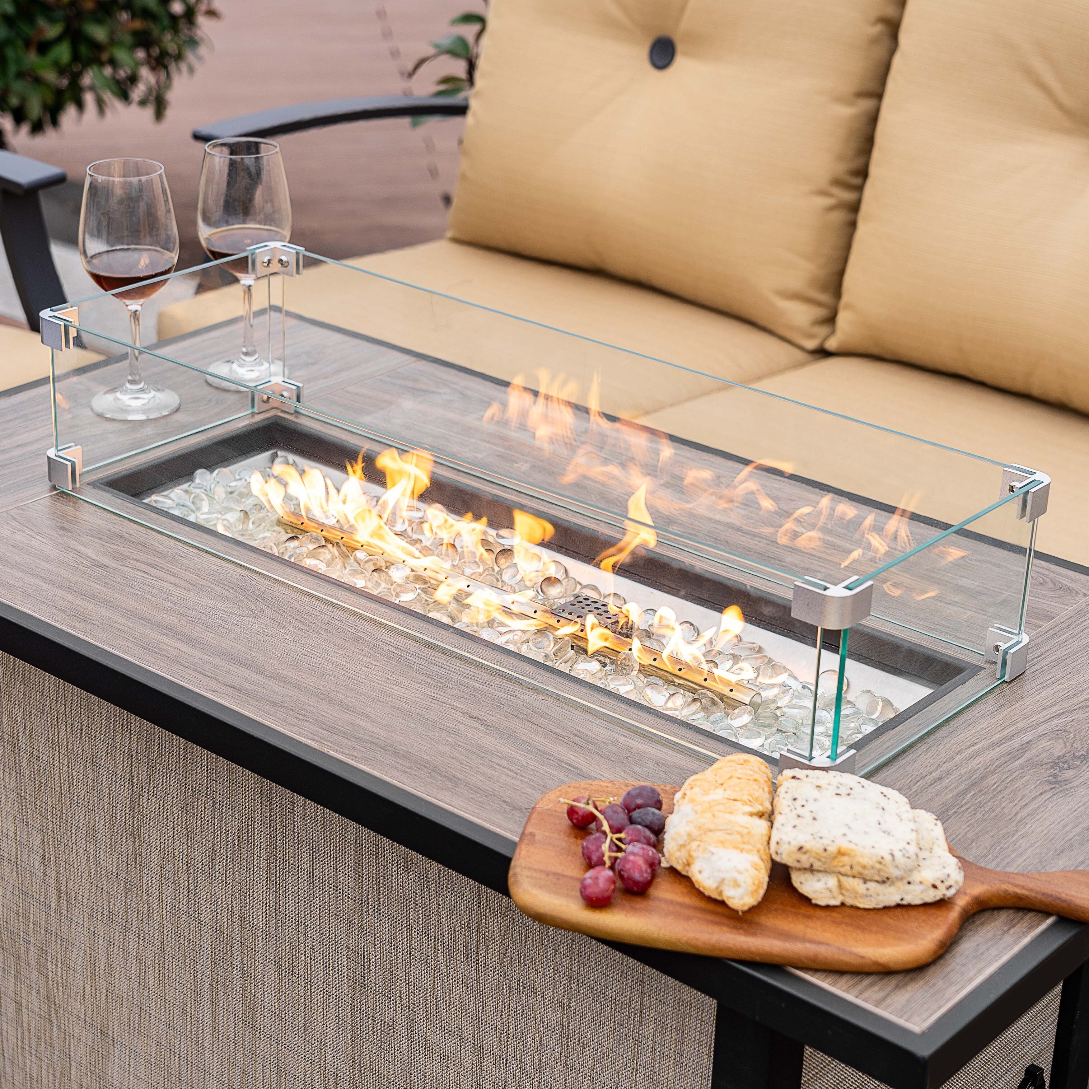 50,000 BTU Adjustable Height Aluminum Propane Fire Pit Table with Faux Stone Glass Top and Wind Guard