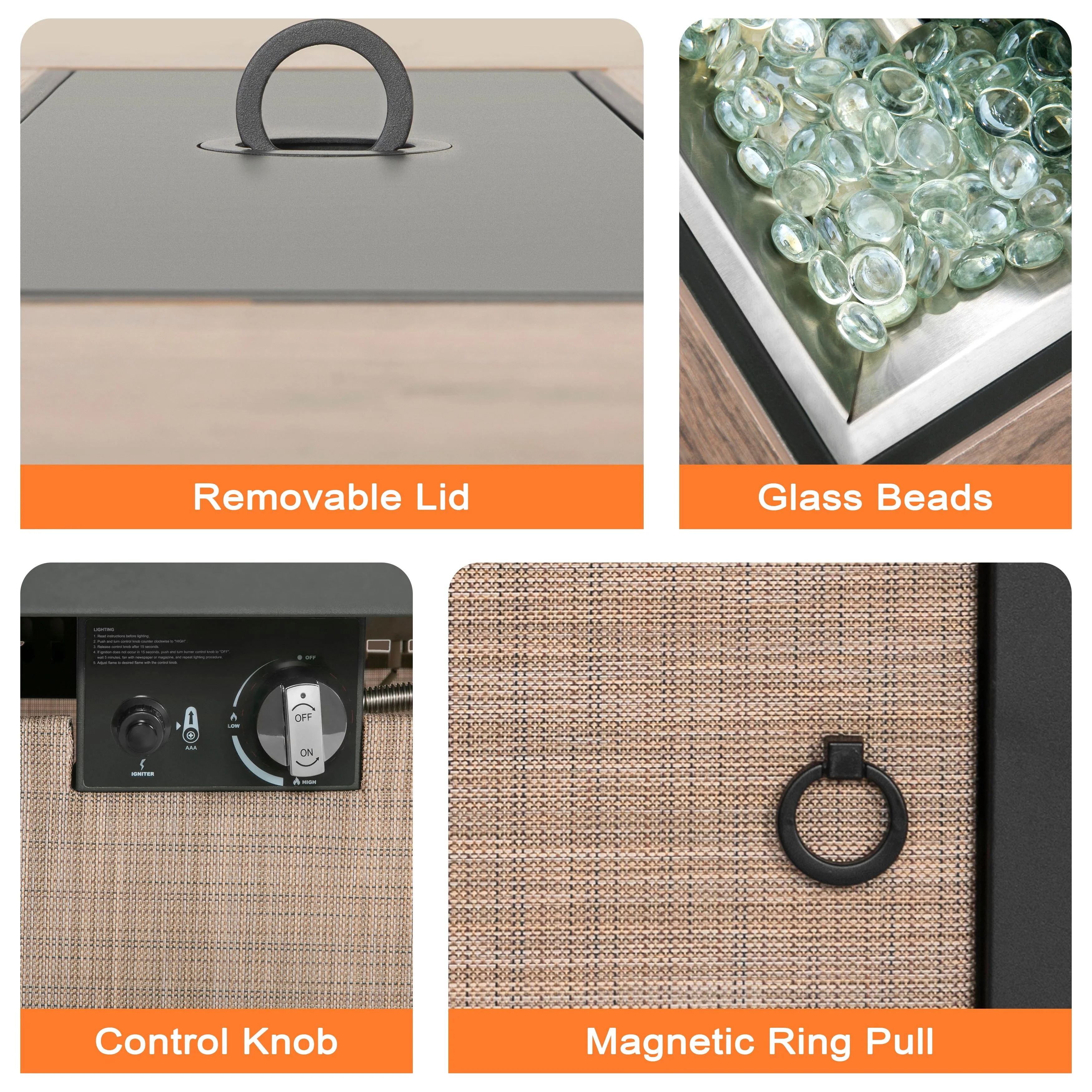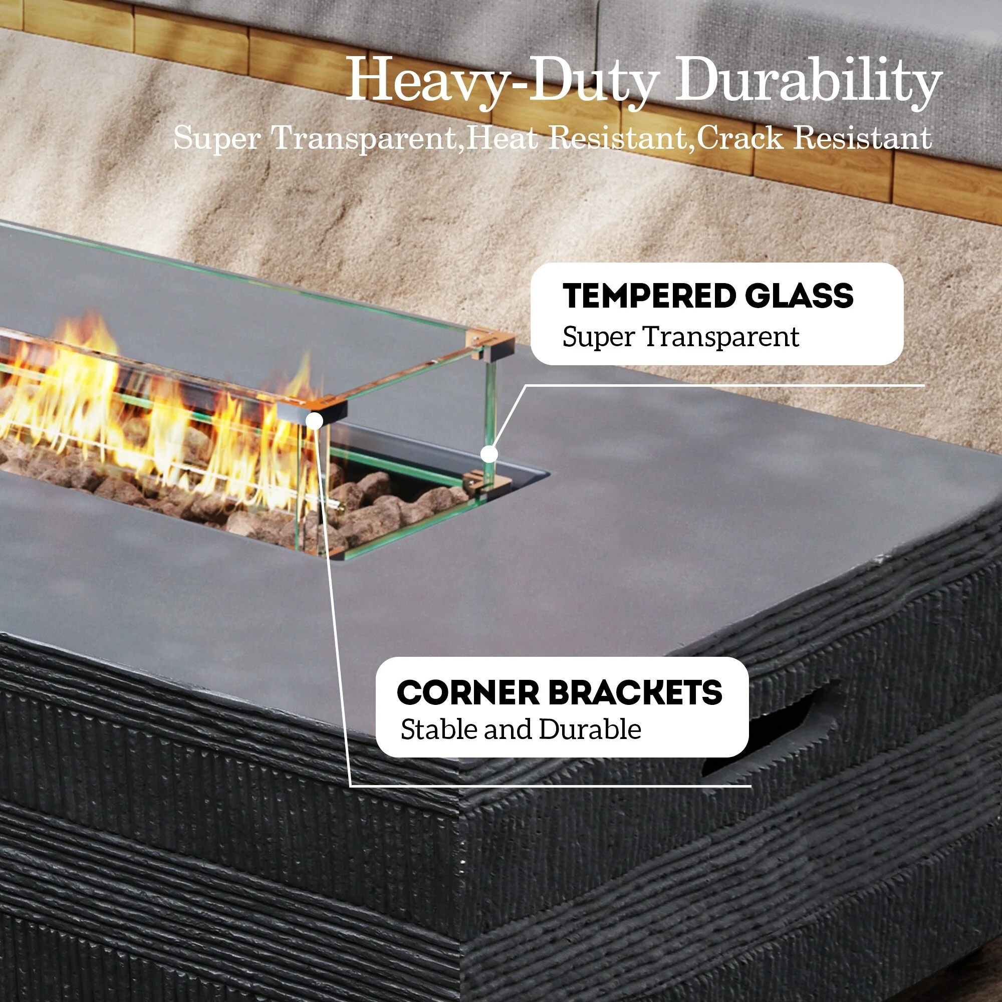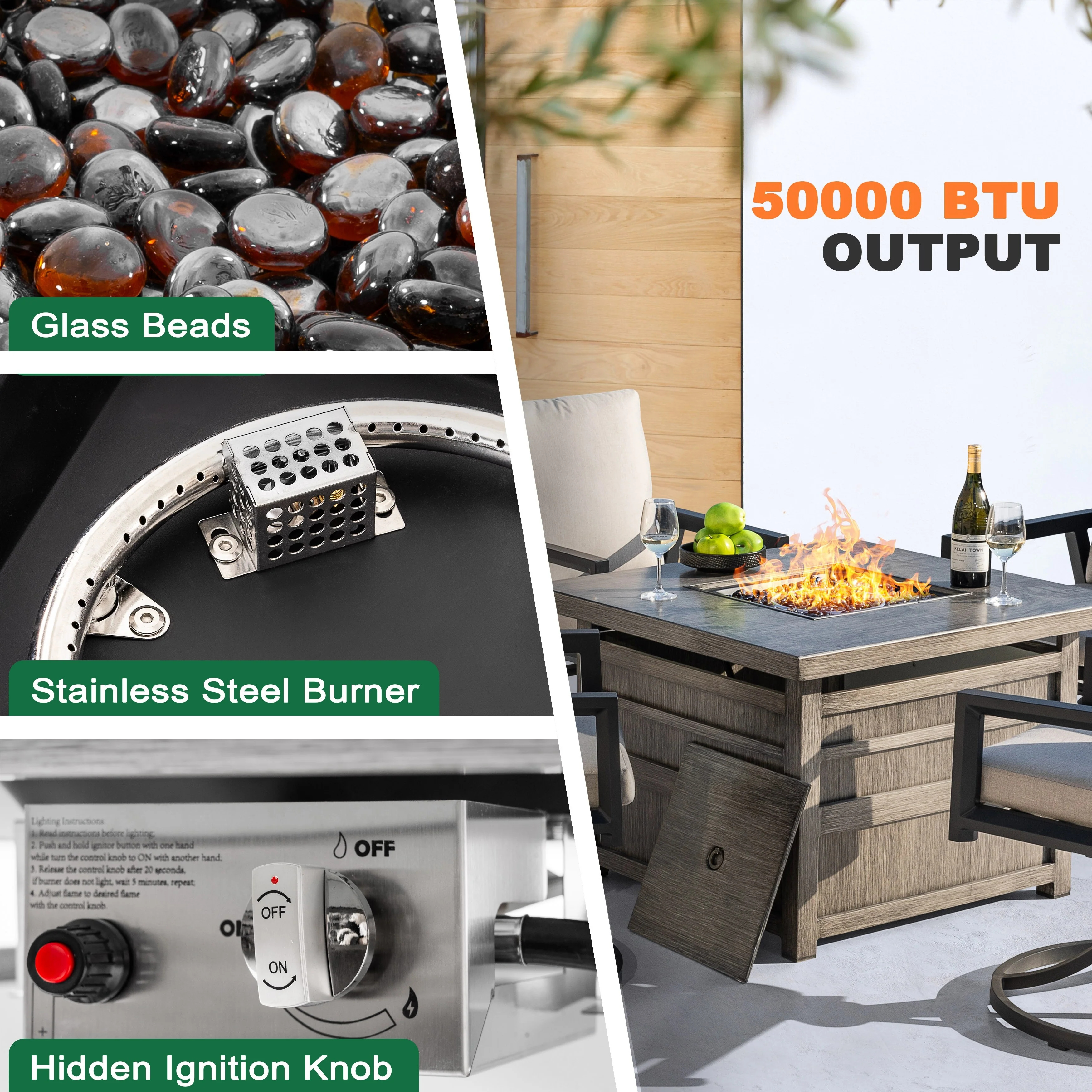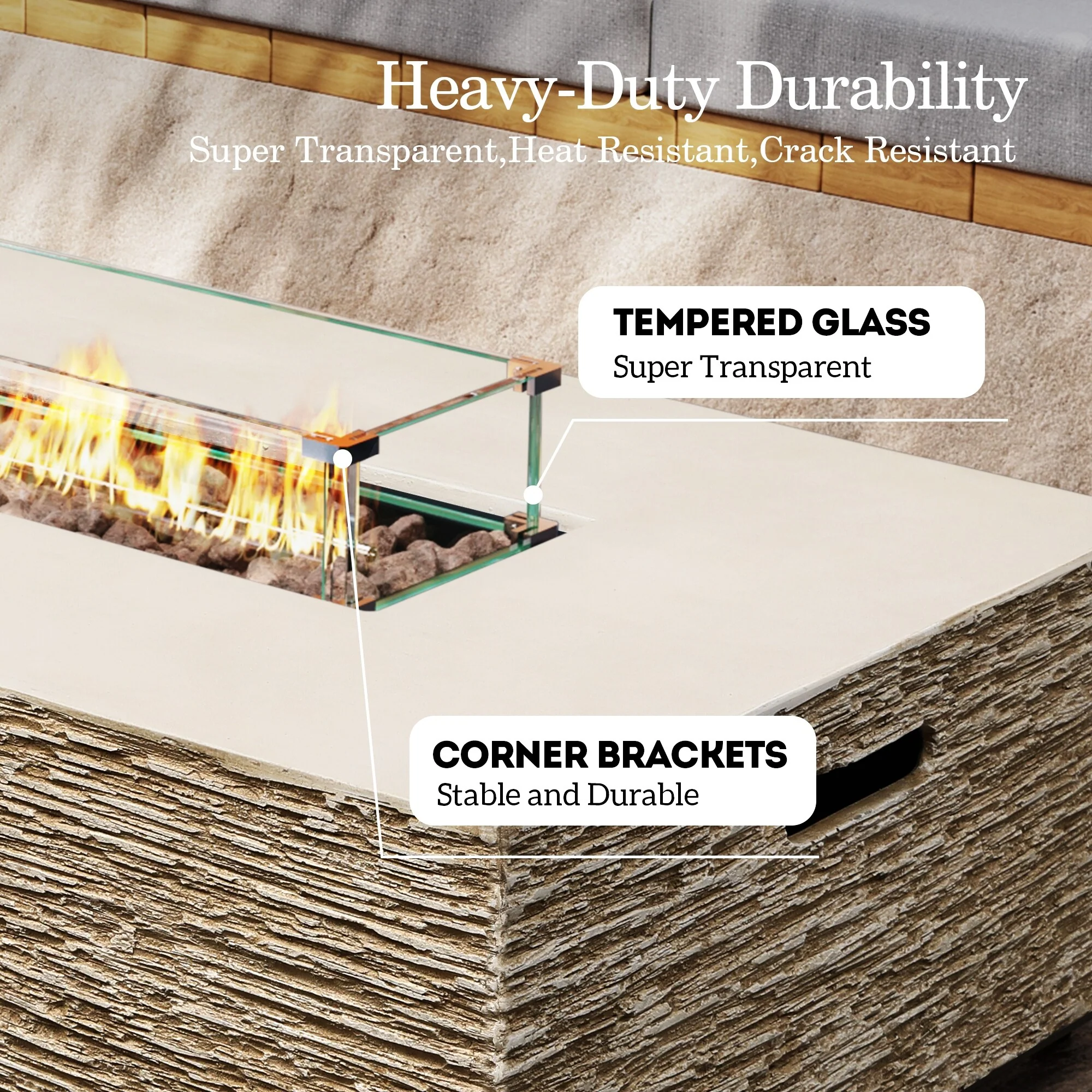 50,000 BTU Adjustable Height Aluminum Propane Fire Pit Table with Faux Stone Glass Top and Wind Guard