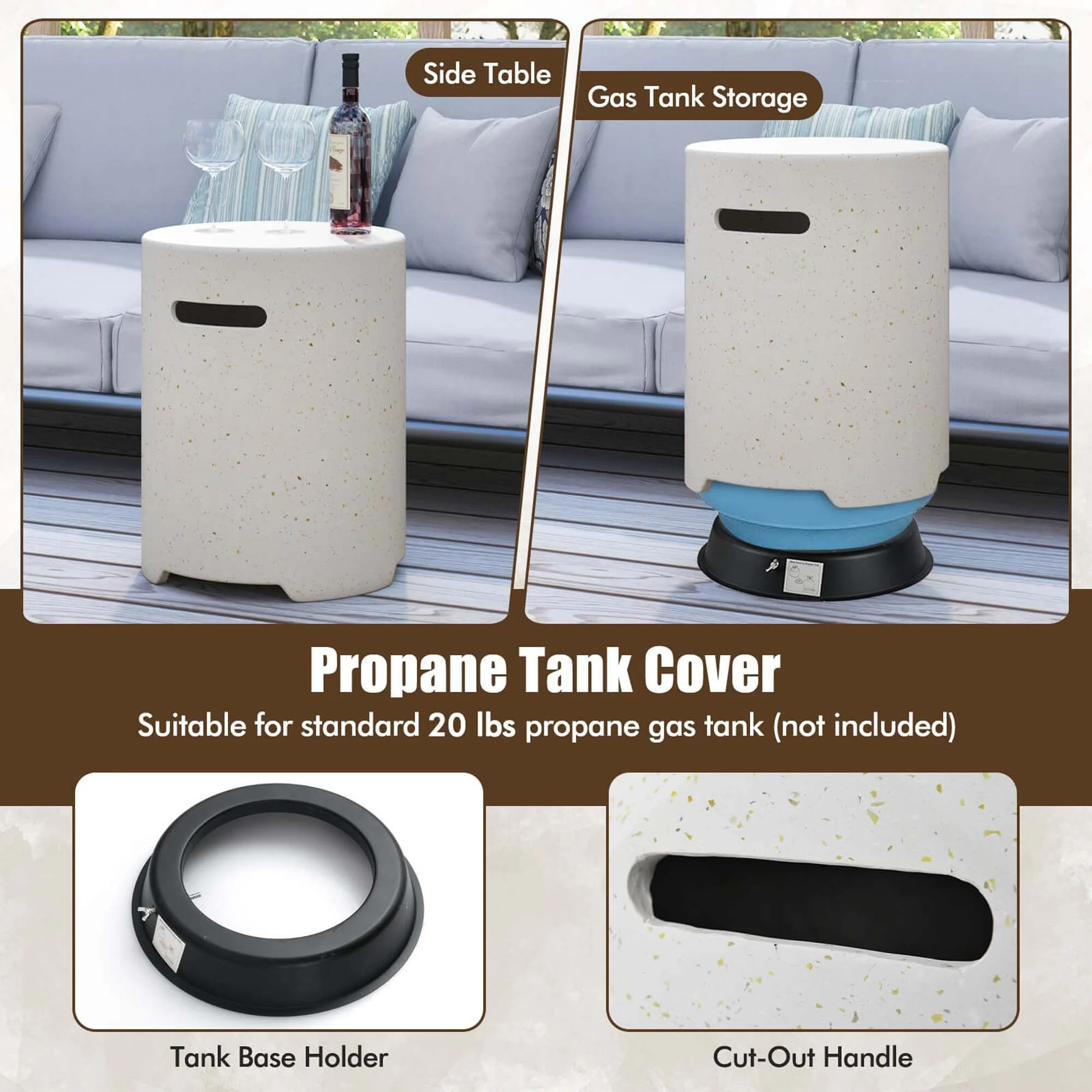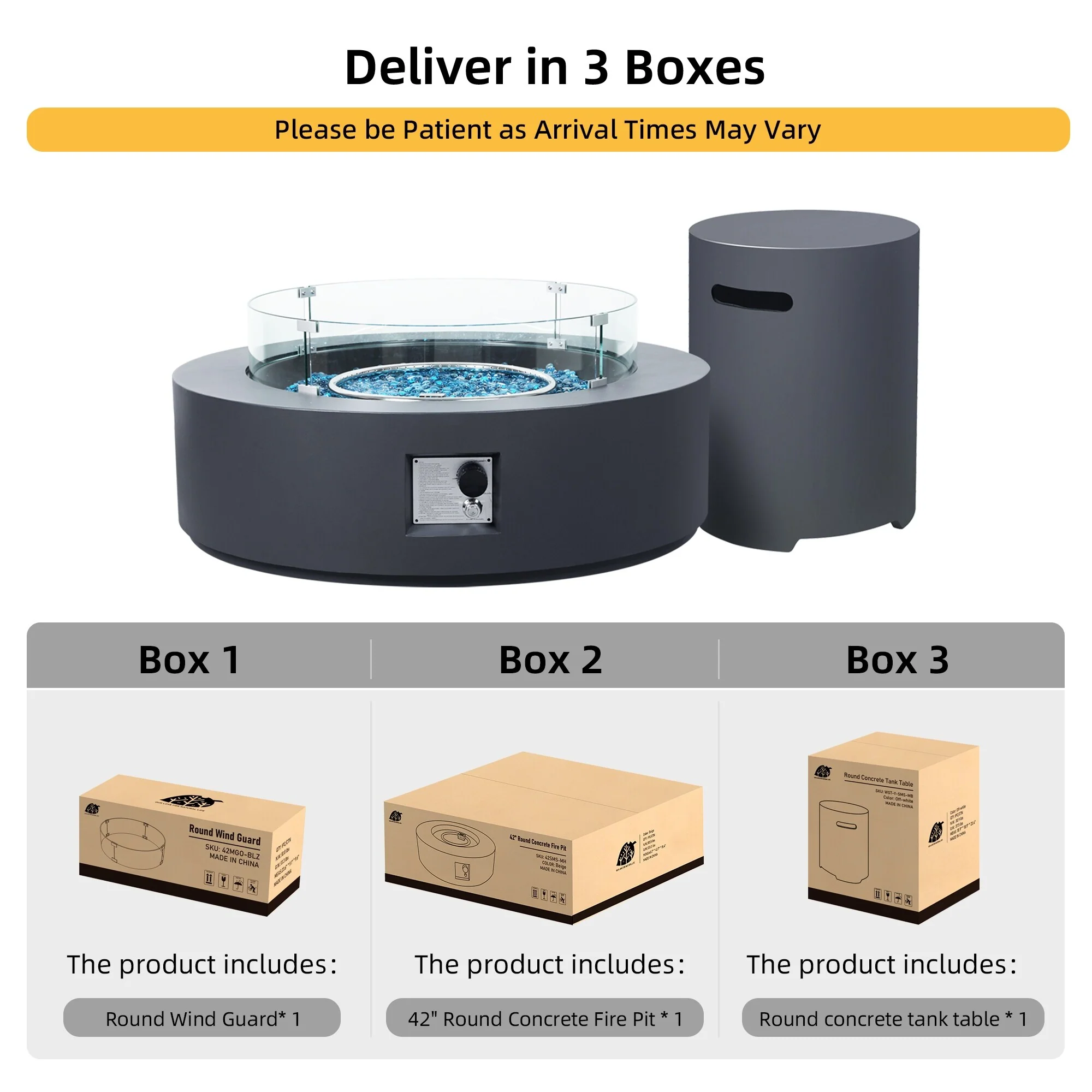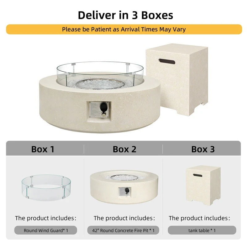Patio Watcher 42'' Round Patio Propane Gas Concrete Fire Pit Table, 50000 BTU with Wind Guard and Gas Tank Cover