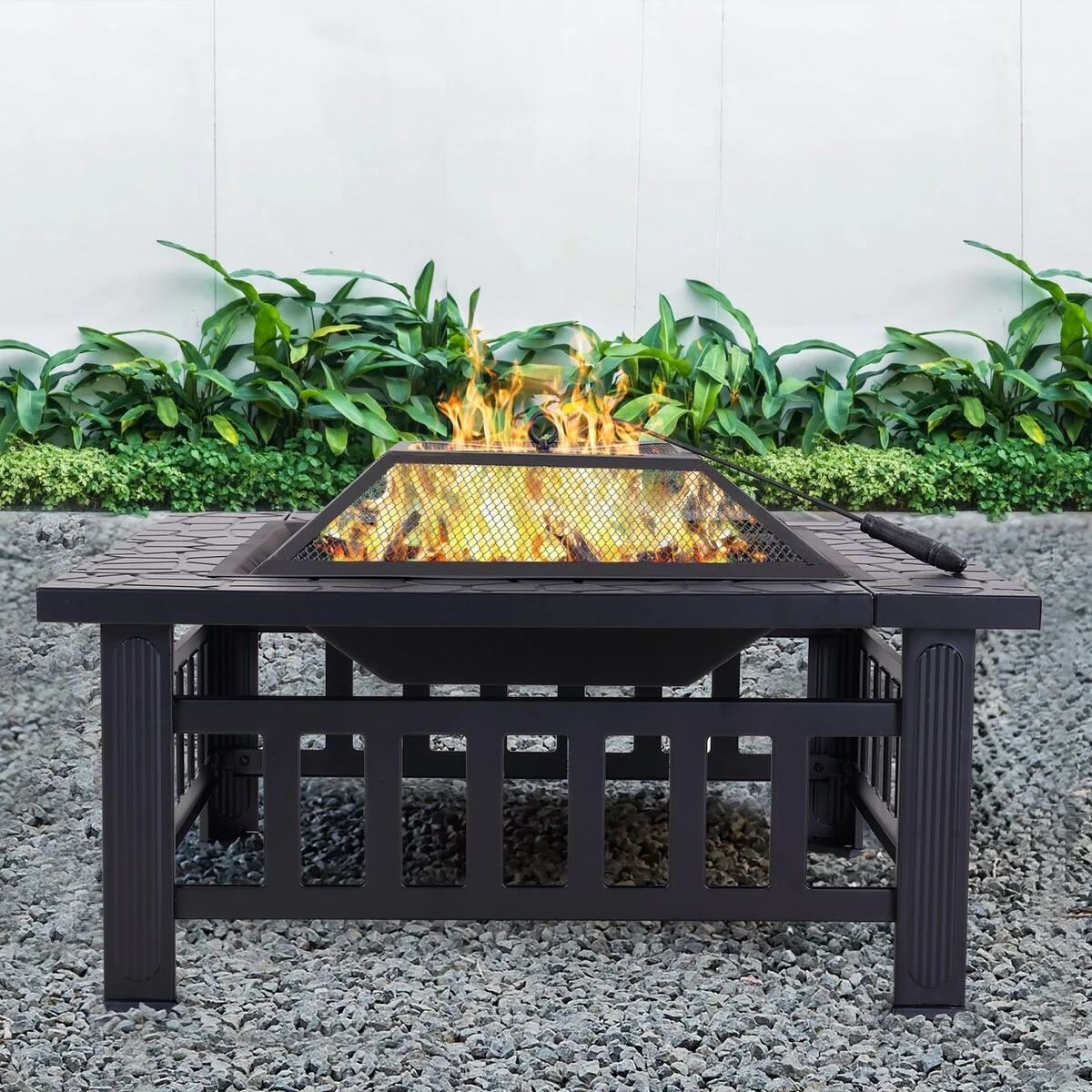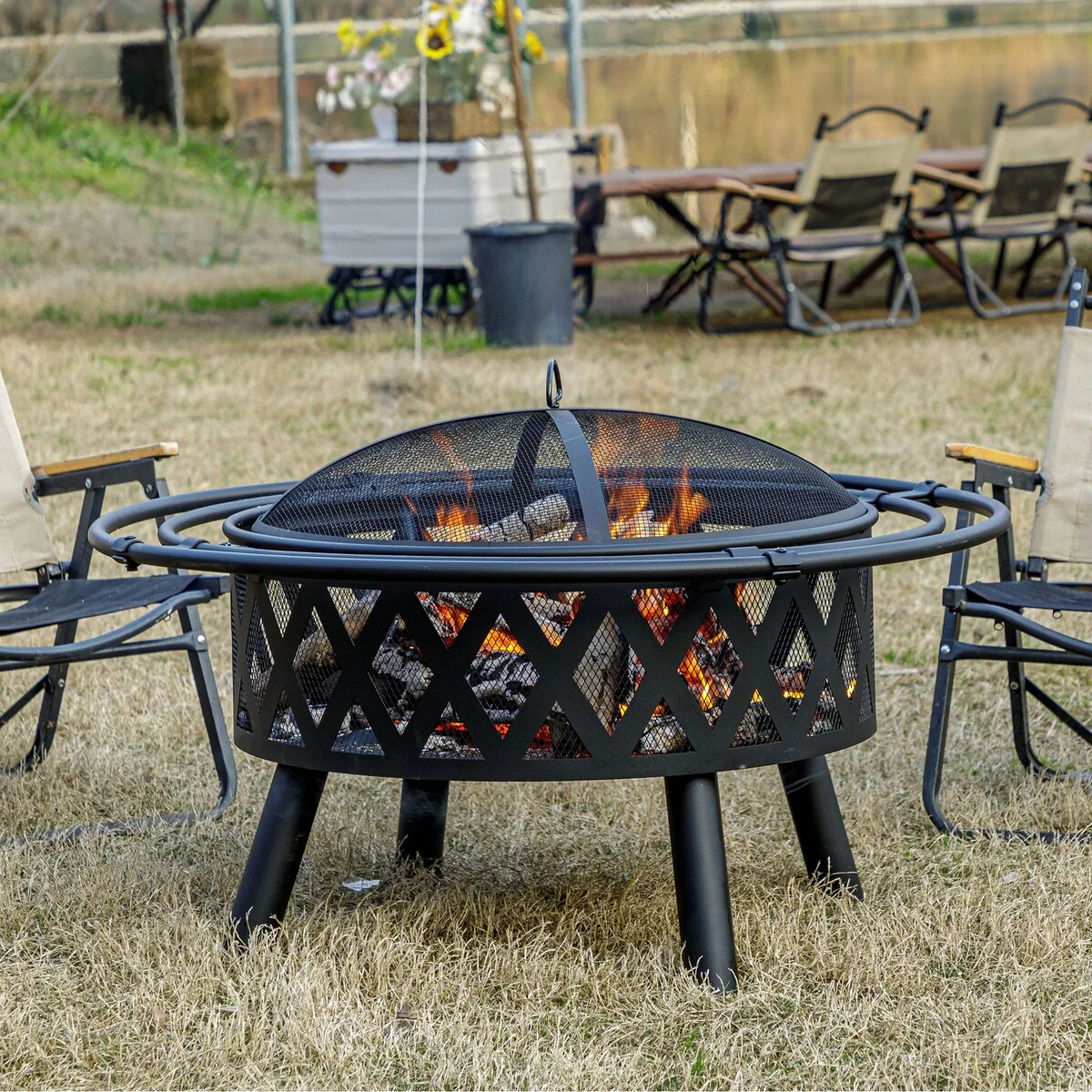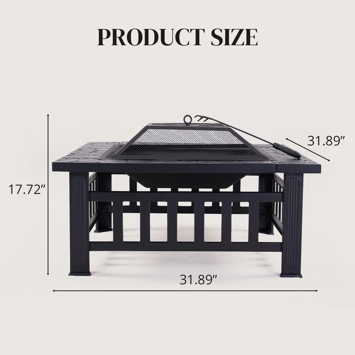 32Inch Outdoor�C Wood Burning Fire Pit with Mesh Lid and Fire Picker, Outside Small Fire Pits for Backyard, Porch, Deck, BBQ
