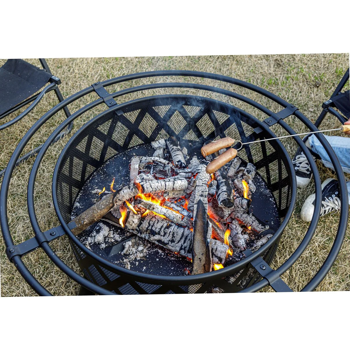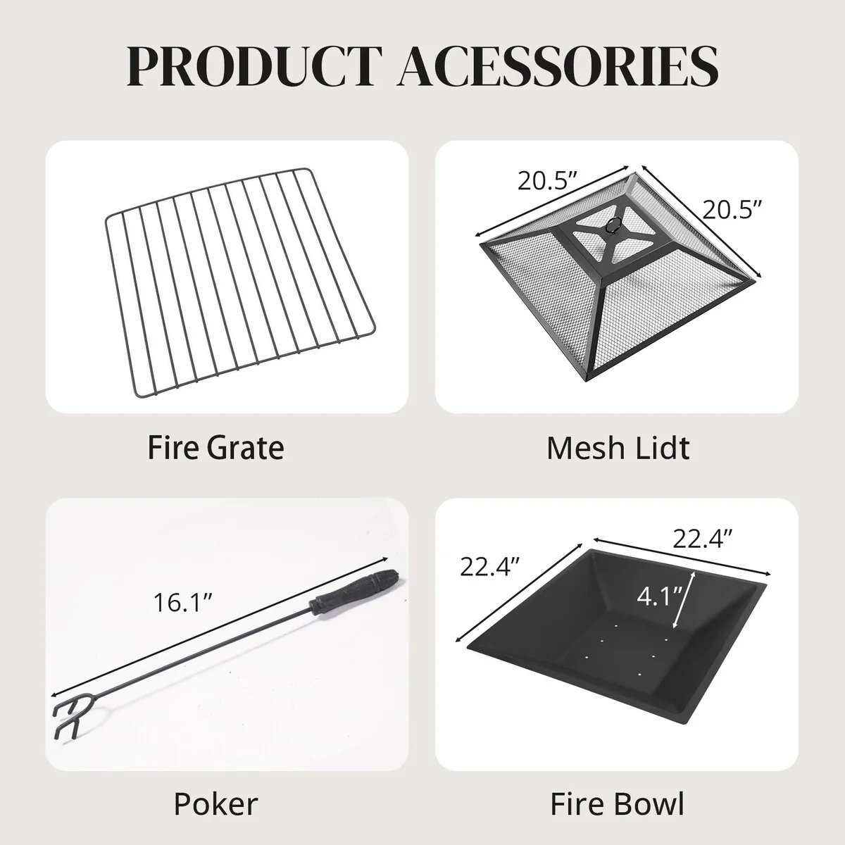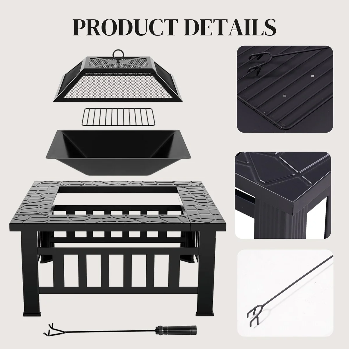 32Inch Outdoor�C Wood Burning Fire Pit with Mesh Lid and Fire Picker, Outside Small Fire Pits for Backyard, Porch, Deck, BBQ