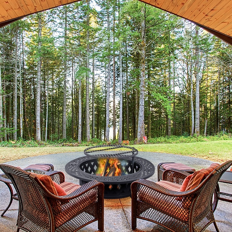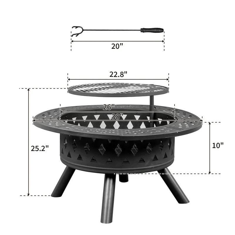 38"W x 25"H Round Iron Wood Burning Black Fire Pit Table with 20" Fire Poker - 38" W