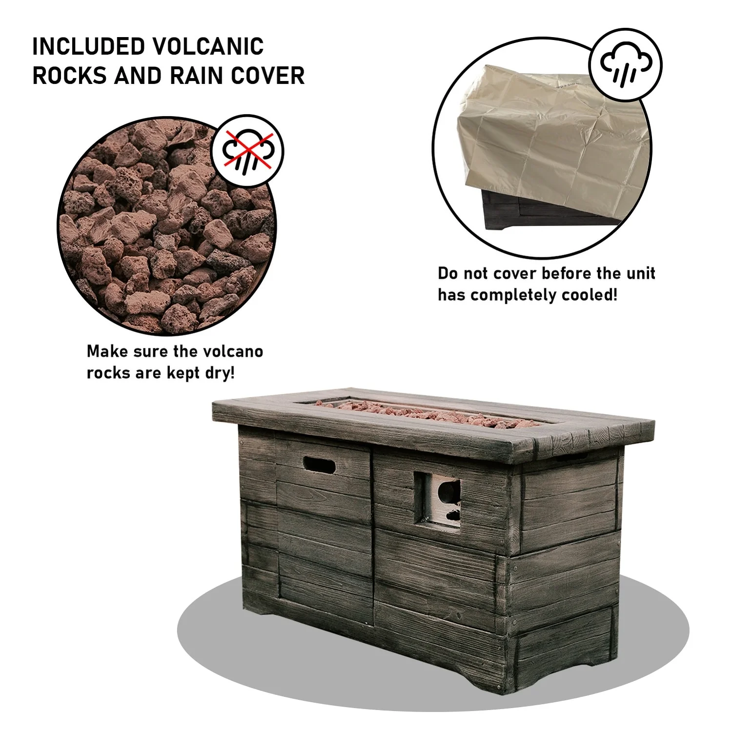XBrand 42.1"L Rectangular Black MgO/Metal Outdoor Propane Gas Smokeless Fire Pit Table with Volcanic Rocks & Rain Cover