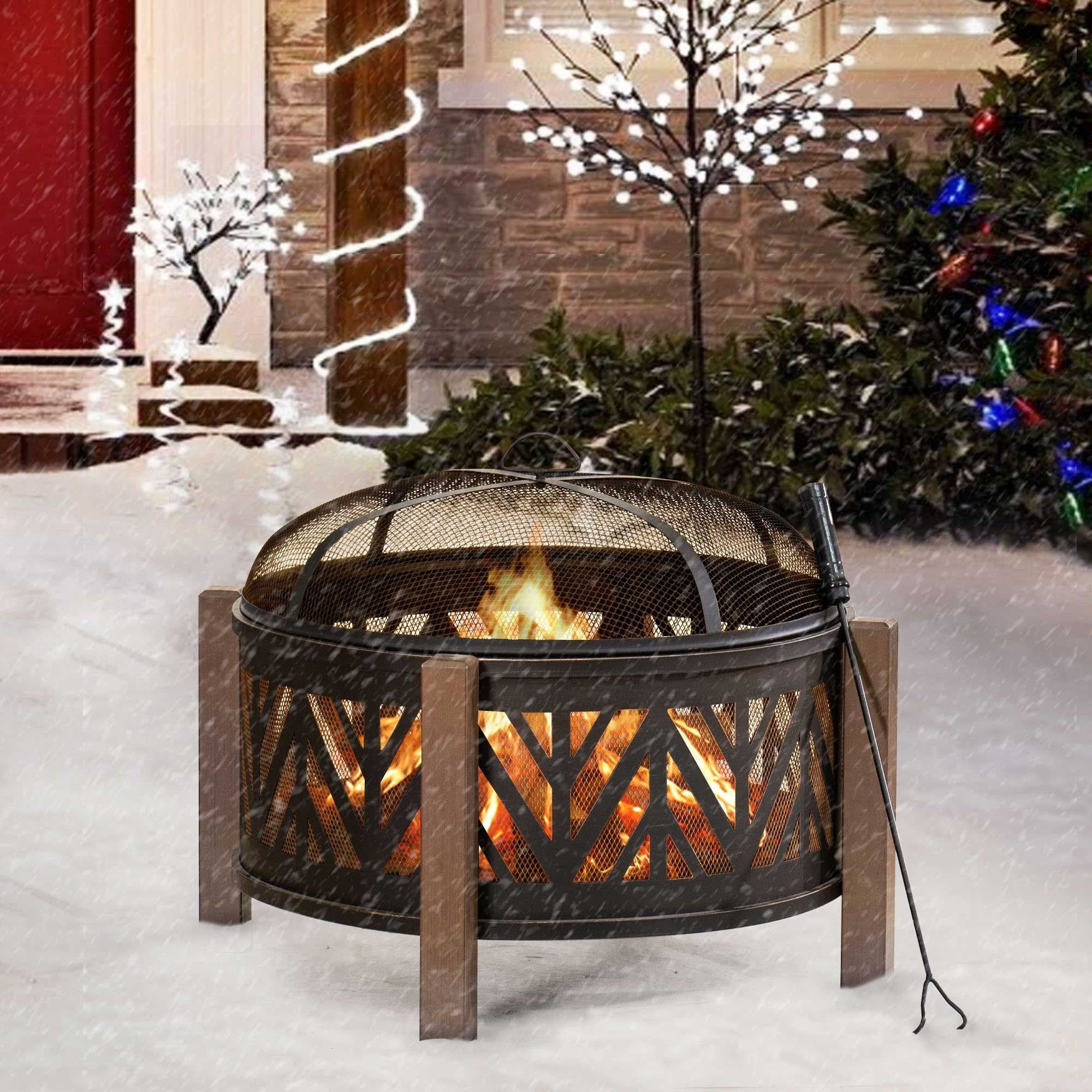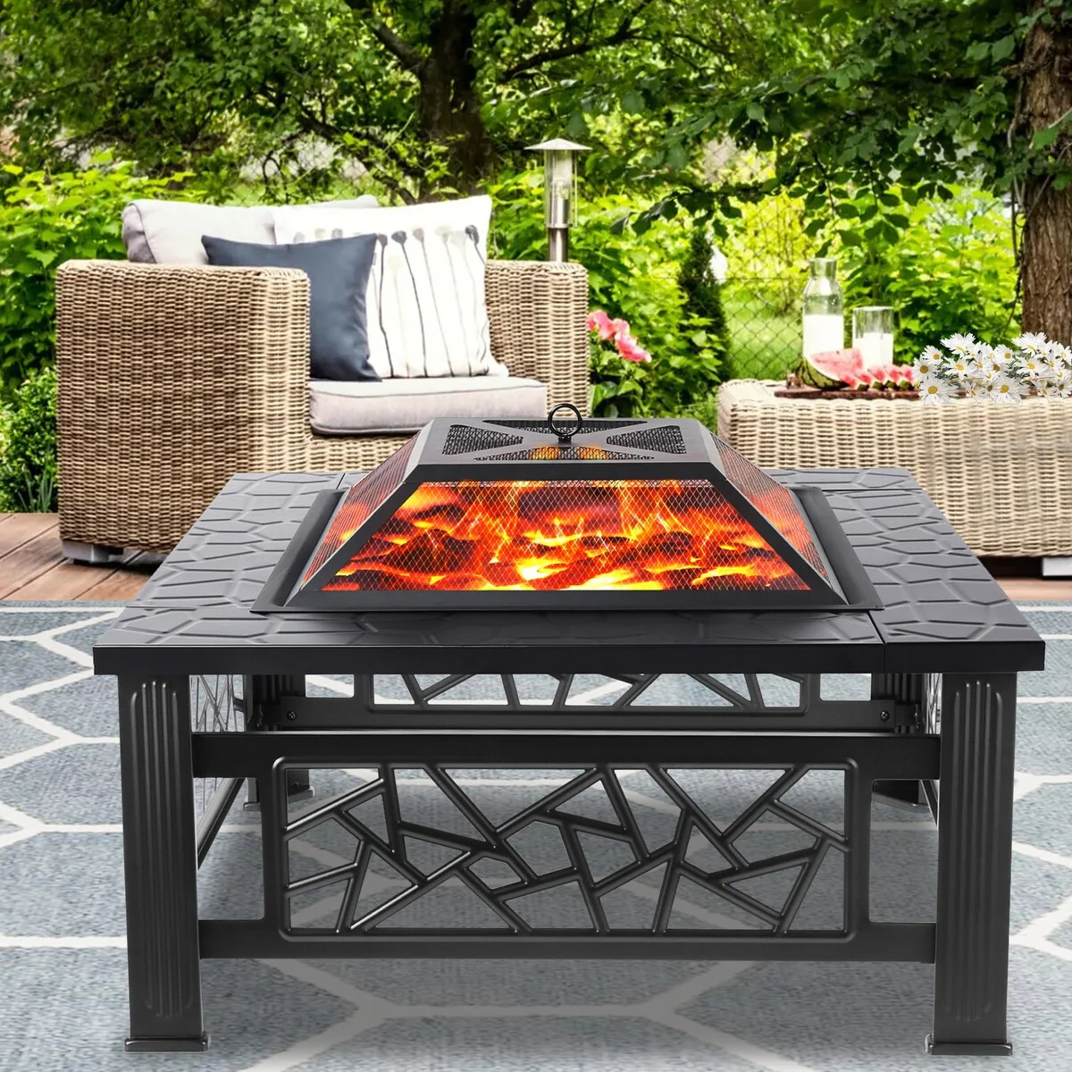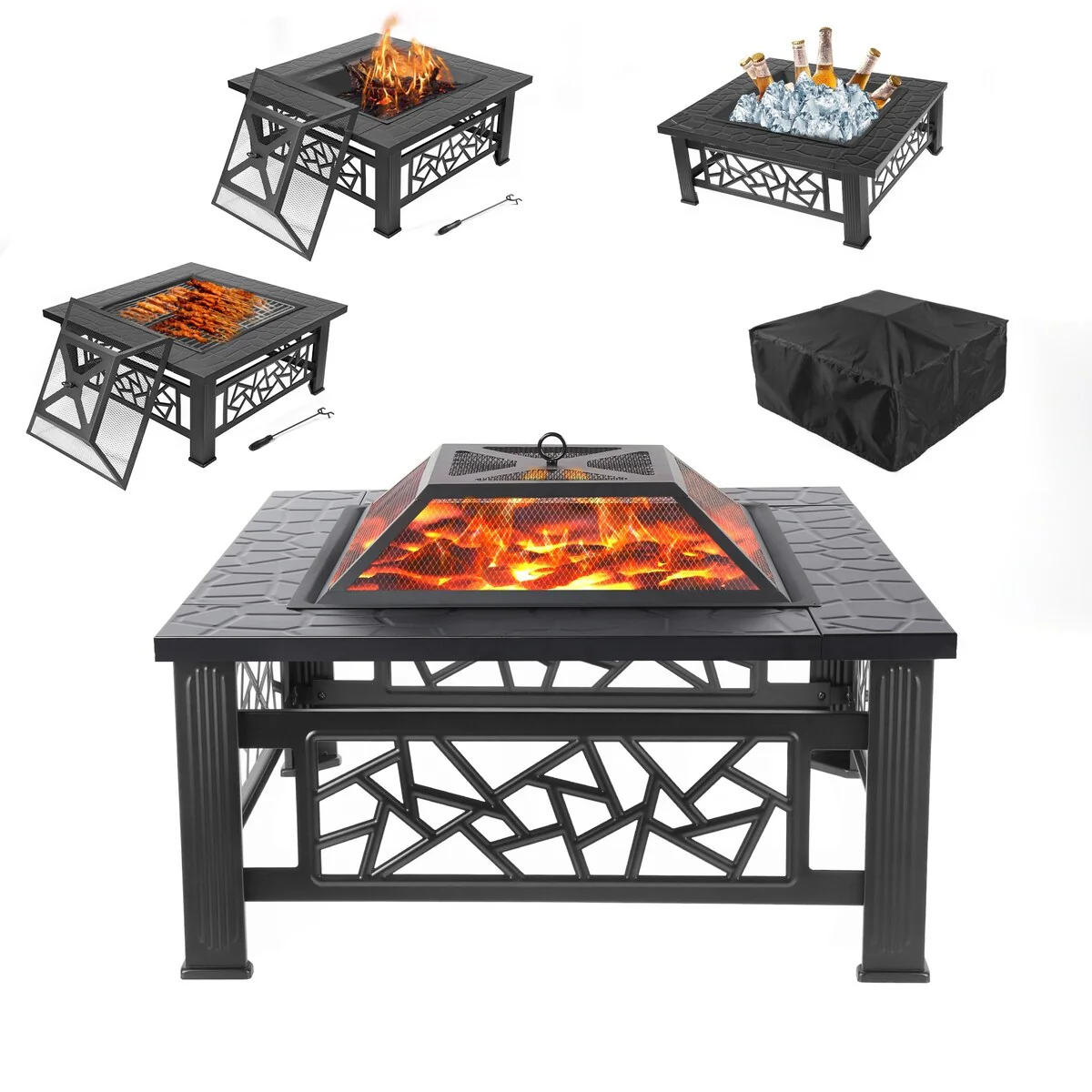 32" Wood Burning Fire Pit,Outdoor Fire Pit Table with Screen Lid, Poker,BBQ Net, Food Clip & Cover - 32"Wx32"Wx14.3"H