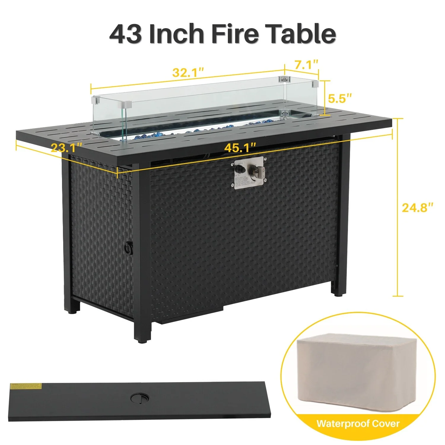 45 inch Outdoor Propane Fire Pit 50,000 BTU Gas Fire Pit Table with Lid, Glass Wind Guard, Rectangle Gas Firepit Table
